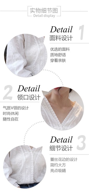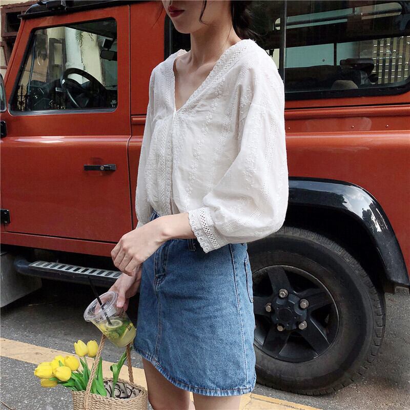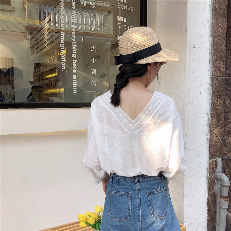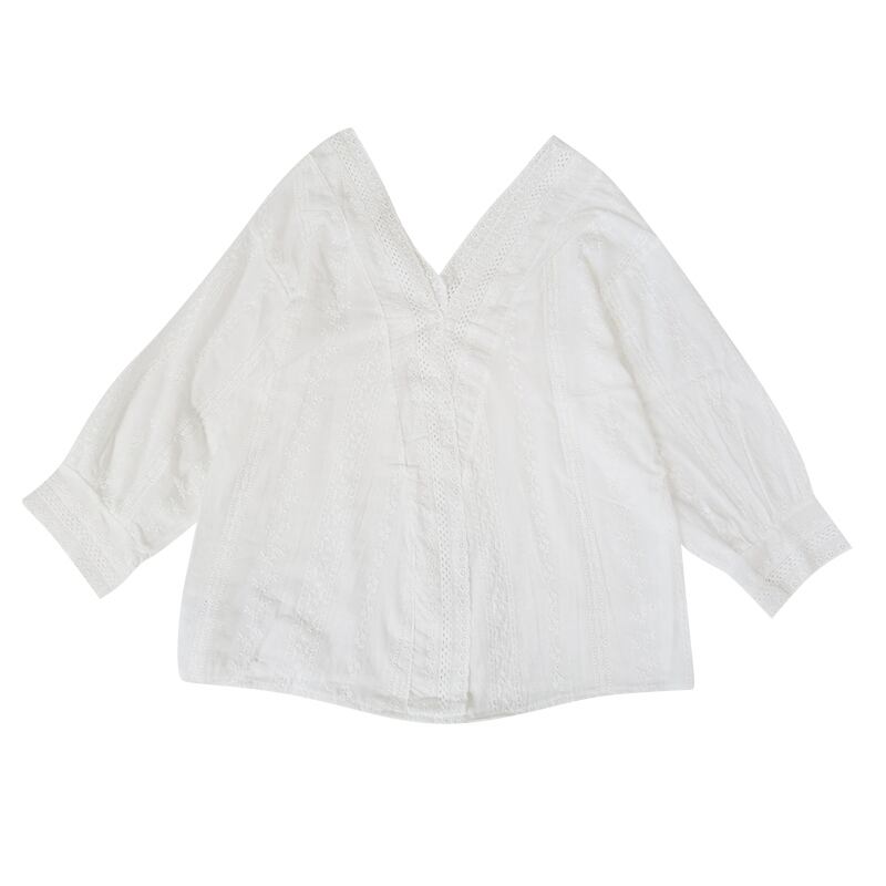 ルーズホワイトレースVネックシャツ スリーブトップス スプリング 春物 ステッチ YY-ファッション49264963605