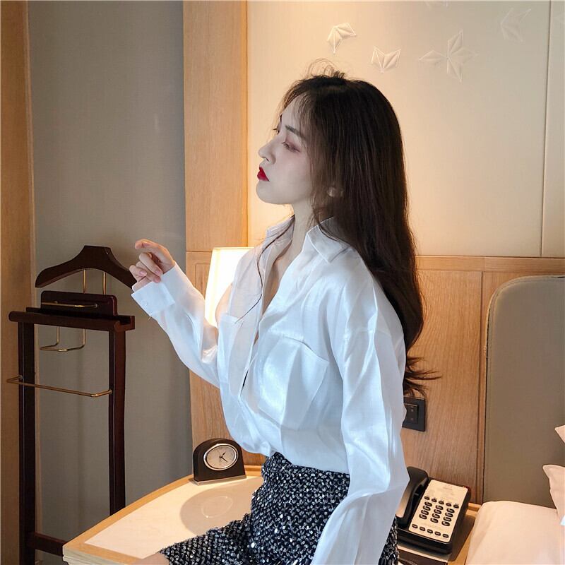 新しいファッションシャツの2020年夏の女性バージョンオールマッチ気質トップルーズVネックホワイト長袖シャツトレンド YY-ファッション61405775060