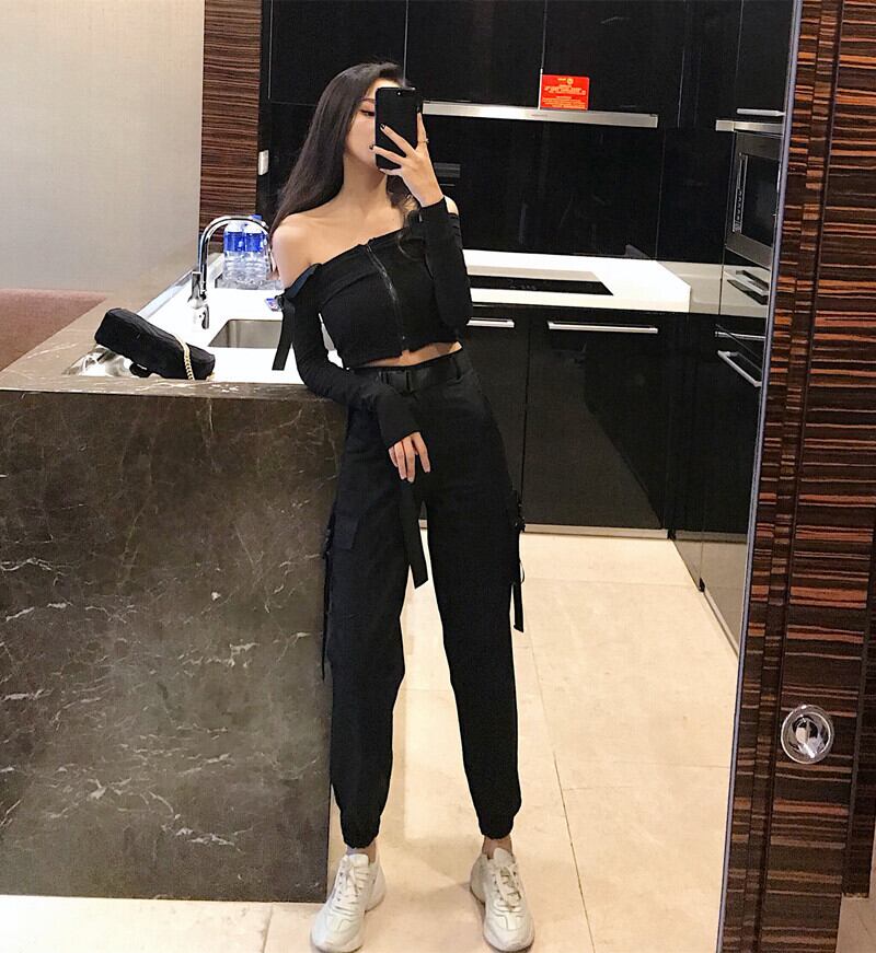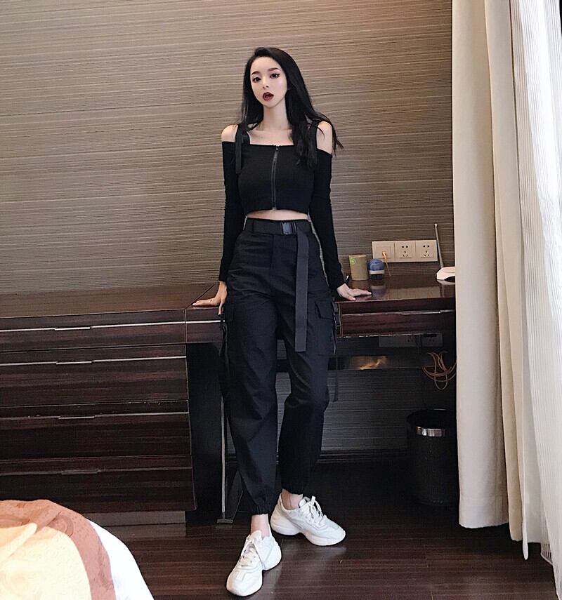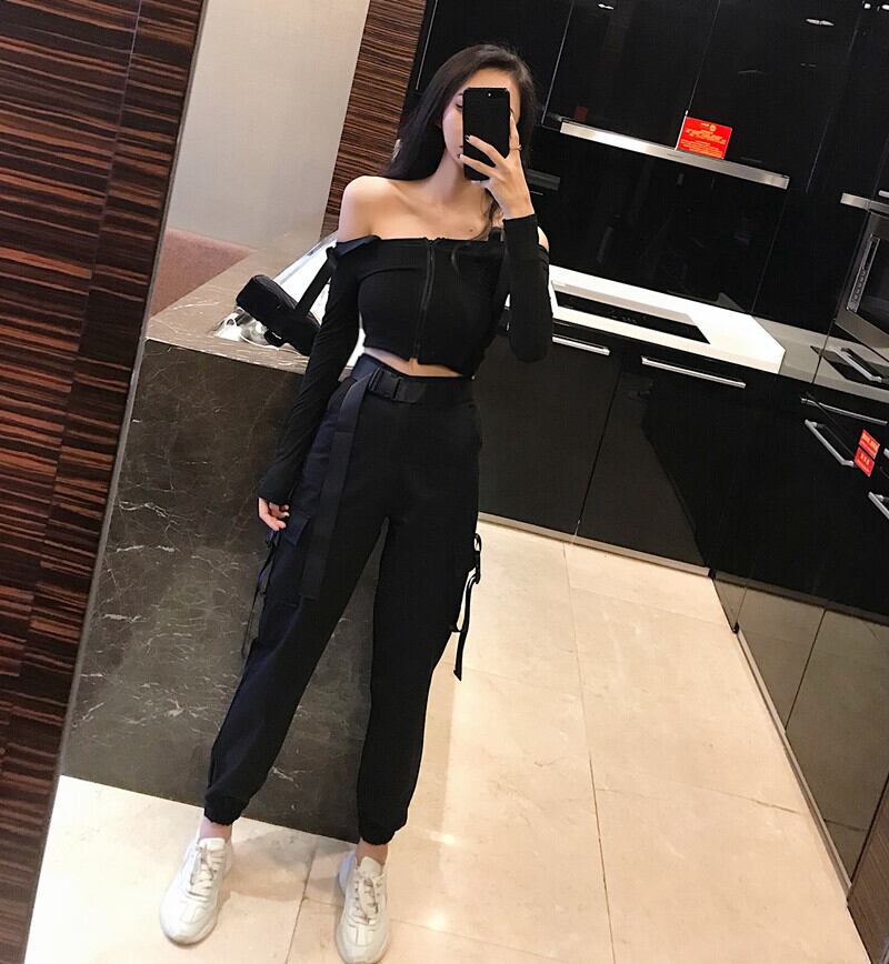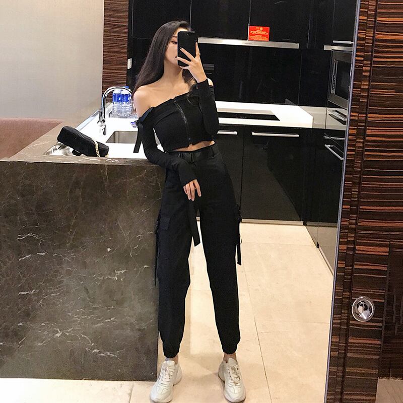 夏の女性の2020年の新しいハイウエストポケットヒップホップルーズレギンスオーバーオール+ストラップウエストTシャツ女性ツーピーススーツ YY-ファッション9272979480
