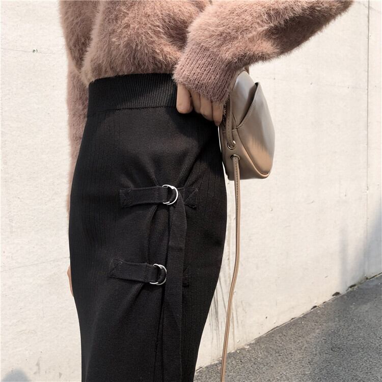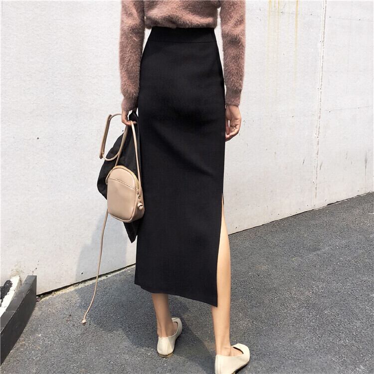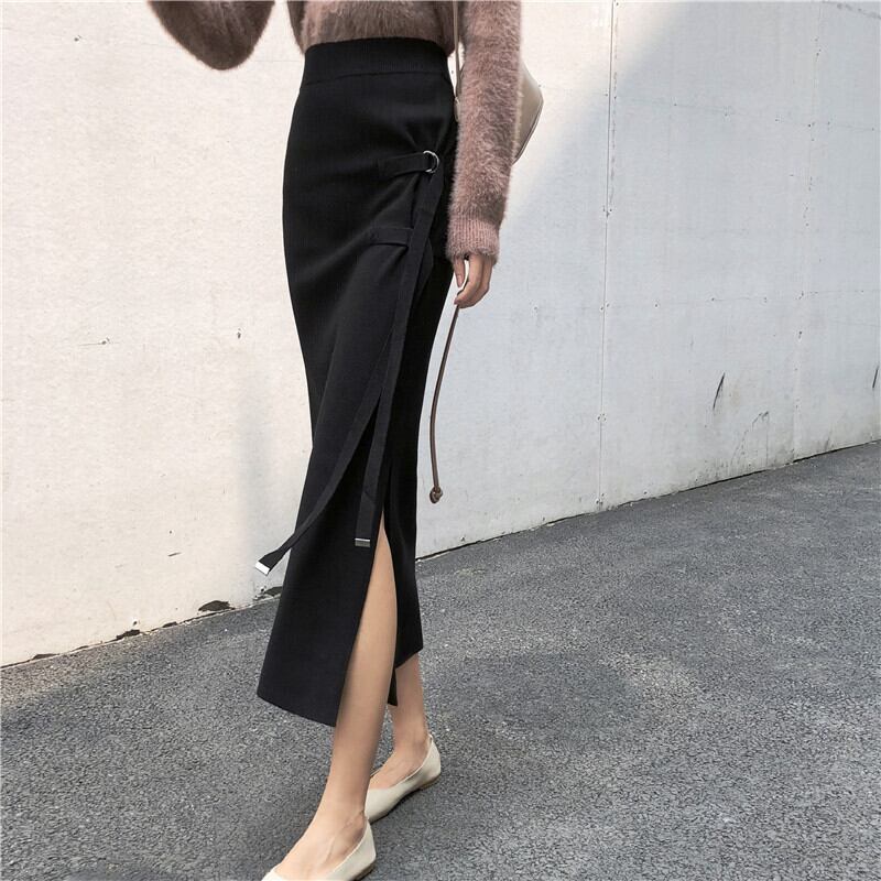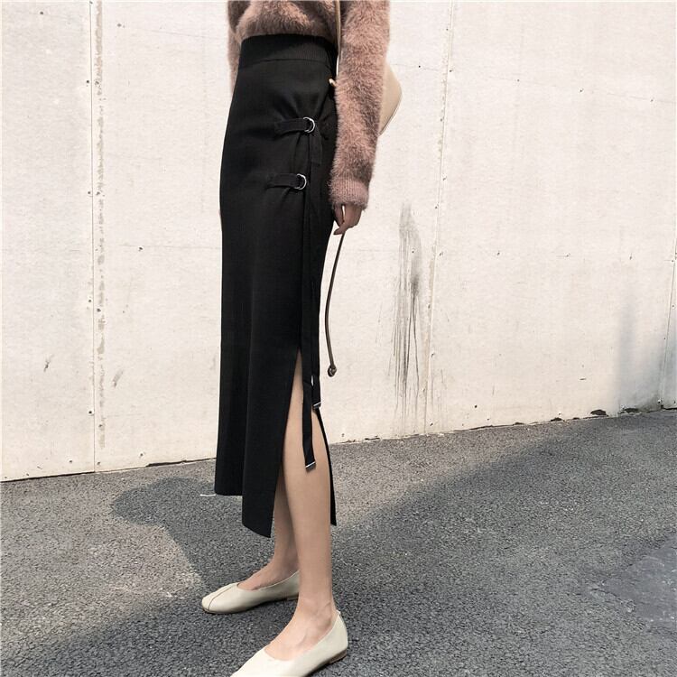 ニットスカートハイウエストミドル丈ストレッチブラックレースミドル丈スカートバッグヒップスカート香港フレーバースプリットワンステップスカート女性 YY-ファッション21122400202