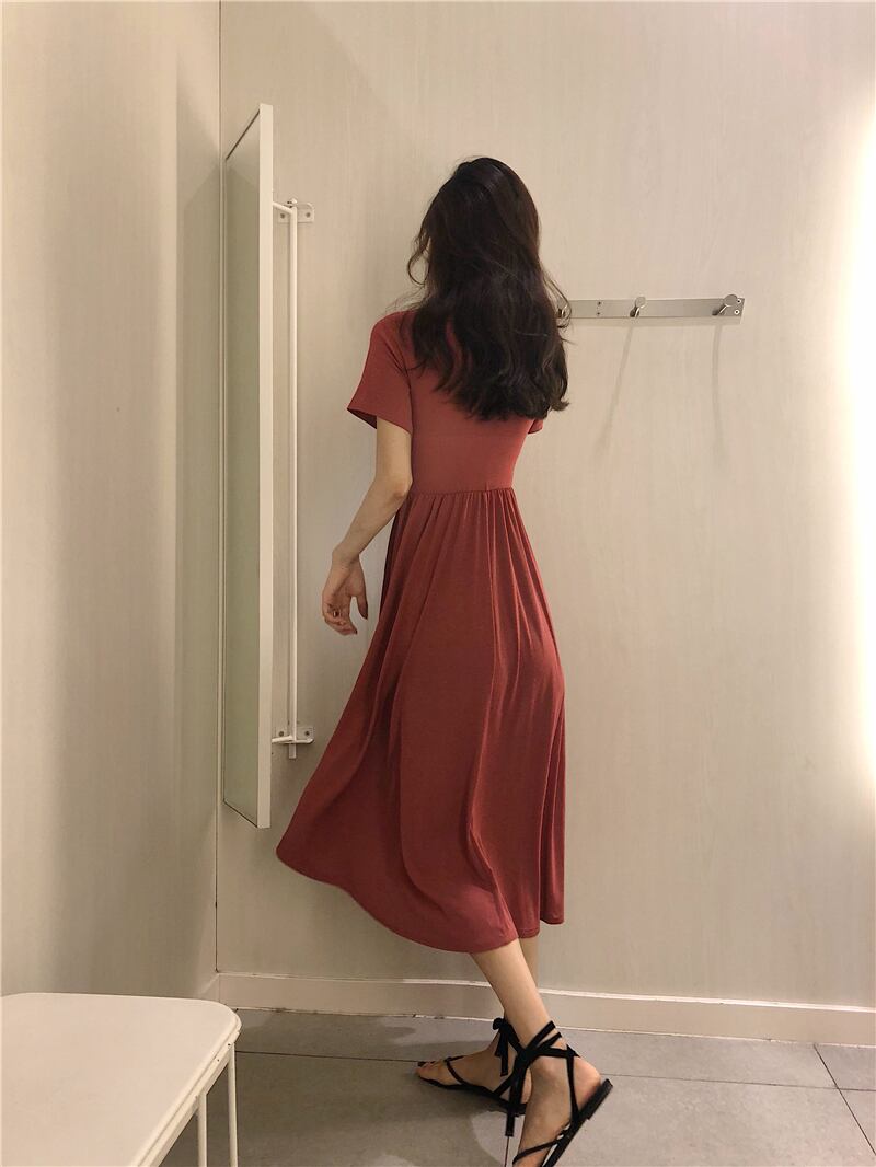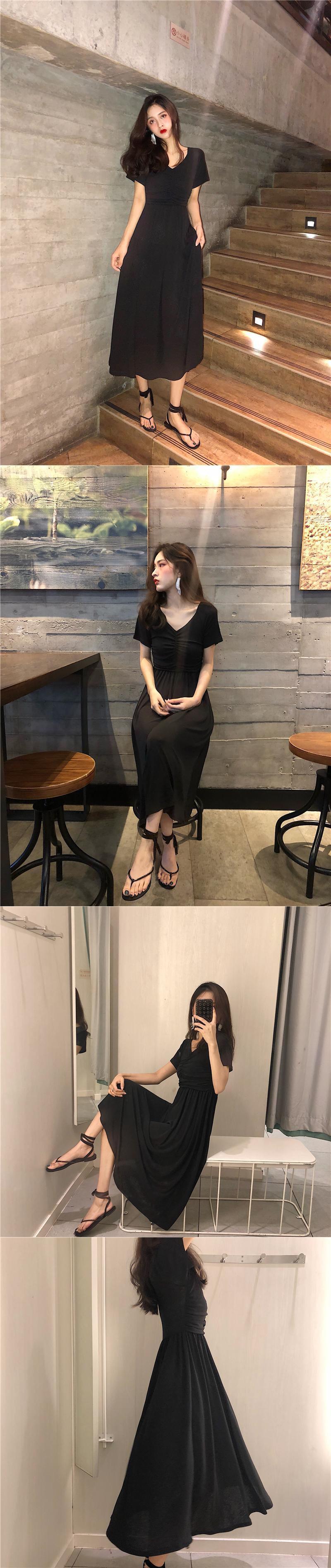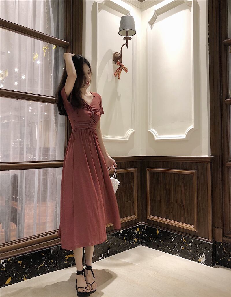 2020年夏新気質香港フレーバーシックレトロVネックスリムフォールドミドル丈半袖スリムワンピース YY-ファッション95500491764
