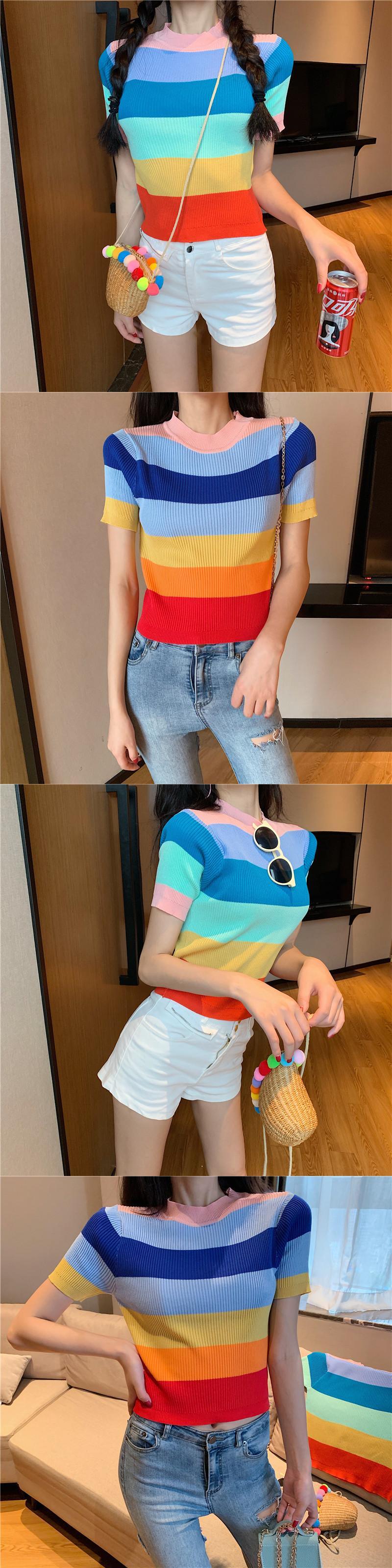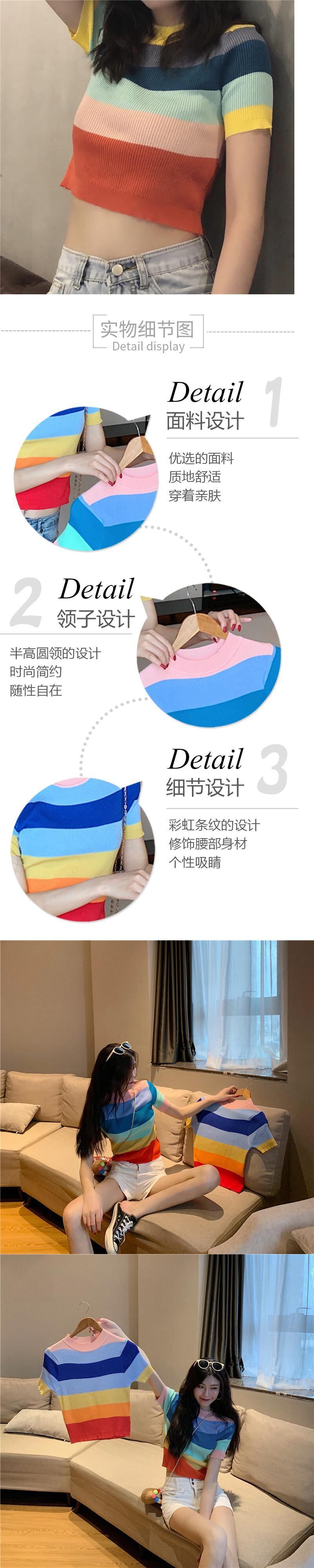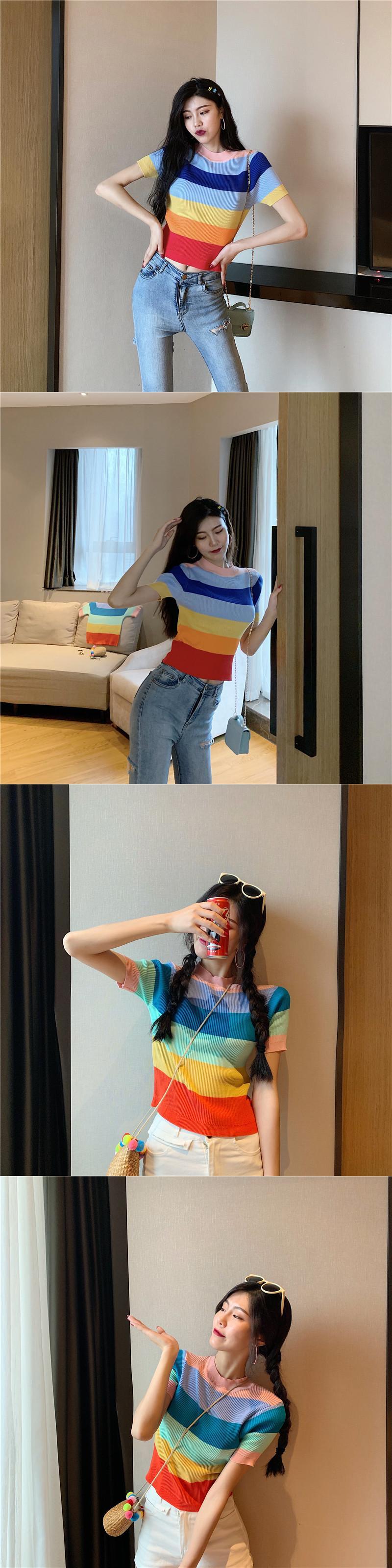 2020新しいレトロレインボーストライプラウンドネック半袖Tシャツショートスリムスリミングへそニットトップ女性トレンド YY-ファッション39693406310