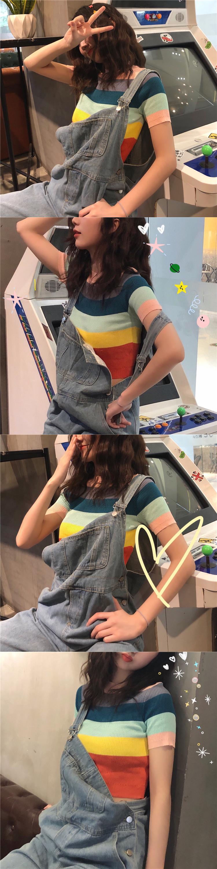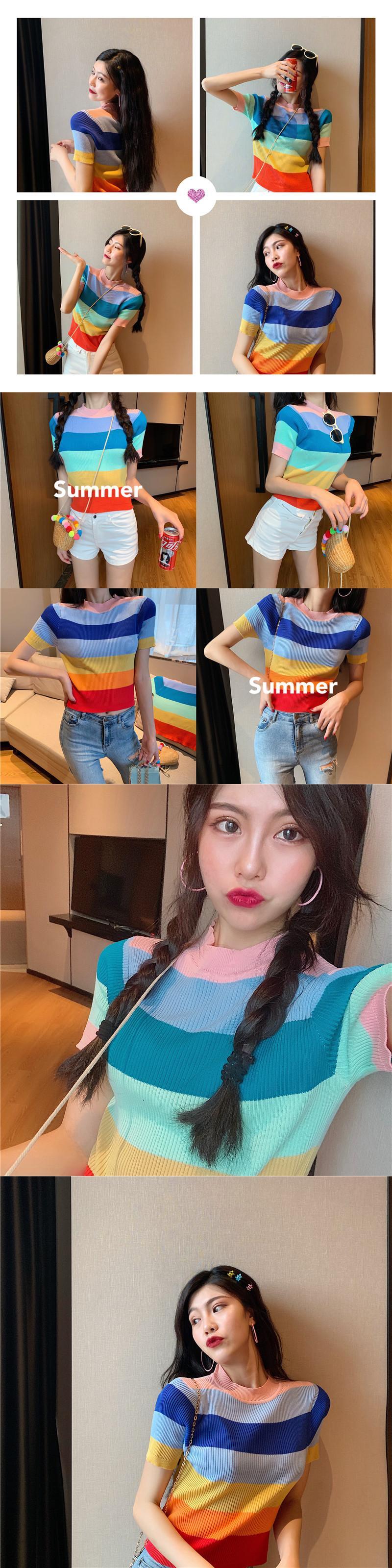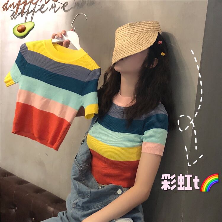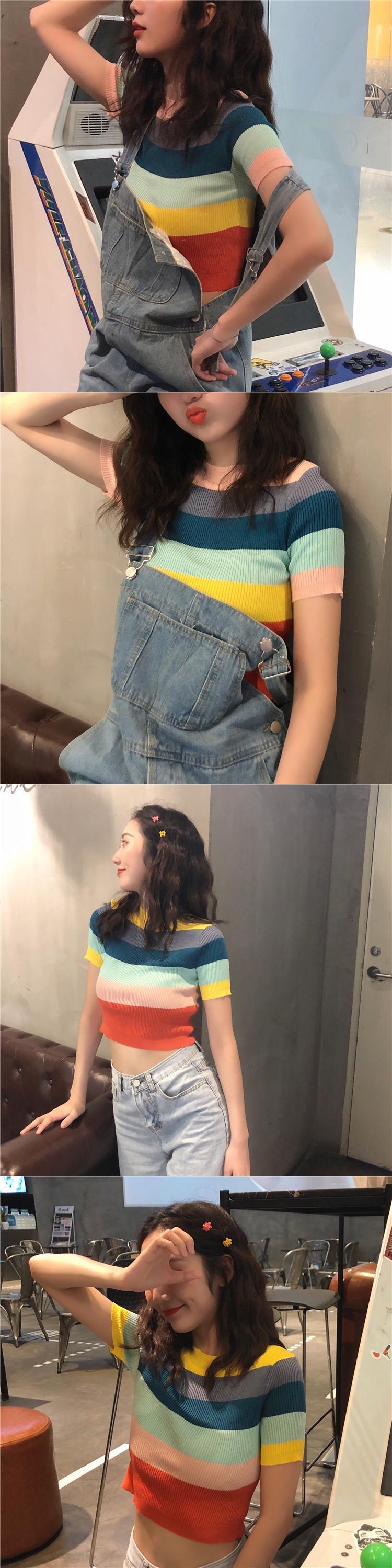 2020新しいレトロレインボーストライプラウンドネック半袖Tシャツショートスリムスリミングへそニットトップ女性トレンド YY-ファッション39693406310