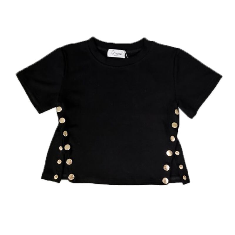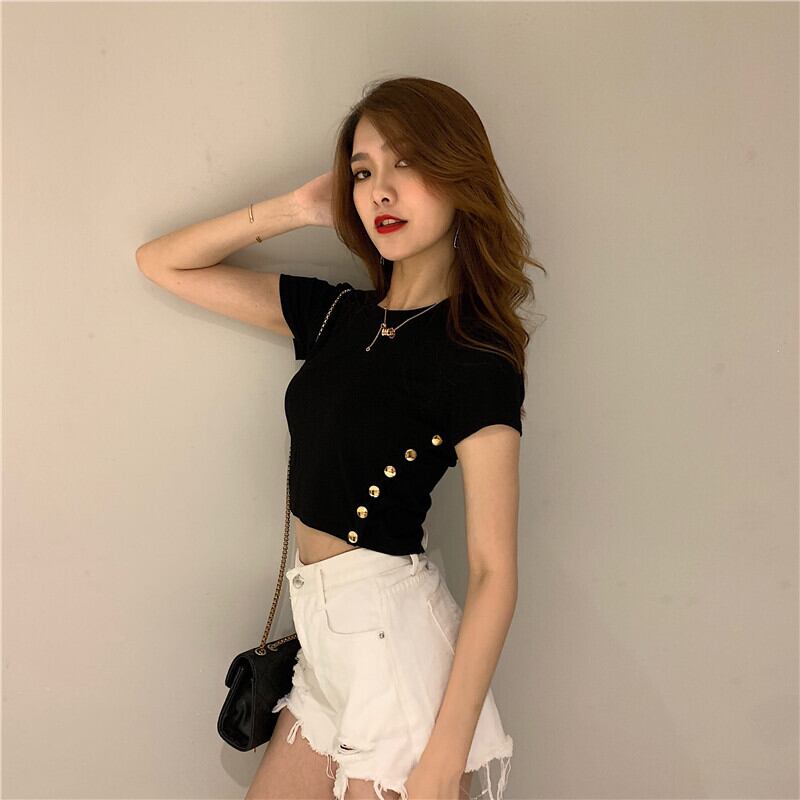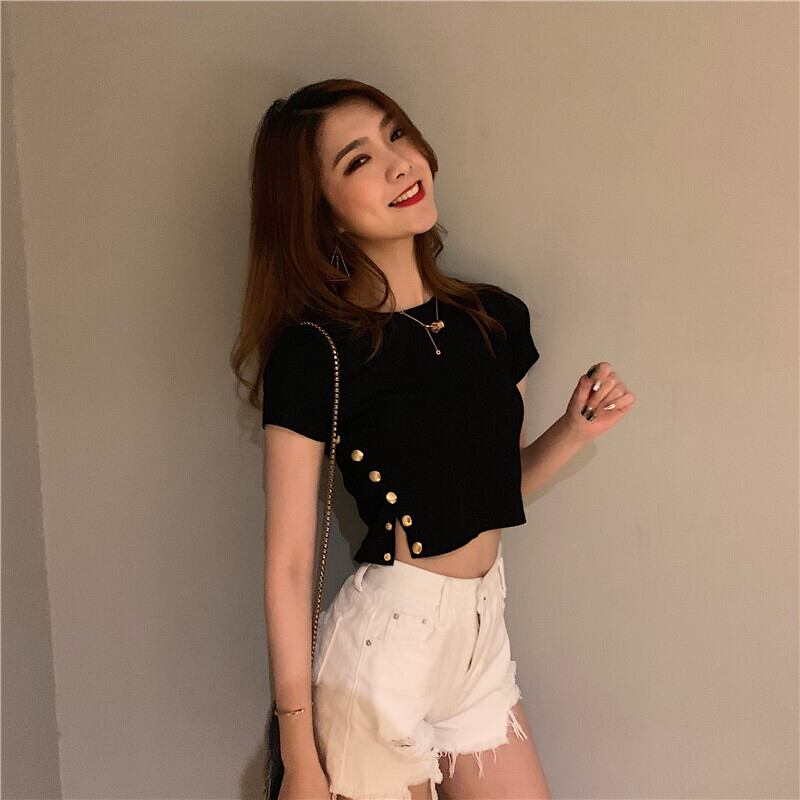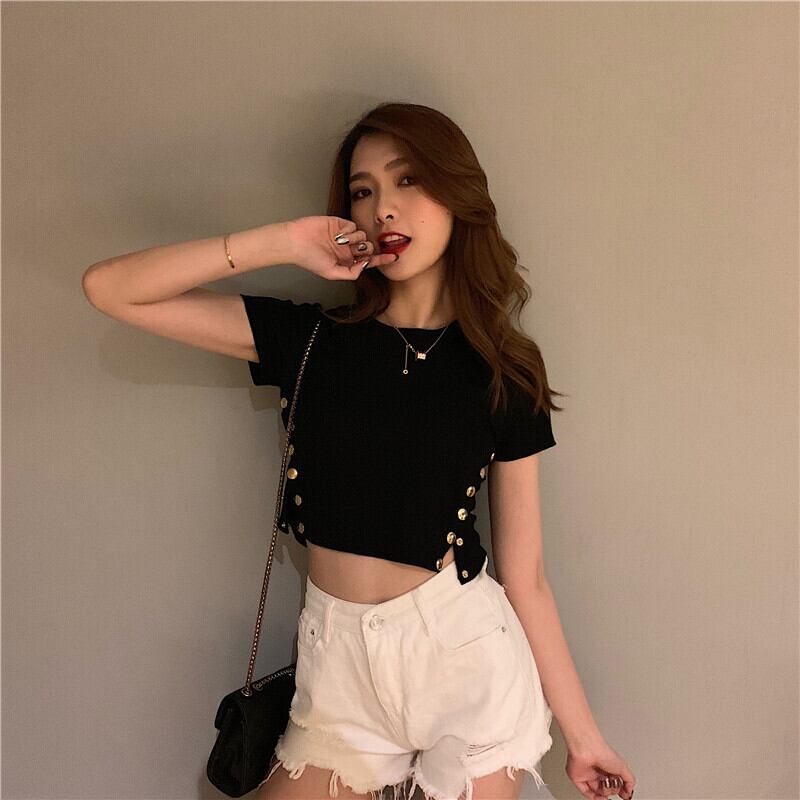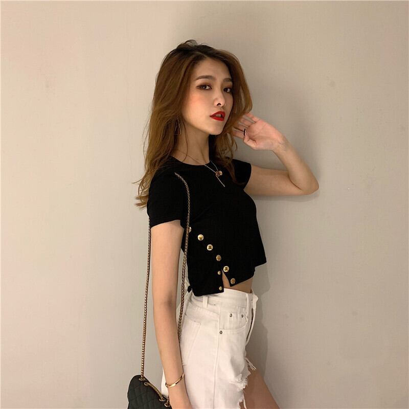 セクシーなスリムな無地のサイドスリットスナップボタンタイトフィットショートTシャツトップス女性のオールマッチファッションバージョン YY-ファッション16067733218