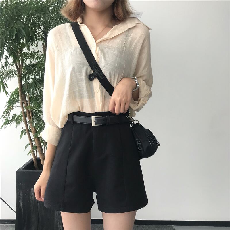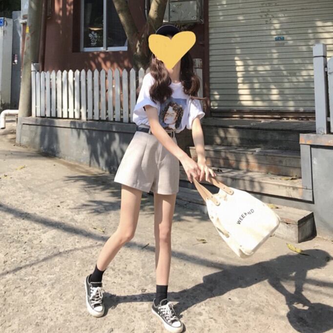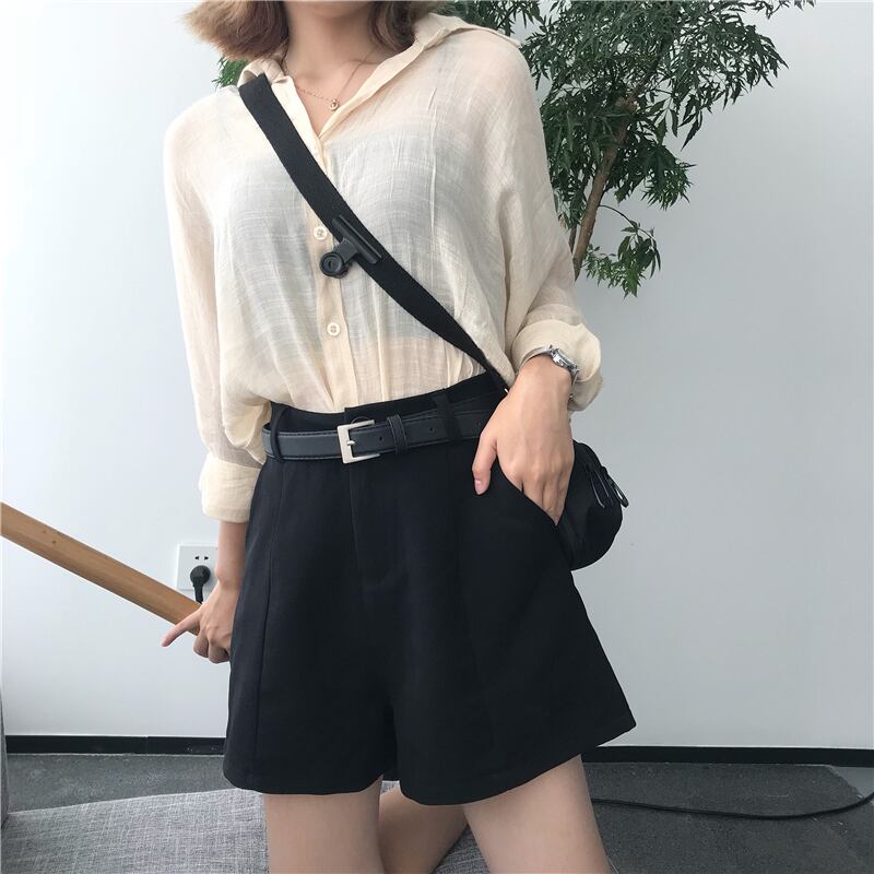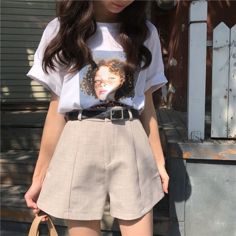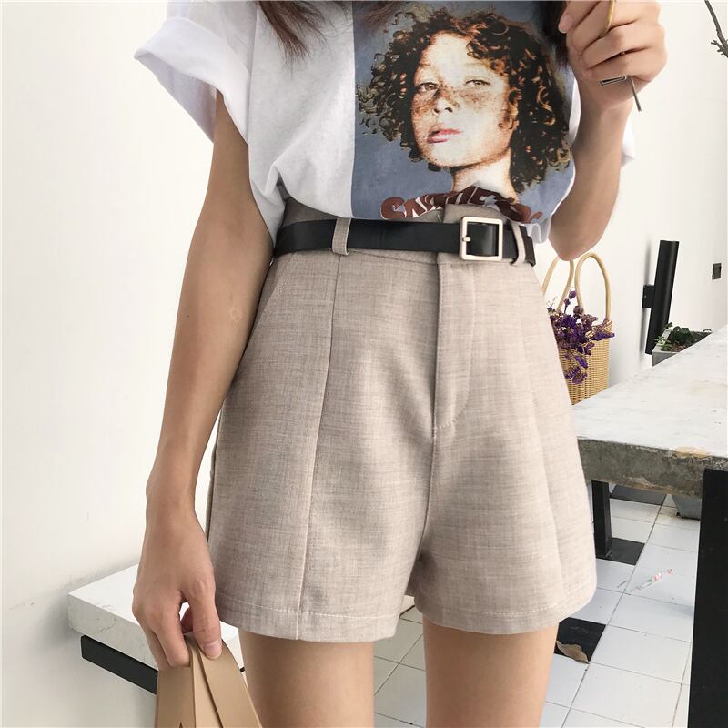 夏のシンプルなルーズハイウエスト無地カジュアルショーツ学生ワイドレッグパンツスーツショーツベルト付きパンツ YY-ファッション2462609949