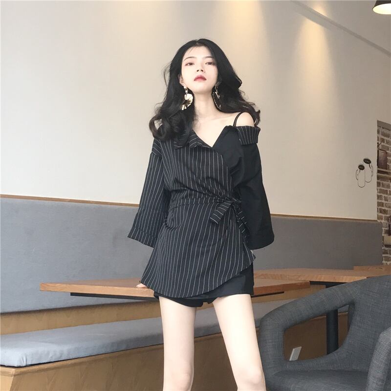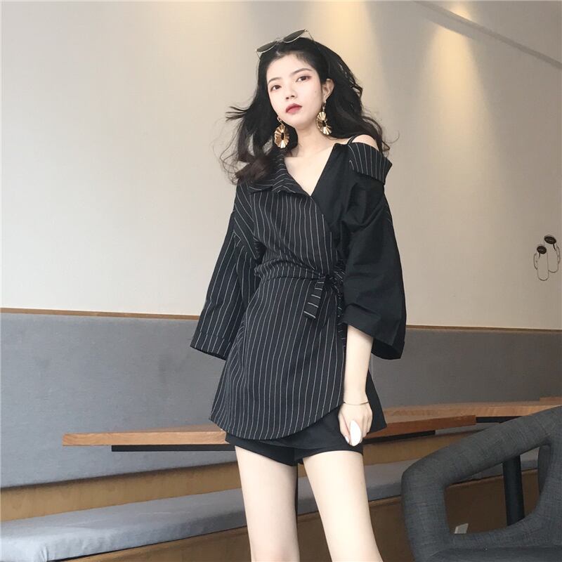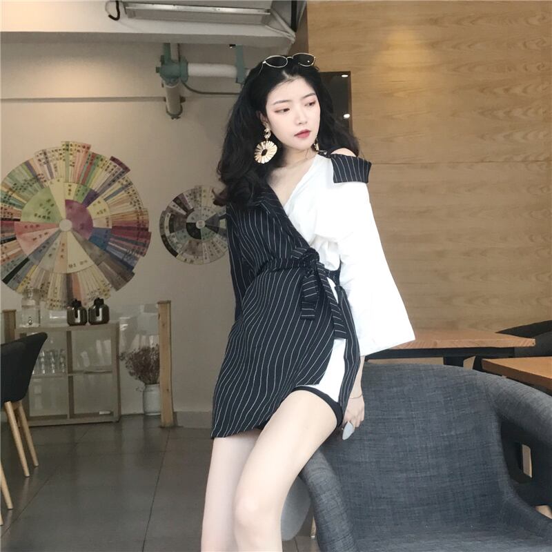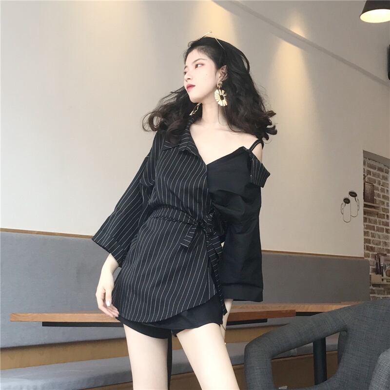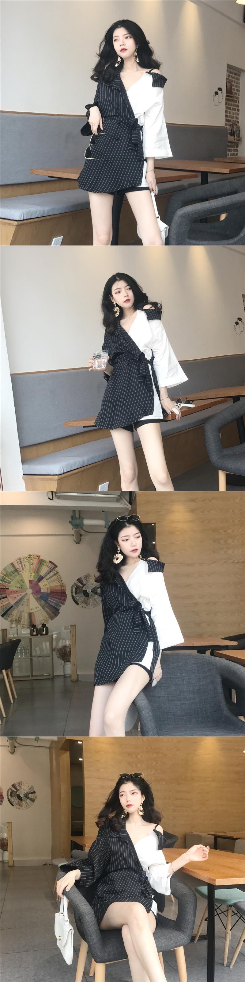 2020年春の新しいシンプルなデザインセンスミドル丈スーツカラー黒と白のストライプがルーズシャツの女性のネット赤潮に当たる YY-ファッション50718682908