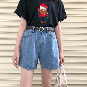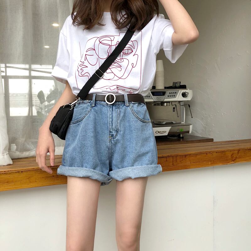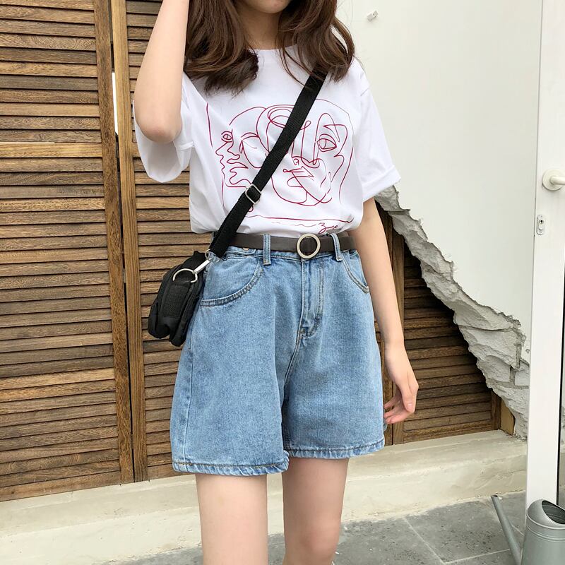 2020年夏の新しい香港フレーバーシックな学生が手でボタンを押したハイウエストウォッシュドワイドレッグデニムショーツレディースフリーベルト YY-ファッション77722049122
