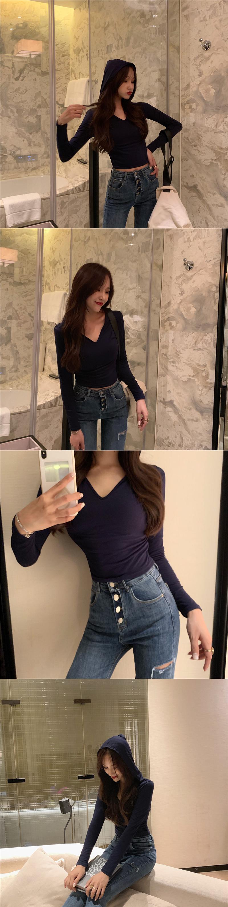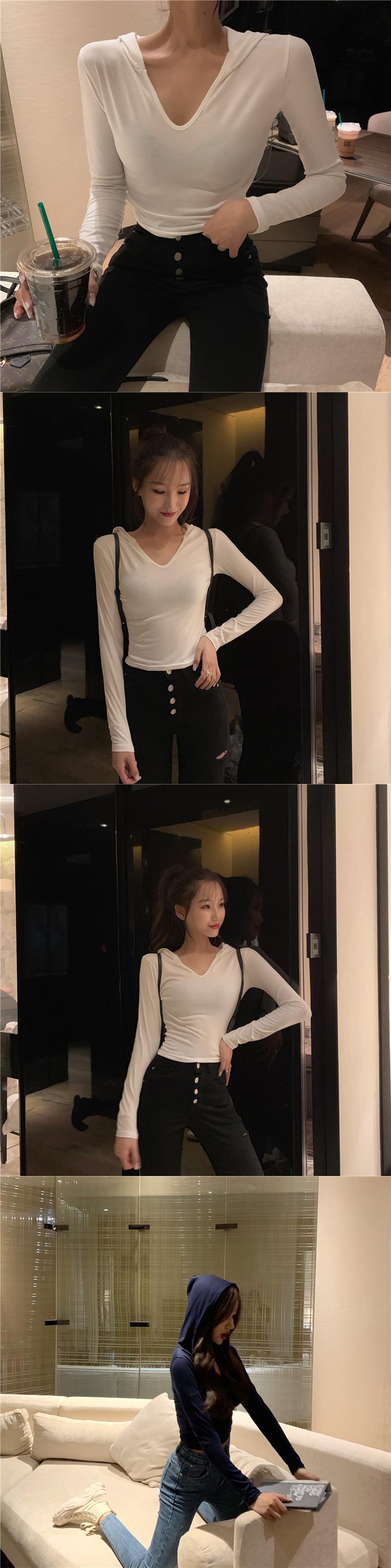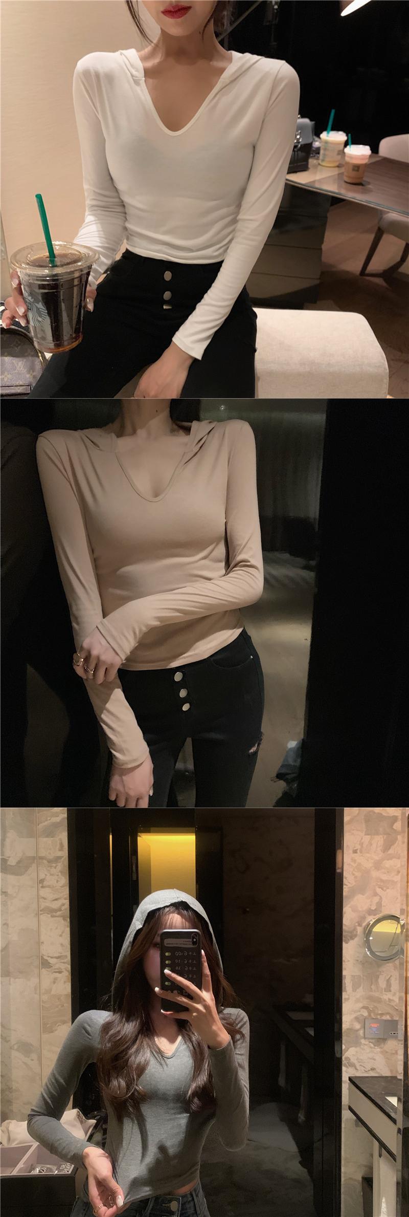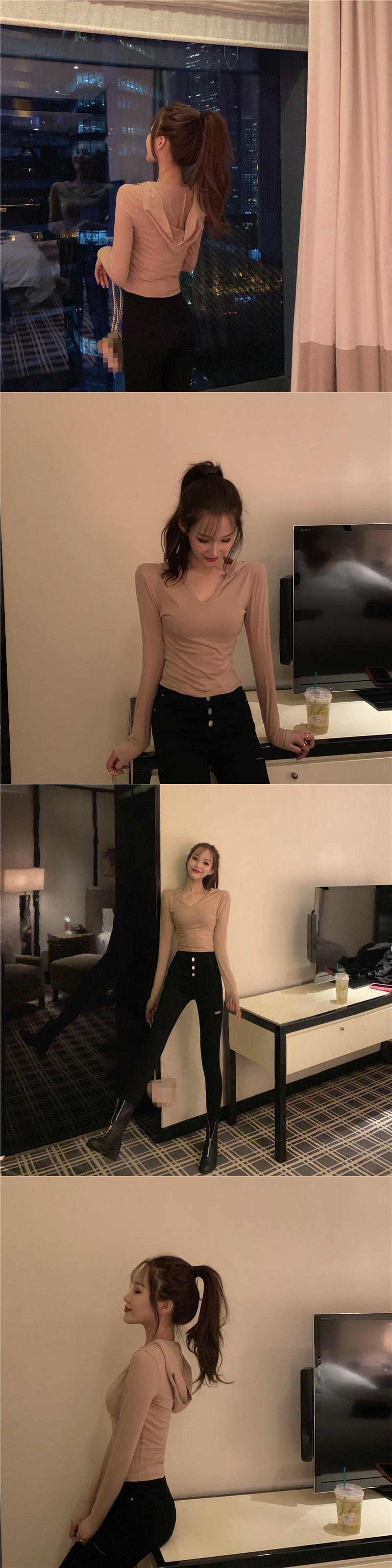 長袖フード付きTシャツショートVネック、2020年夏の新しいスリムで薄いバージョンのボトミングシャツトップ女性 YY-ファッション4727370336
