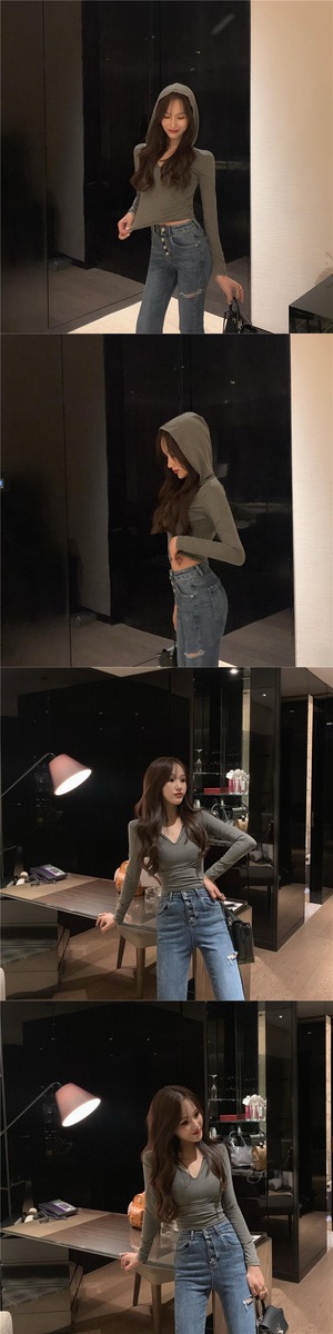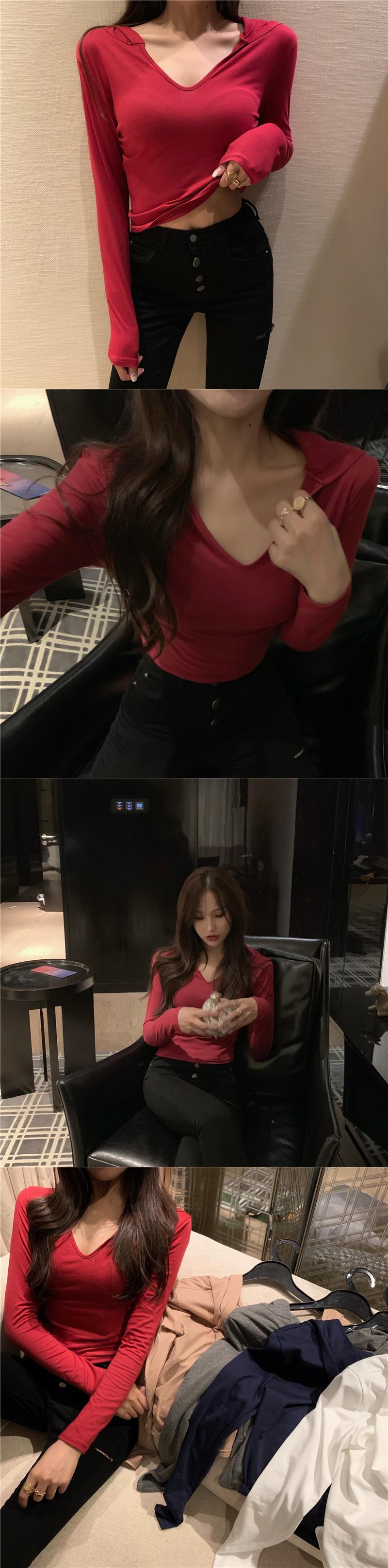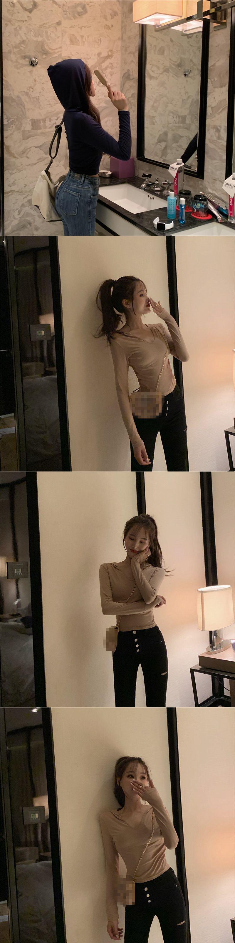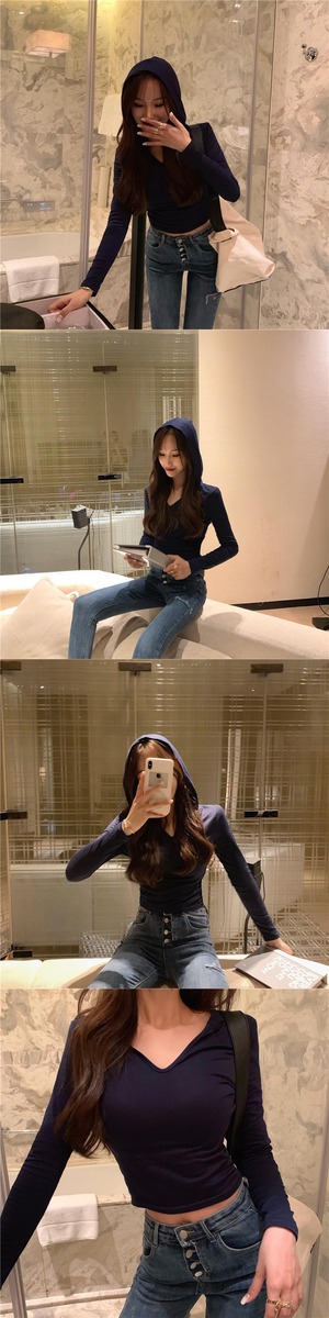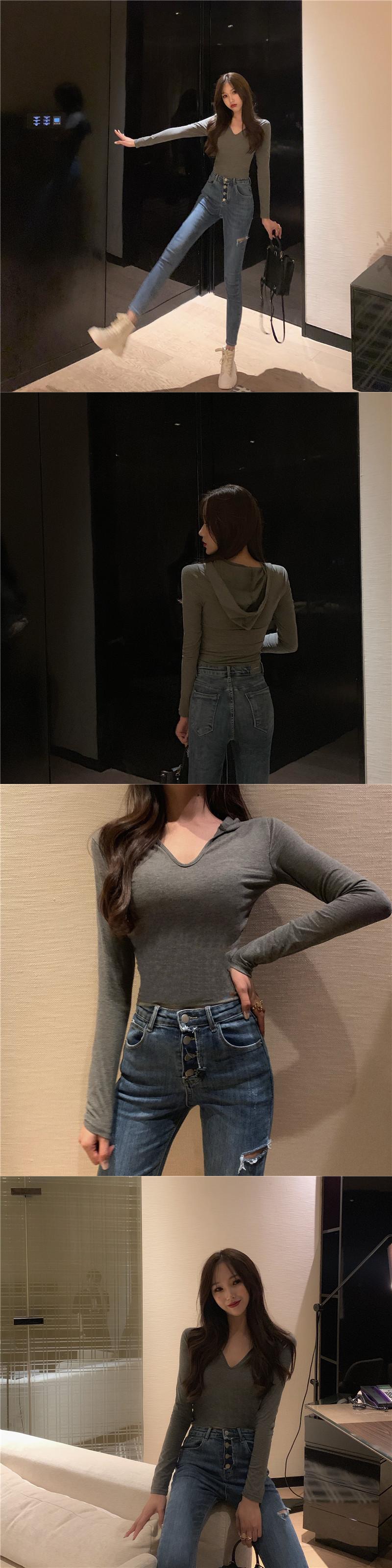 長袖フード付きTシャツショートVネック、2020年夏の新しいスリムで薄いバージョンのボトミングシャツトップ女性 YY-ファッション4727370336