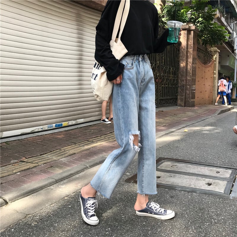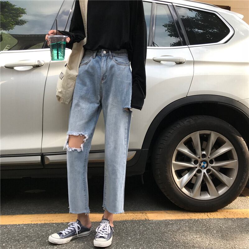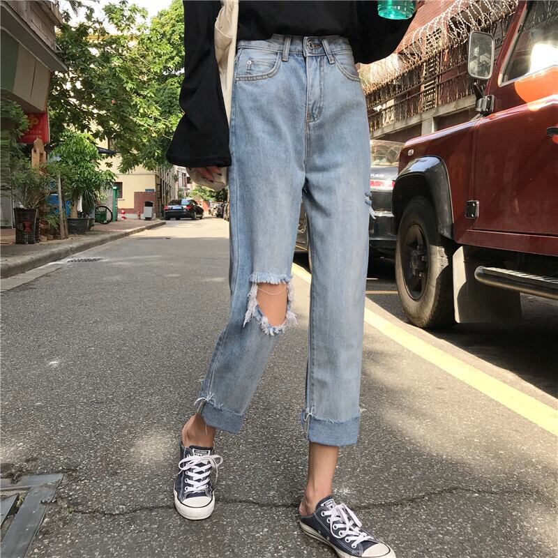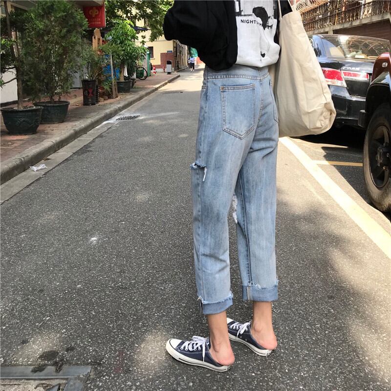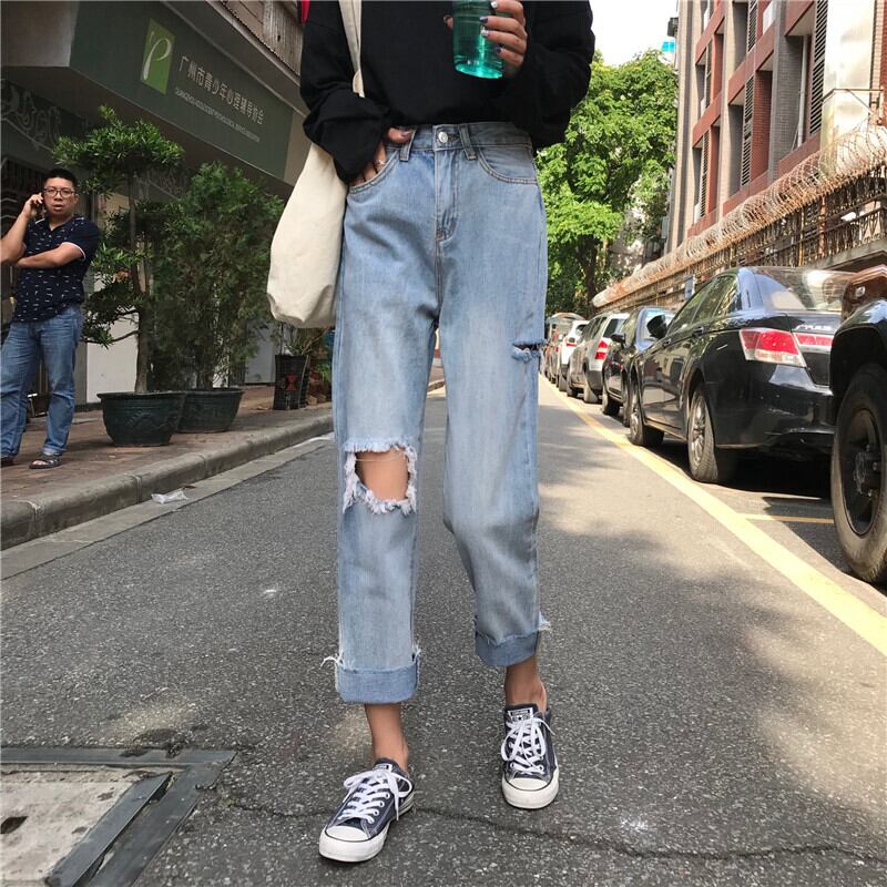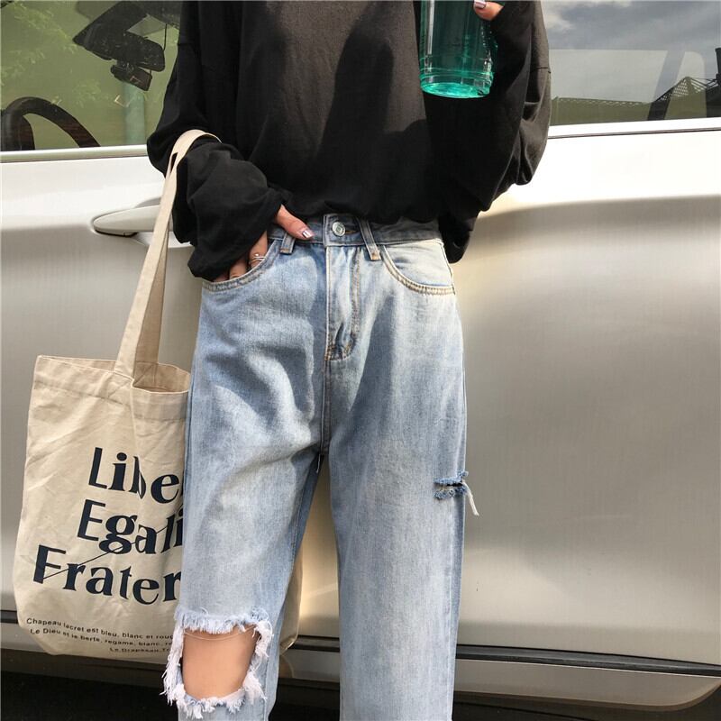 乞食パンツストレートレッグ学生ワイドレッグパンツ2020夏ルーズハイウエスト原宿スタイル破れたジーンズ女性 YY-ファッション86017225443