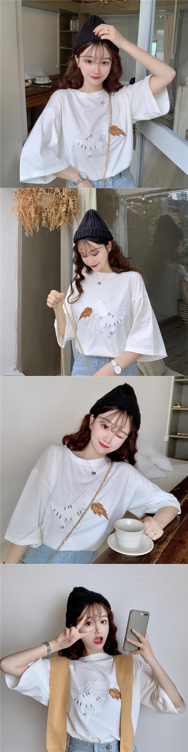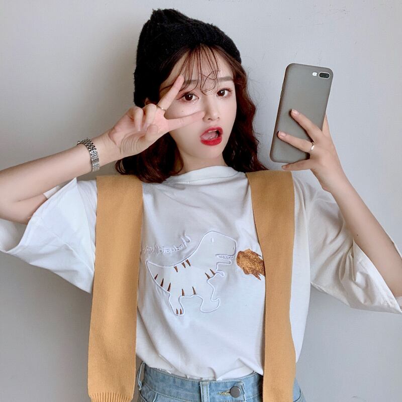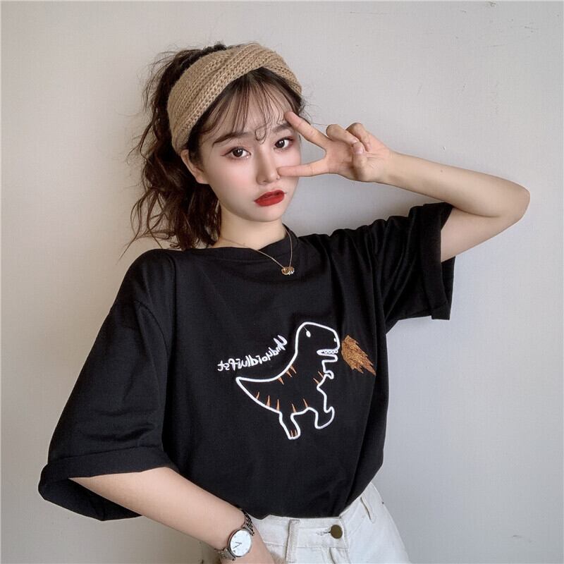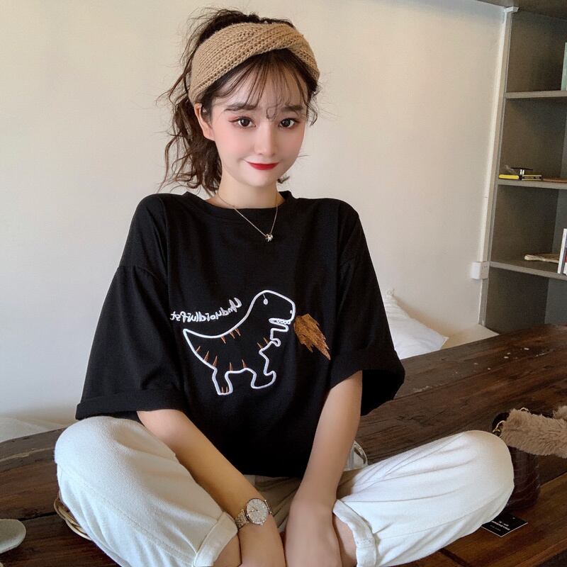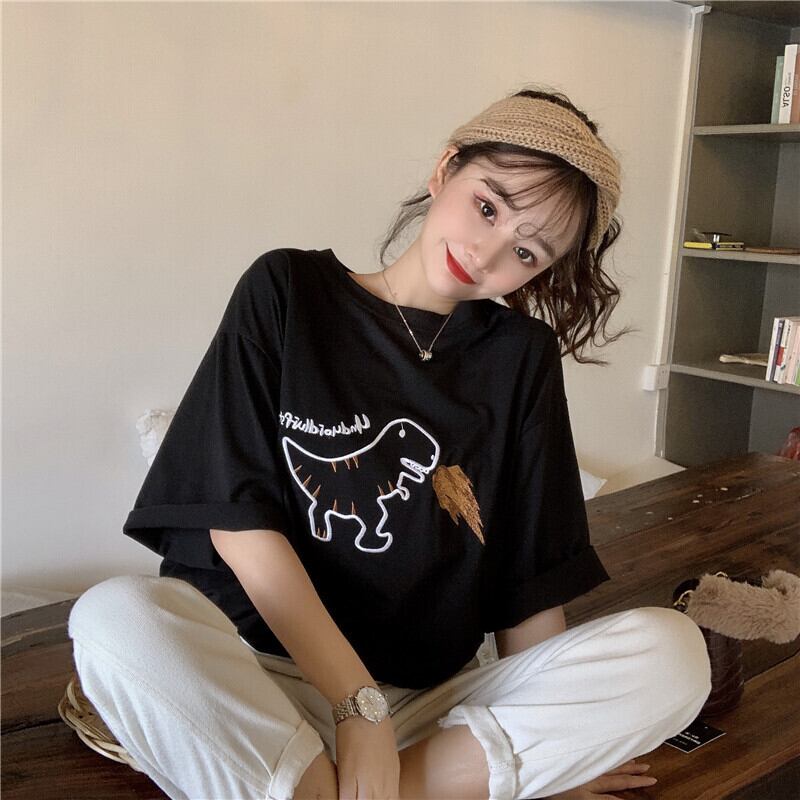 2020年春夏バージョン新作インファン楽しい恐竜刺繡ルーズブラックインナーベース半袖Tシャツレディース YY-ファッション5868207328