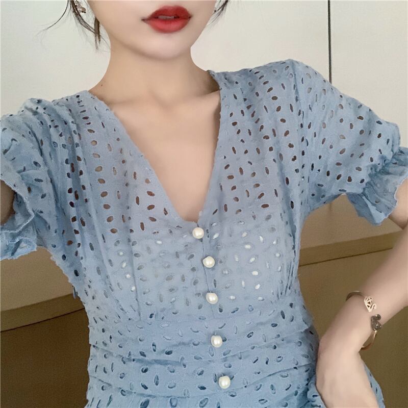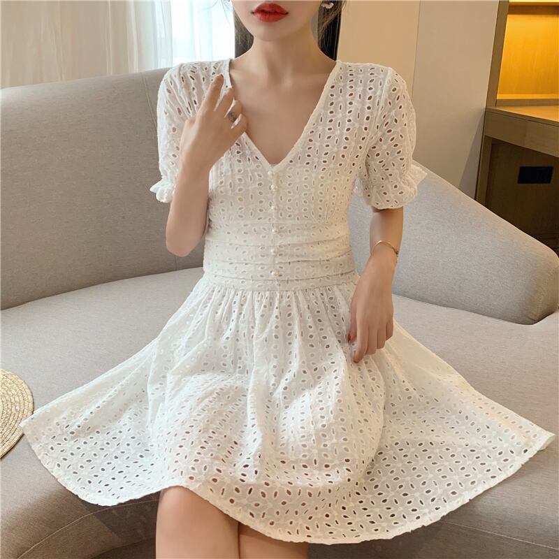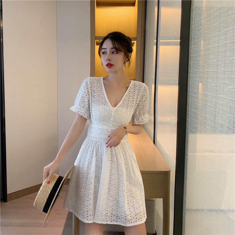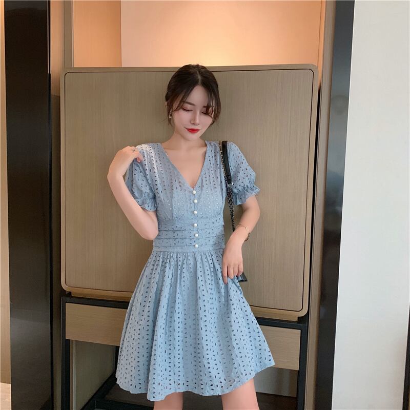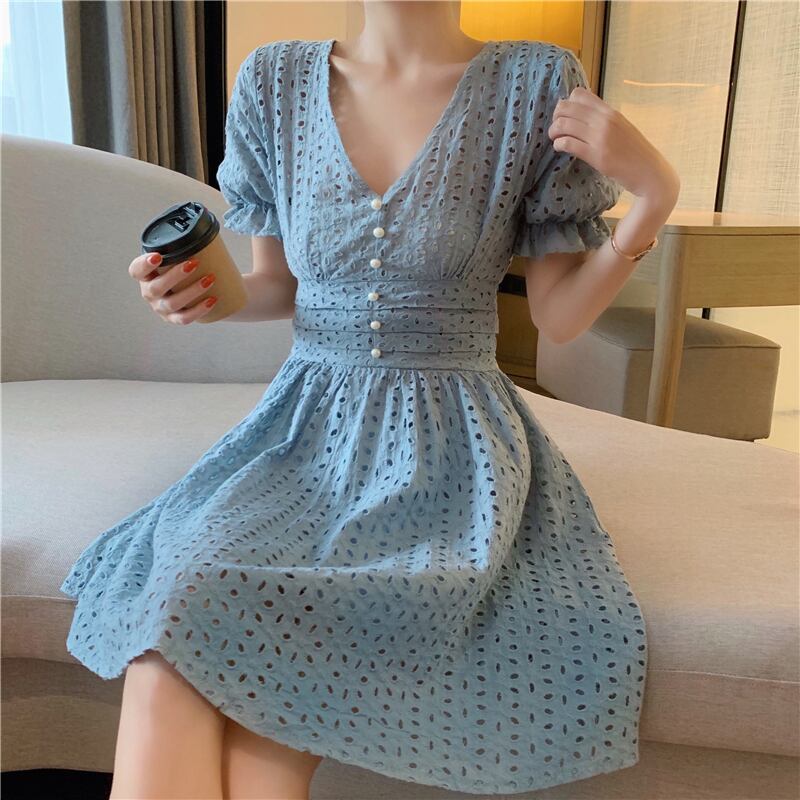シックなVネックの小さな甘い気質のくぼんだウエストのバージョンウエスタンスタイルの細いAラインドレス女性2020年夏 YY-ファッション89787463345