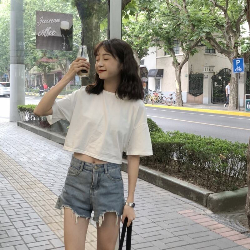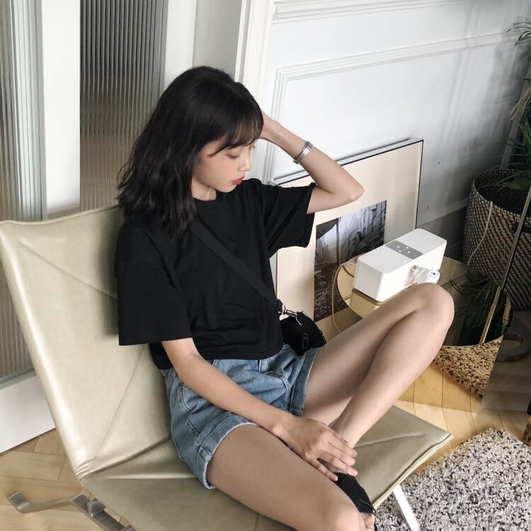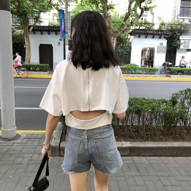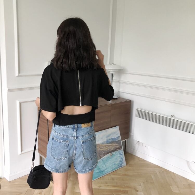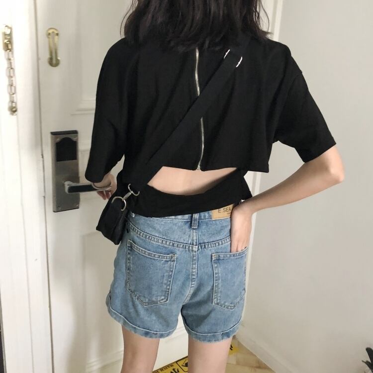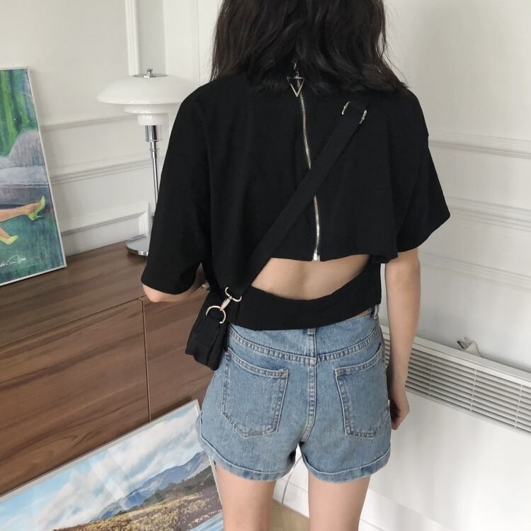ピュアカラーホルターショートTシャツパーソナライズされたジッパー注意深いマシン半袖トップイン学生オールマッチ薄くてルーズ YY-ファッション52164804890