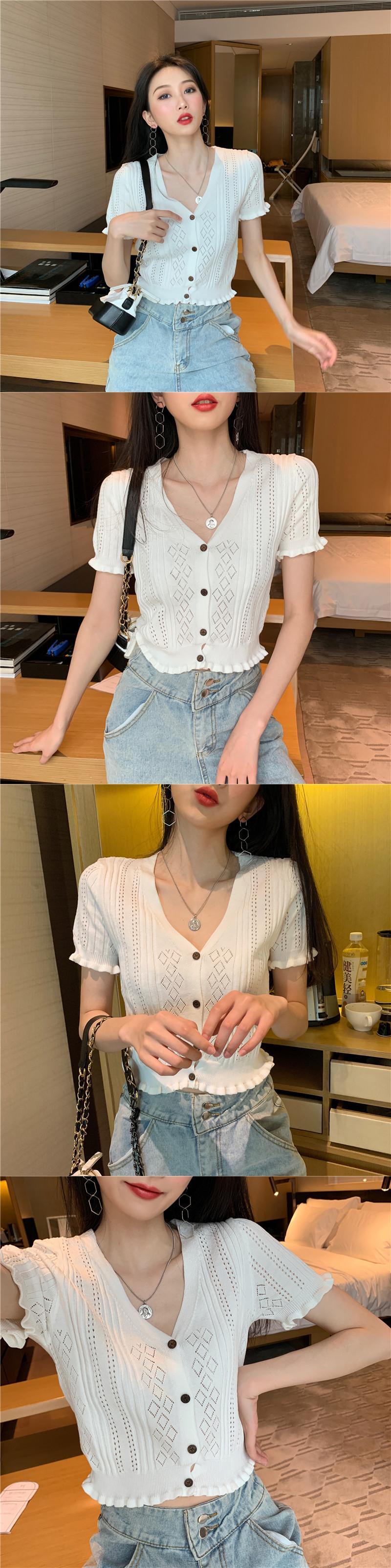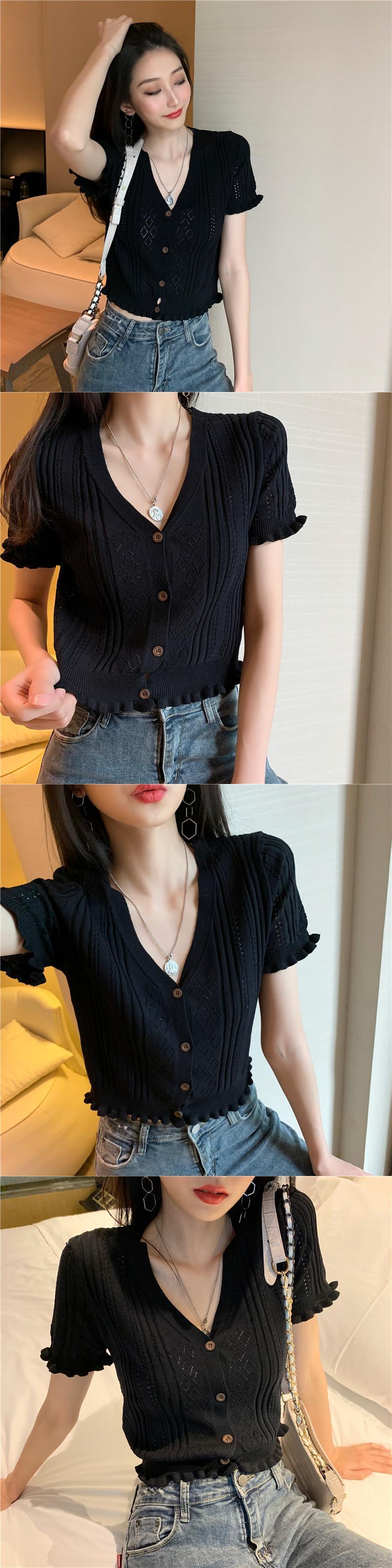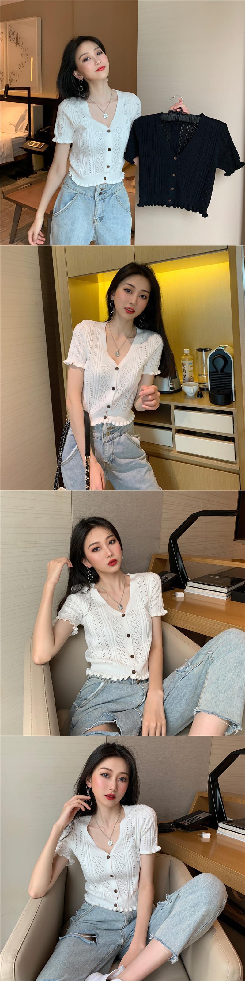 2020年バージョンの夏のVネック半袖ウエスタンスタイルブラウス、木製の耳、短く、小さく、薄く、ニットの中空ネットレッド YY-ファッション87377657829