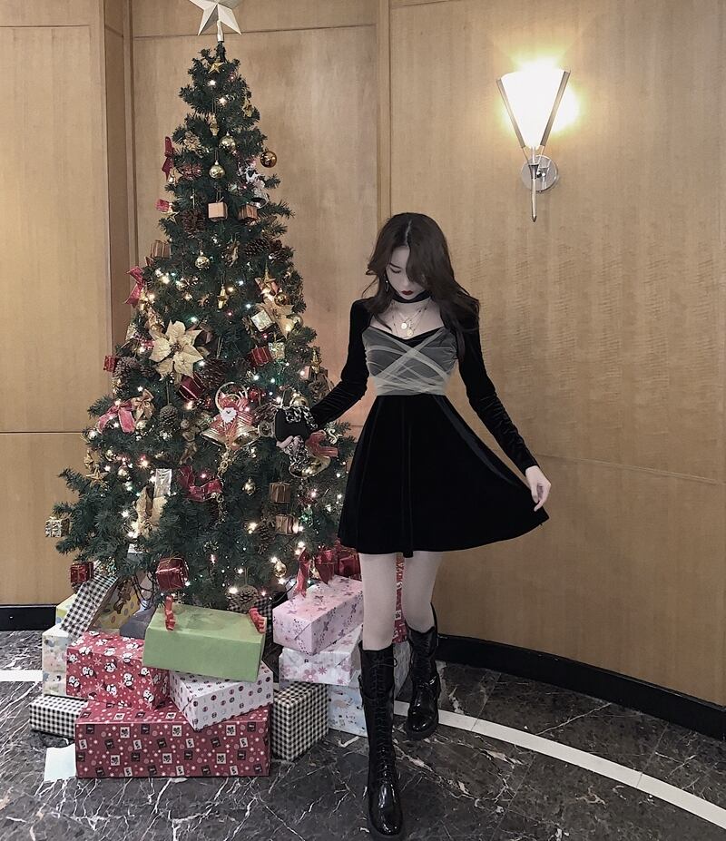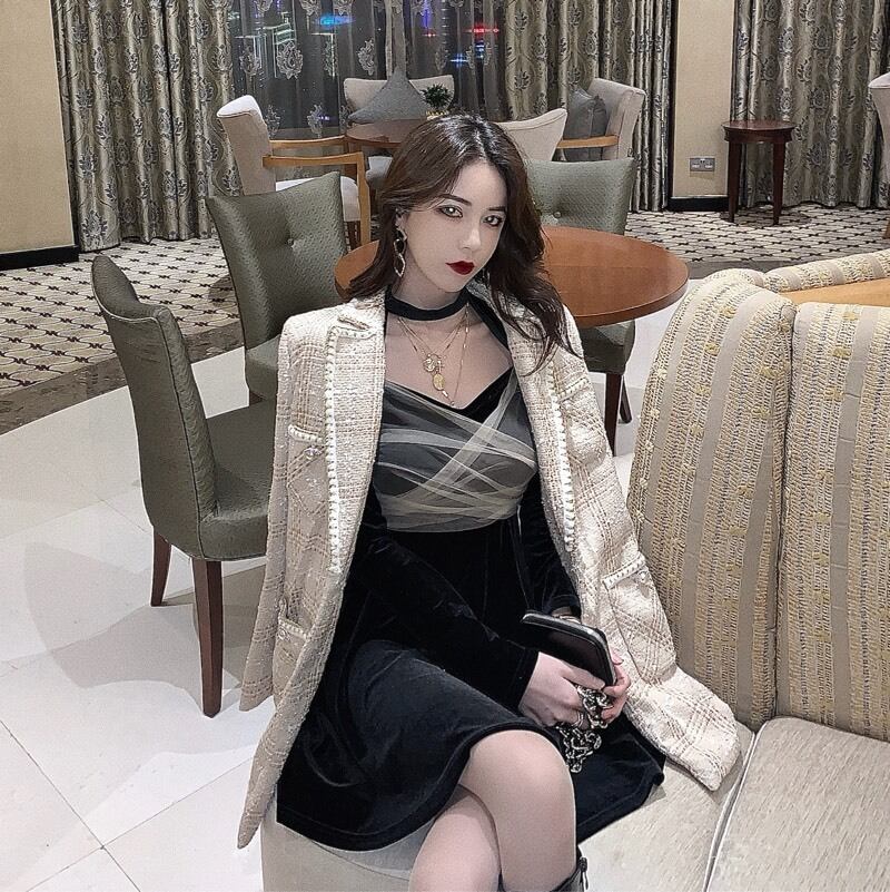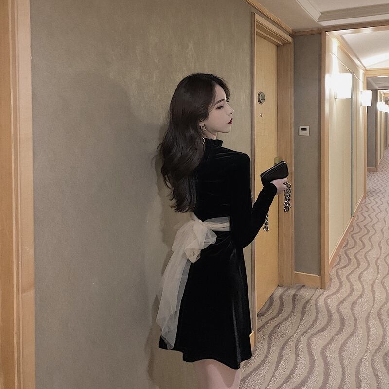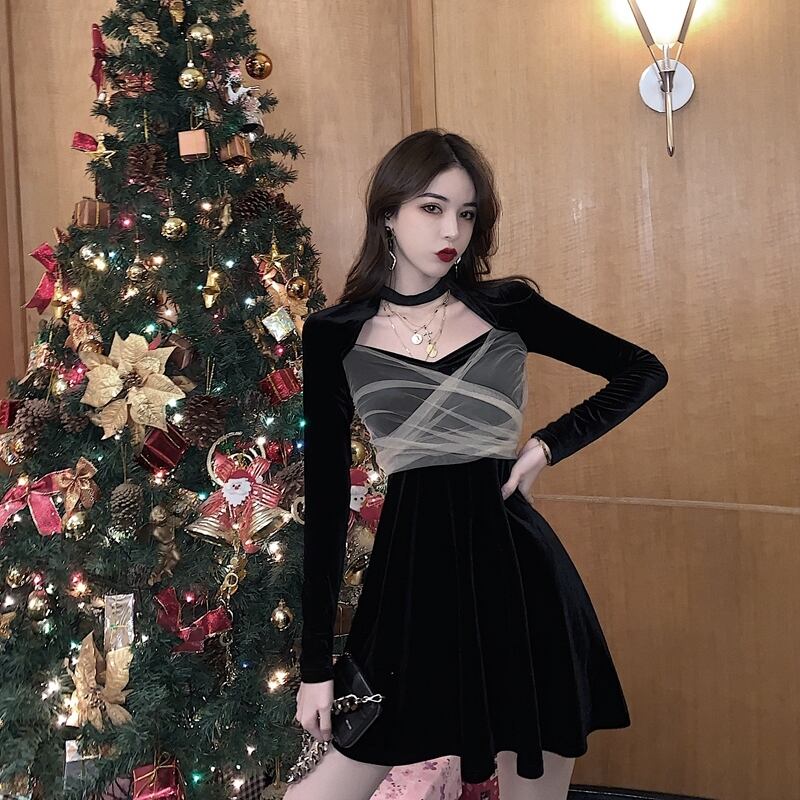 2020年春のシックな新しいファッションベルベットドレスフェミニンなVネックホルターメッシュステッチブラックドレス YY-ファッション16891810986