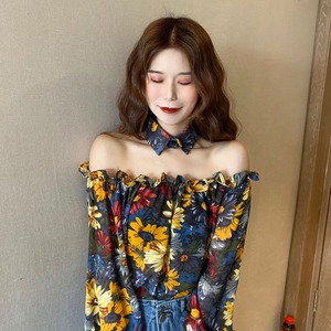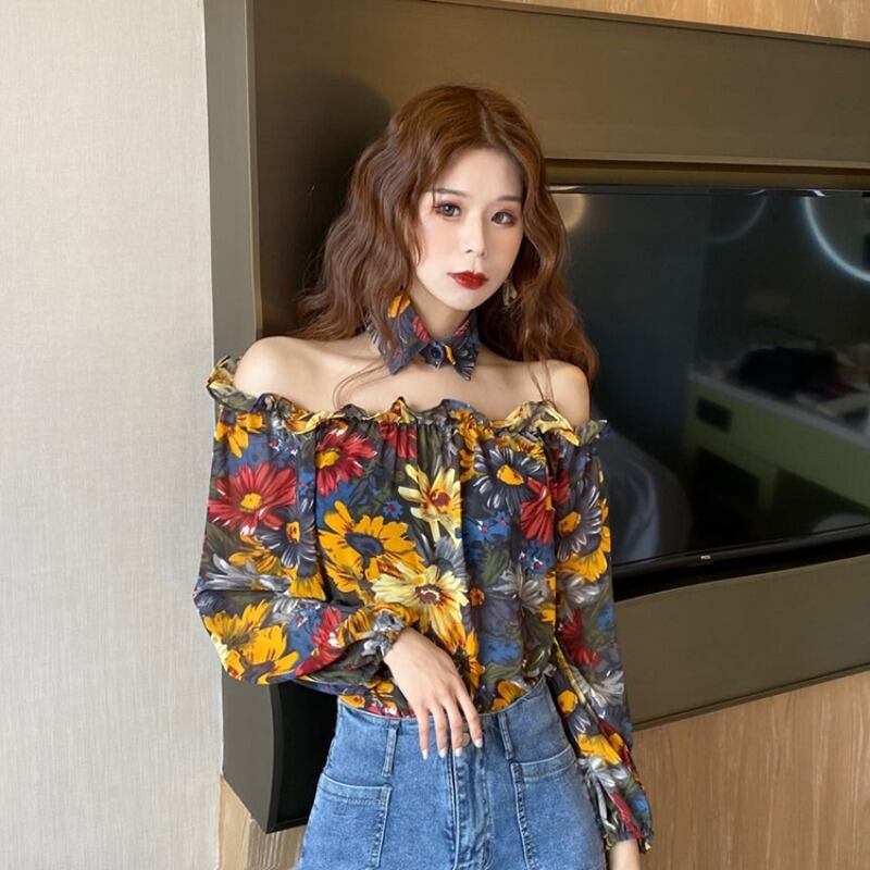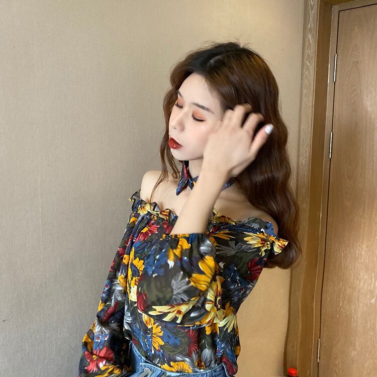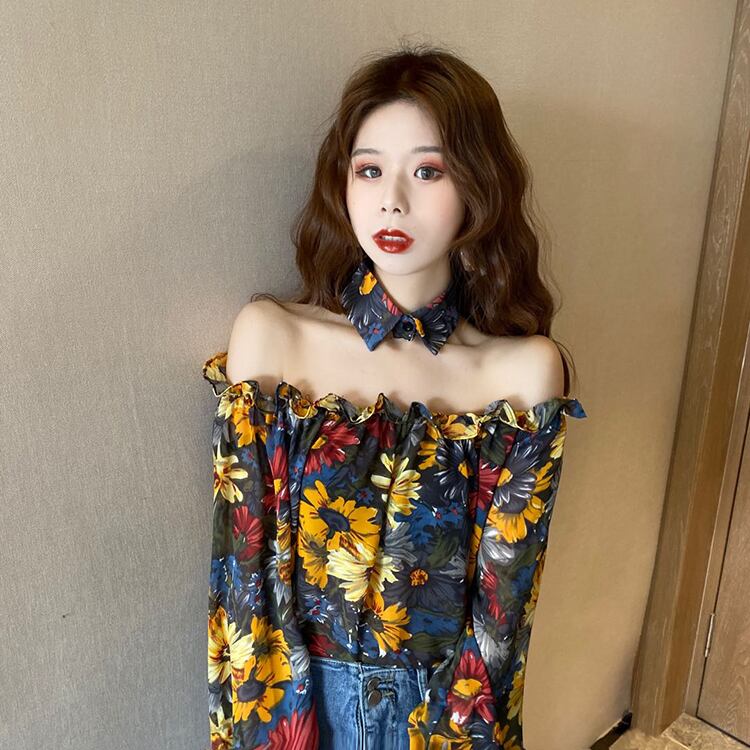 2020年春夏シックなファッションの新しい香港スタイルの花柄パフスリーブオフショルダーレースシャツ+装飾的な蝶ネクタイ YY-ファッション93159637645