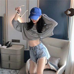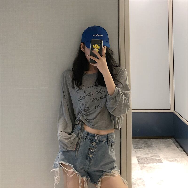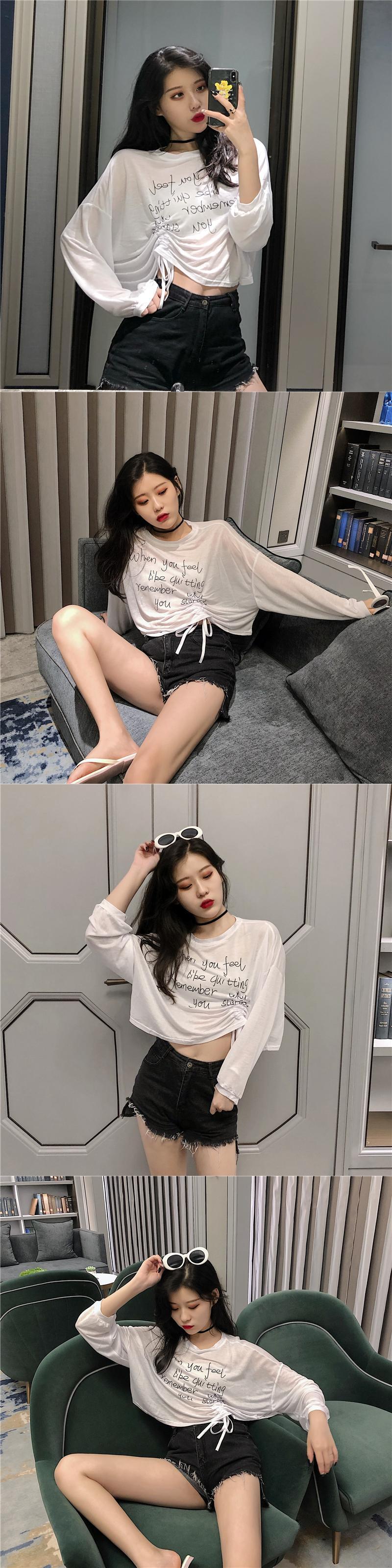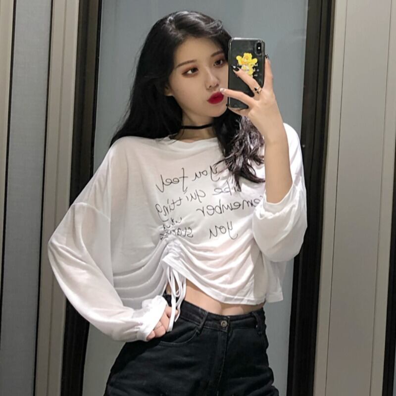 香港スタイルのレトロな薄い短い短い文字の日焼け止めシャツ長袖へそTシャツ巾着プリーツトップ婦人服 YY-ファッション12401453137