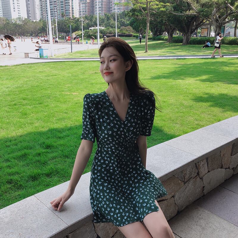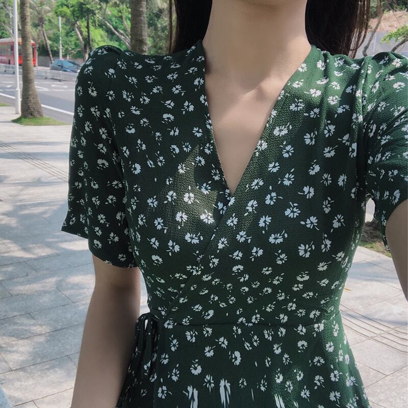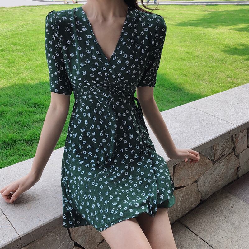 2020年春夏フレンチディープVネックフローラルショートスカートラップアップレースアップウエストドレスシフォンフェアリースカートトレンド YY-ファッション98980958477