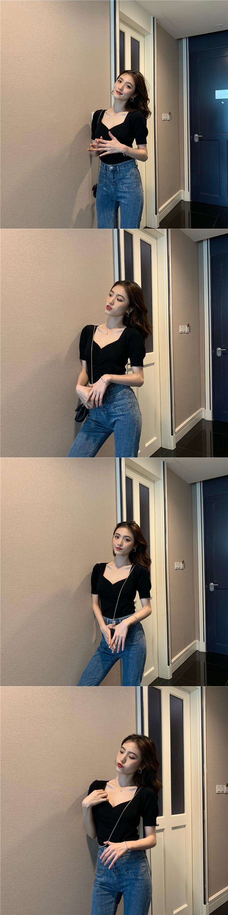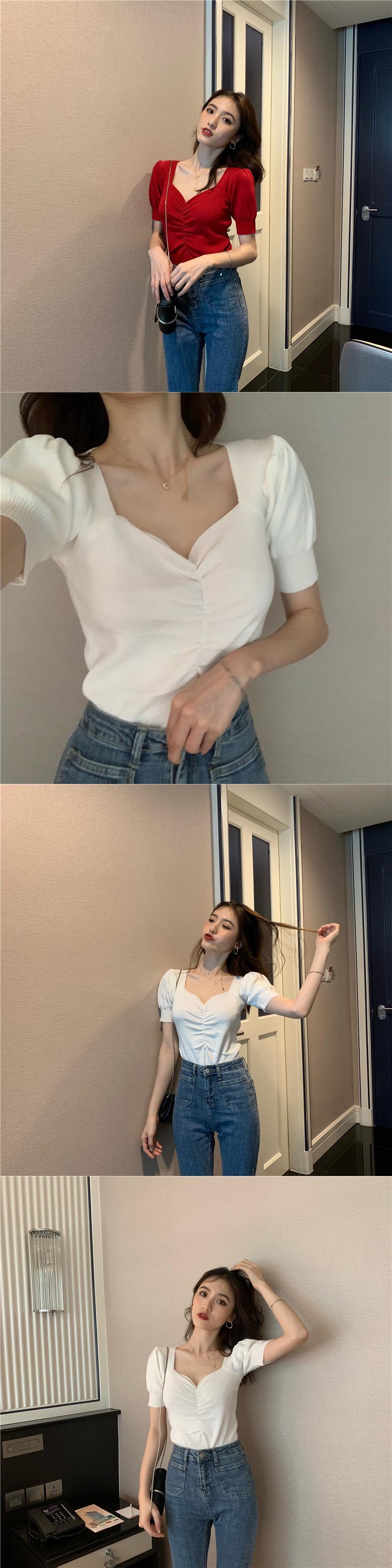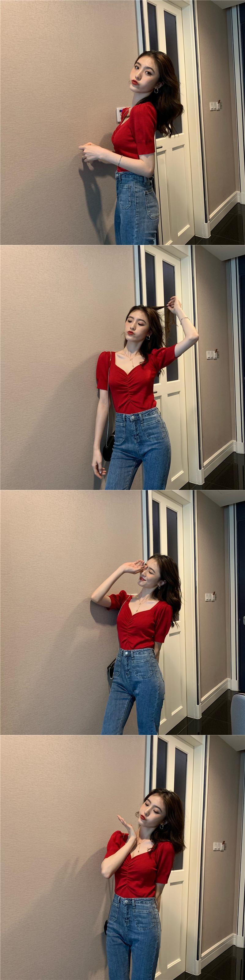 サマーVネックショートトップス レッドセーター Tシャツ 夏物 YY-ファッション49919125055
