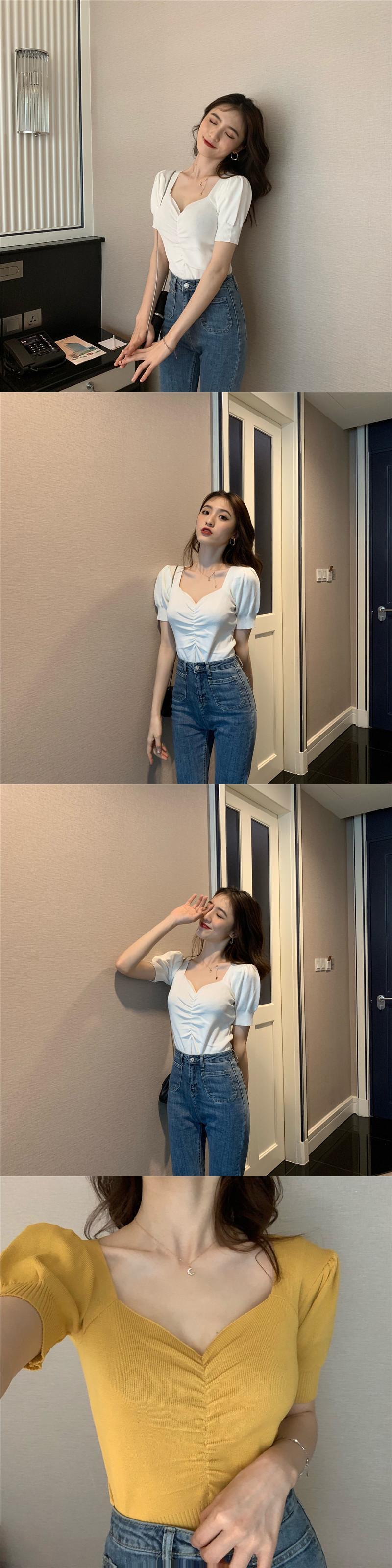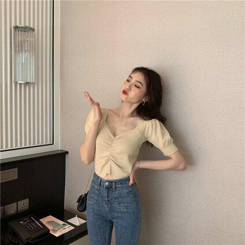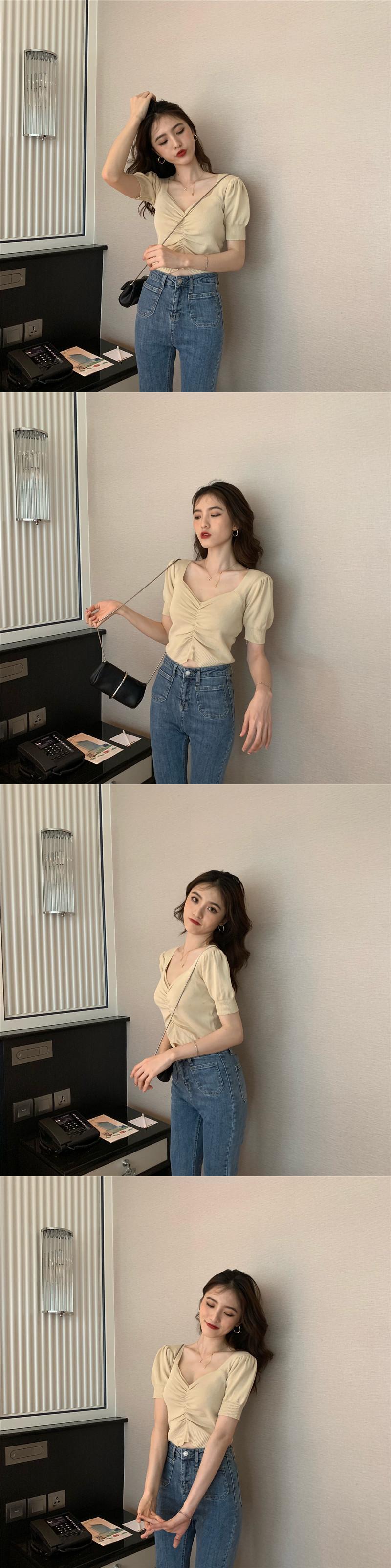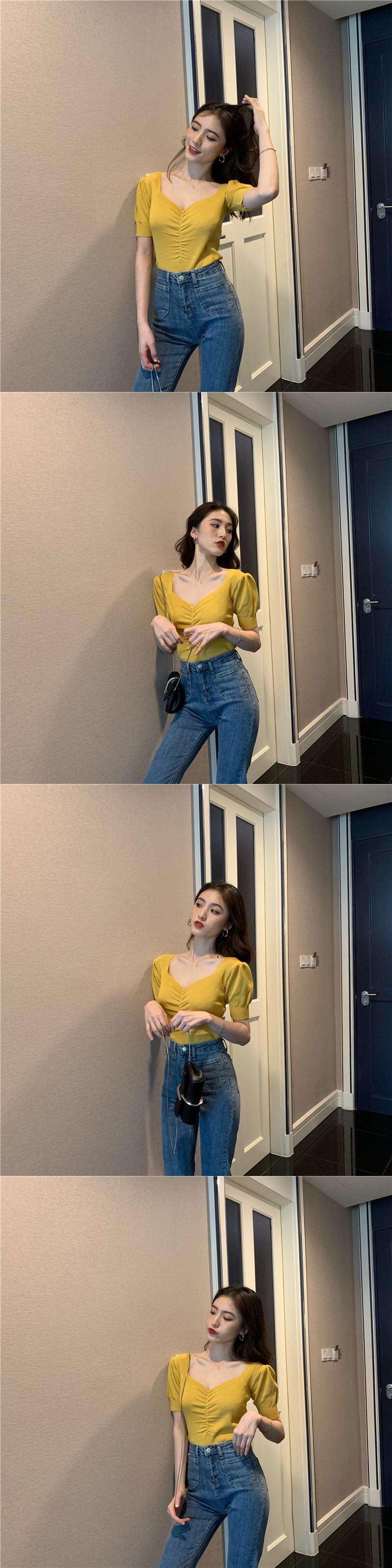 サマーVネックショートトップス レッドセーター Tシャツ 夏物 YY-ファッション49919125055