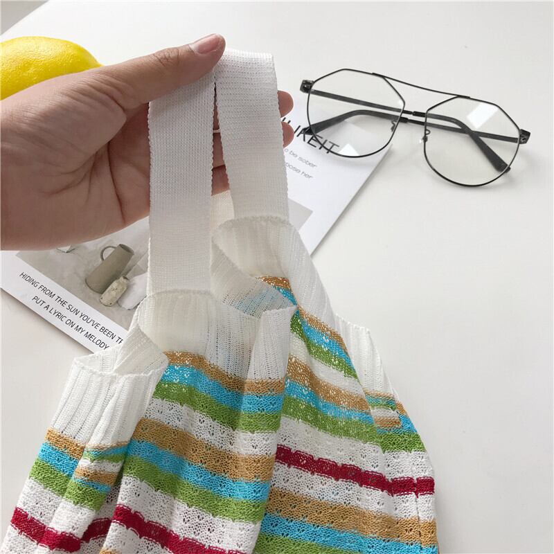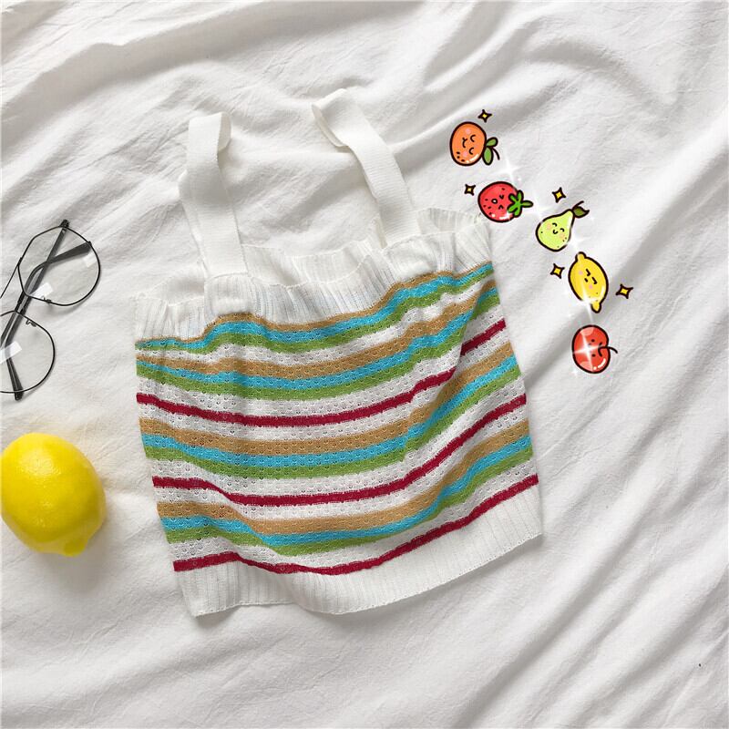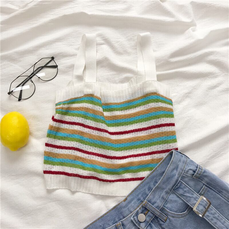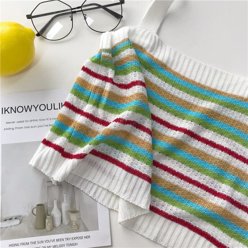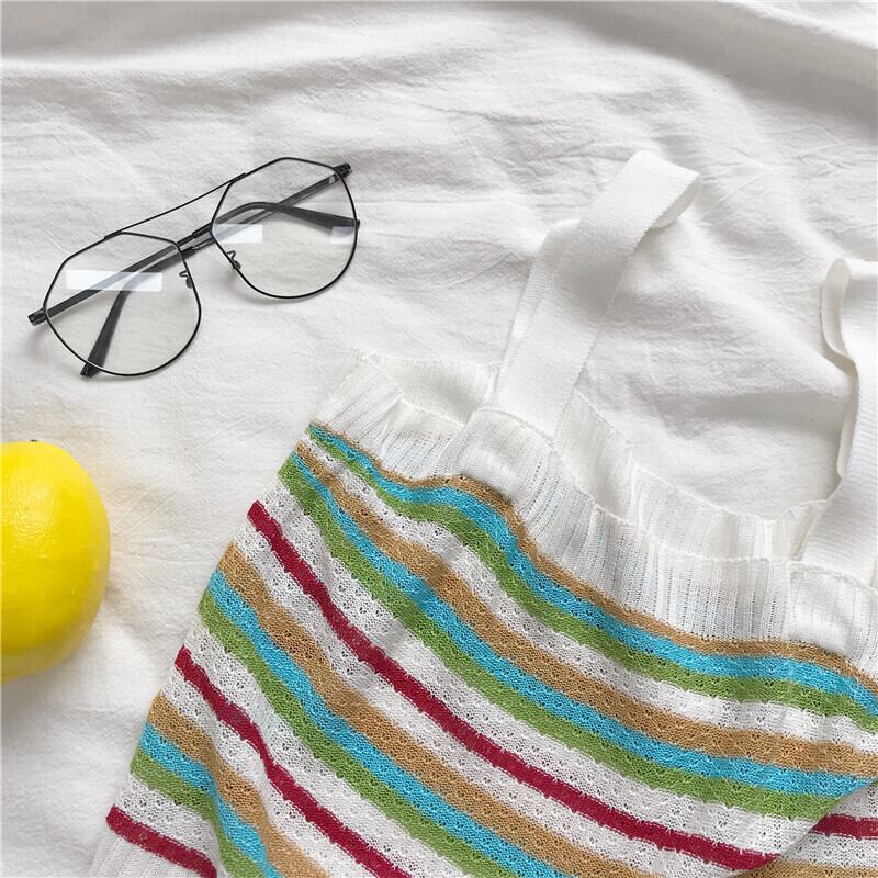 スキームレインボーストライプキャミソールサマーウェアスタイルノースリーブニットボトミングフラットマウスビューティーバックトップ女性 YY-ファッション9010605871