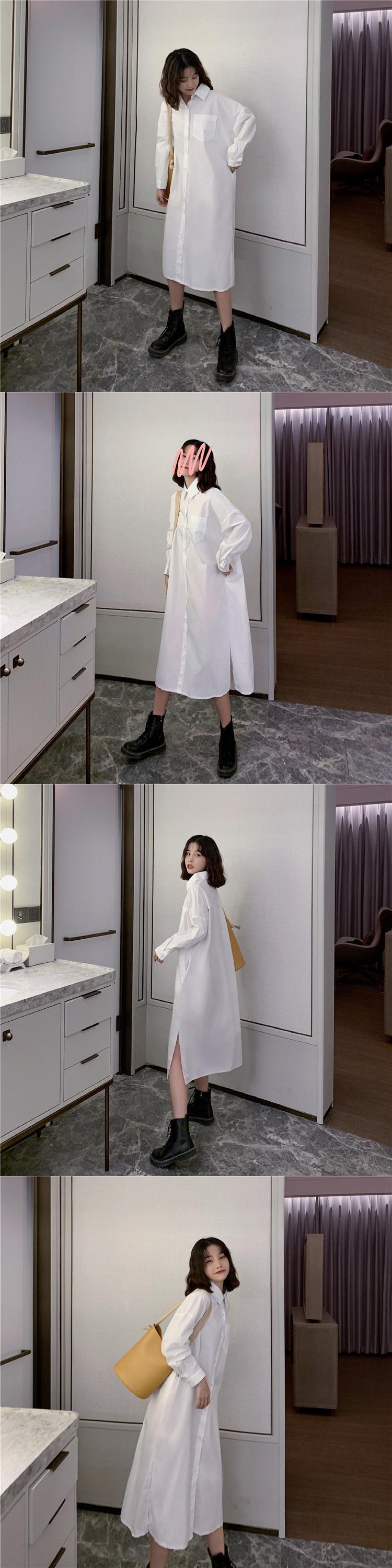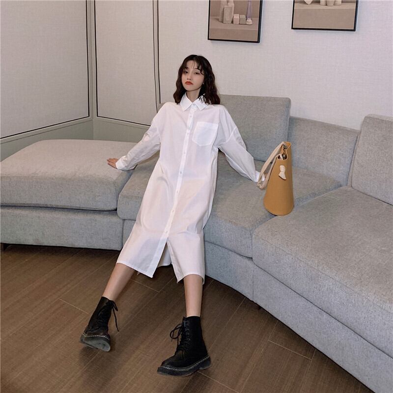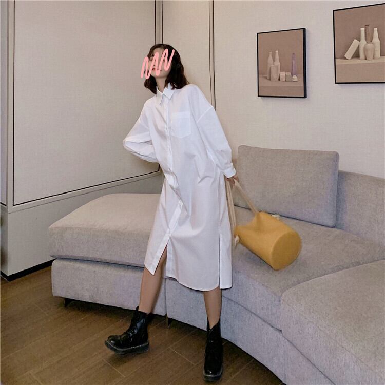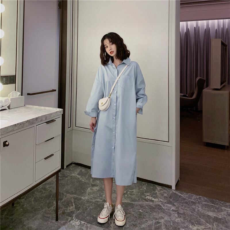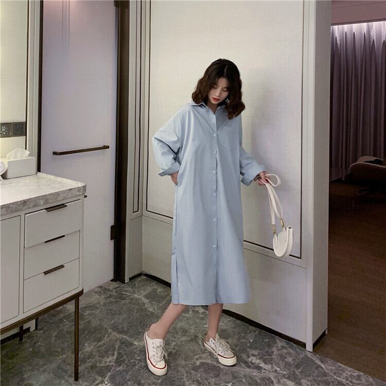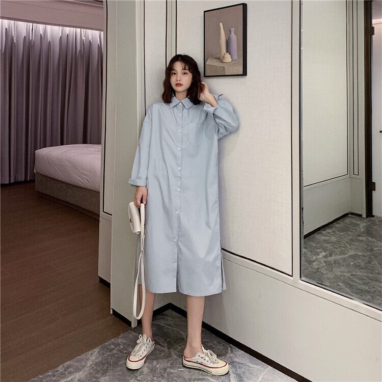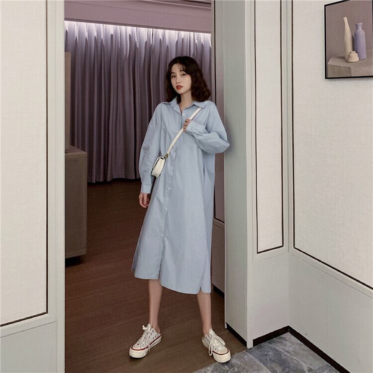 2020年春のシックな新しいファッション膝丈ロングルーズ長袖無地ワイルドシャツドレス女性 YY-ファッション58525248341