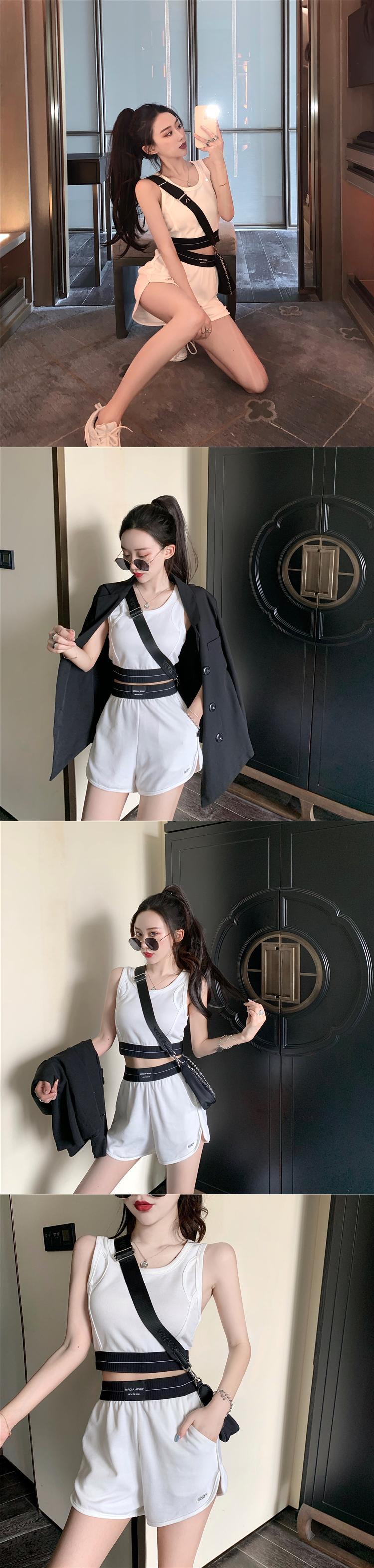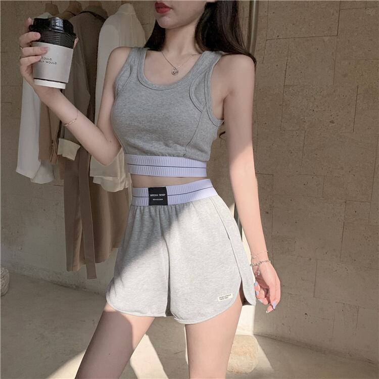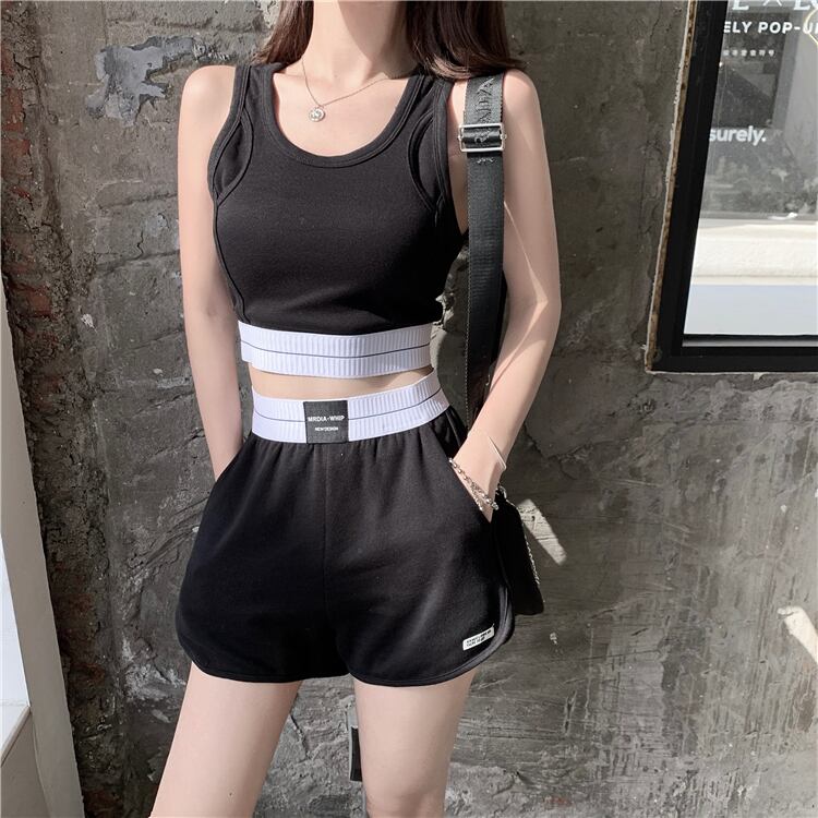 夏の新しいスタイルのスプライシングショートファッションへそスポーツキャミソール+伸縮性ウエストシンショーツスーツ女性 YY-ファッション39972055916