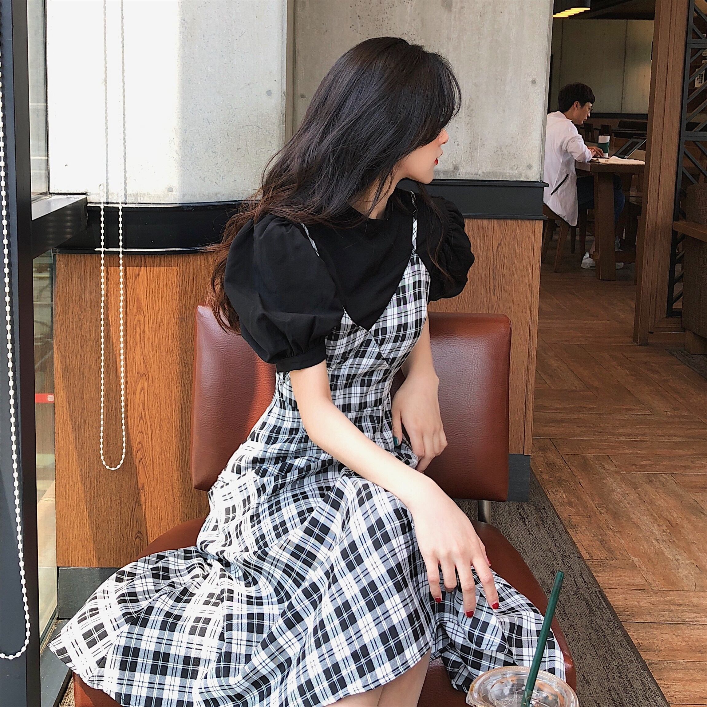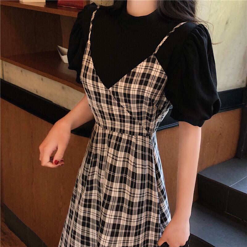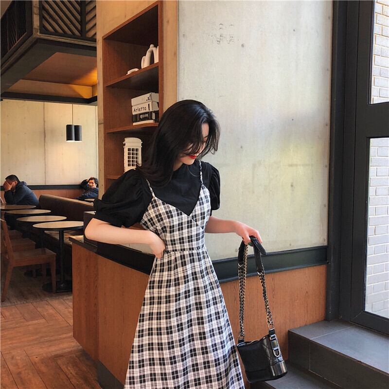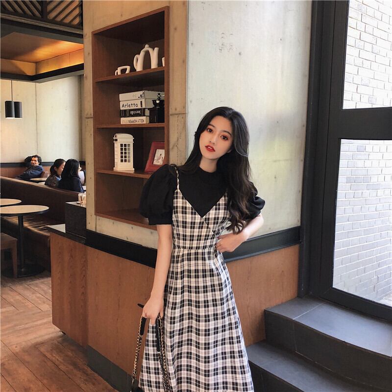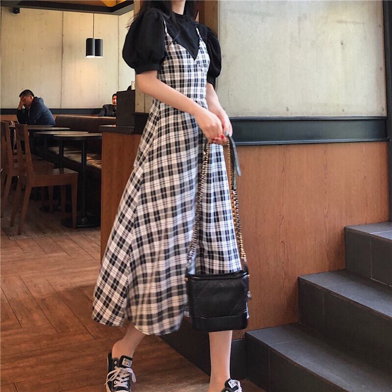フレンチロングスカート2020年初春新作レトロチェック柄サスペンダーワンピースレディース気質ウエストAラインスカート YY-ファッション82882629415