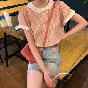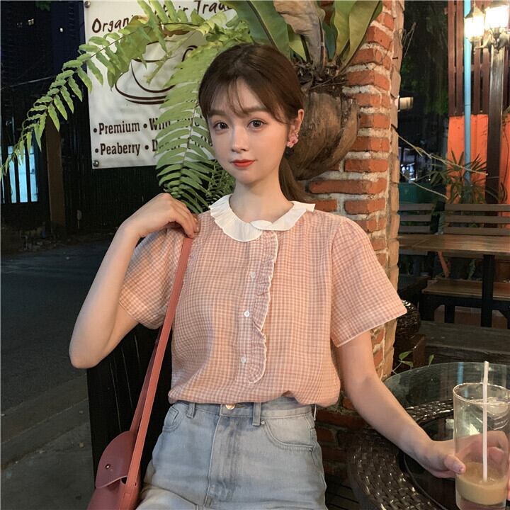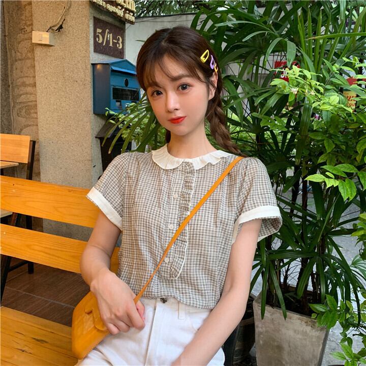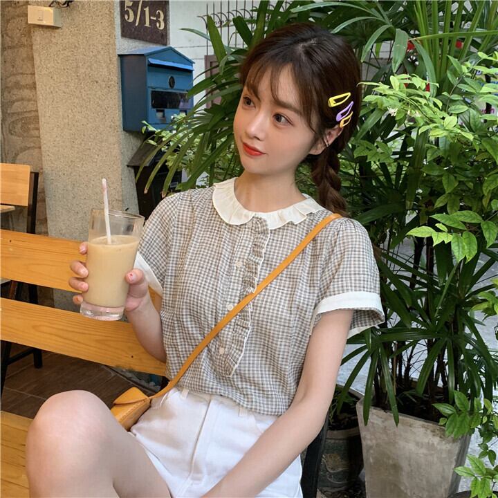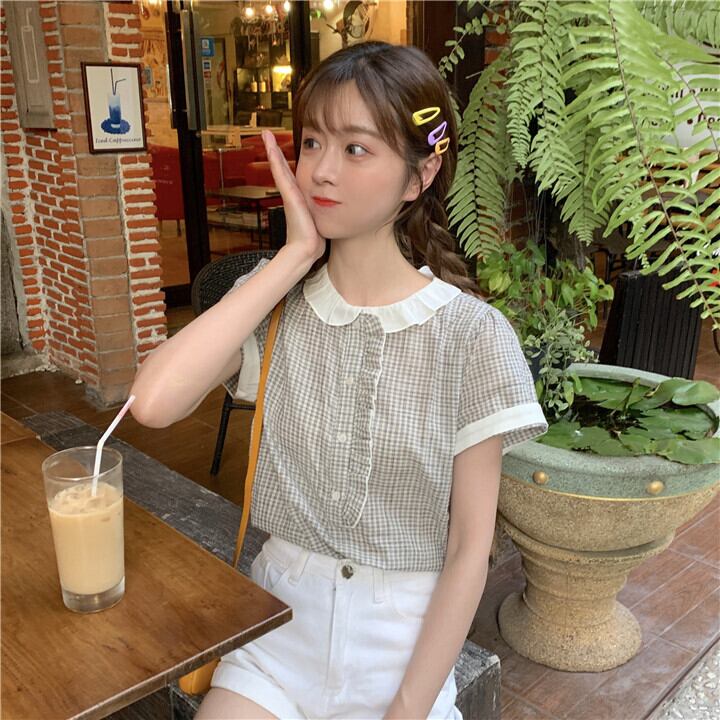 夏バージョン2020新しいかわいい花びらの襟千鳥格子デザインシャツ女子学生半袖シャツトレンド YY-ファッション4074773069