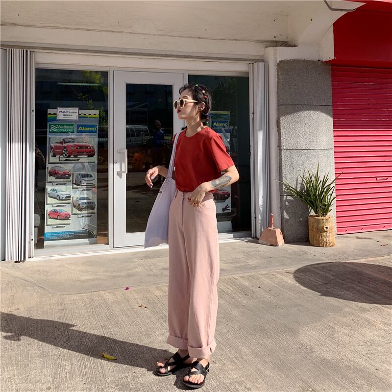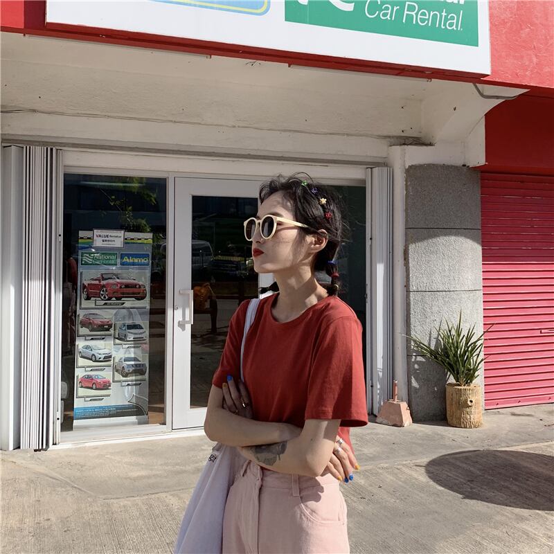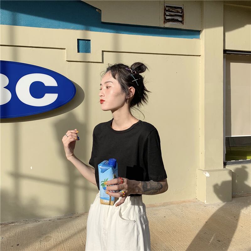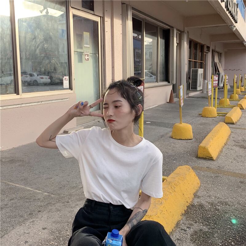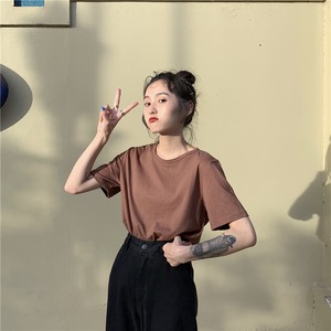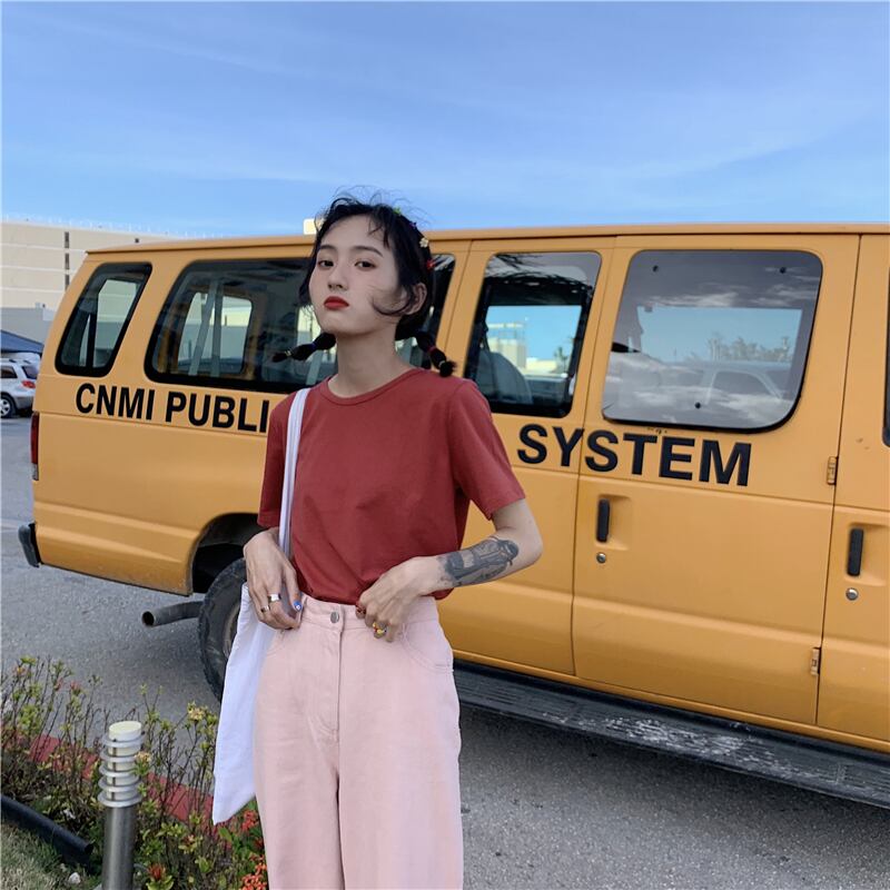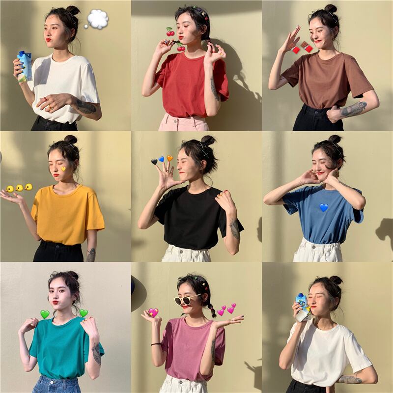 夏の新しいシックなシンプルな無地のラウンドネック半袖Tシャツ女性のワイルドルーストップ学生プライマーTシャツ YY-ファッション4420922458