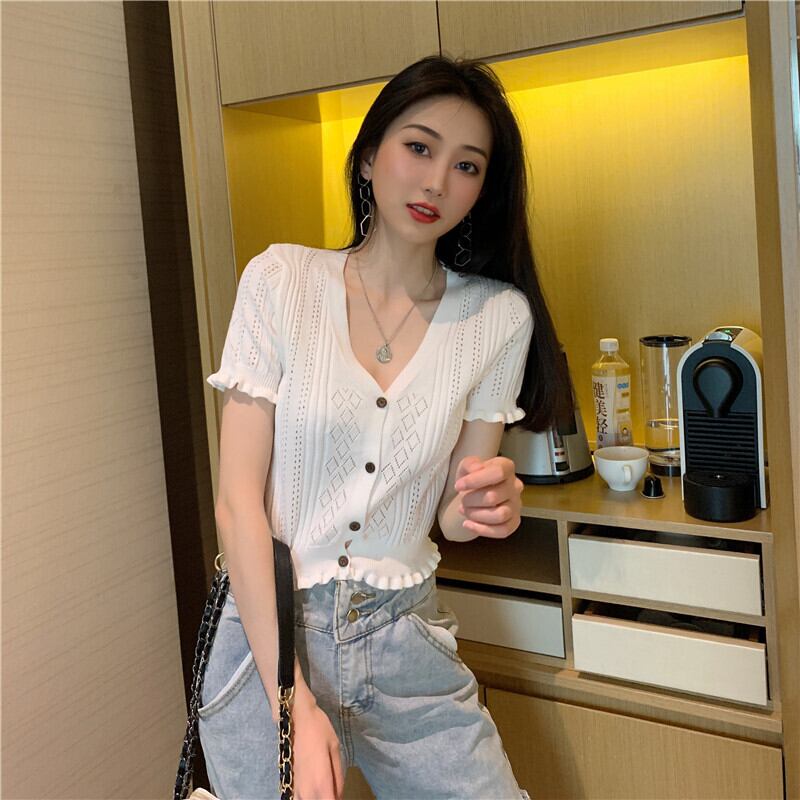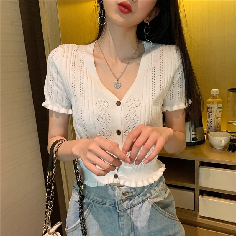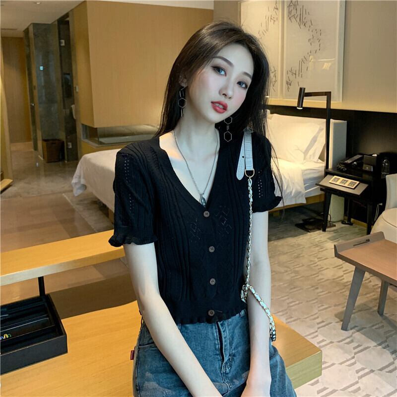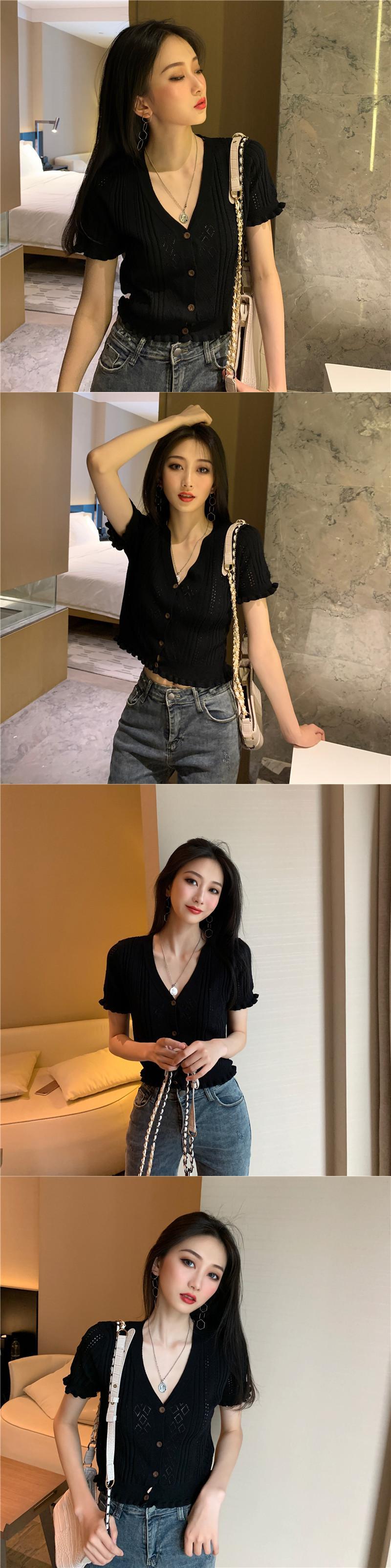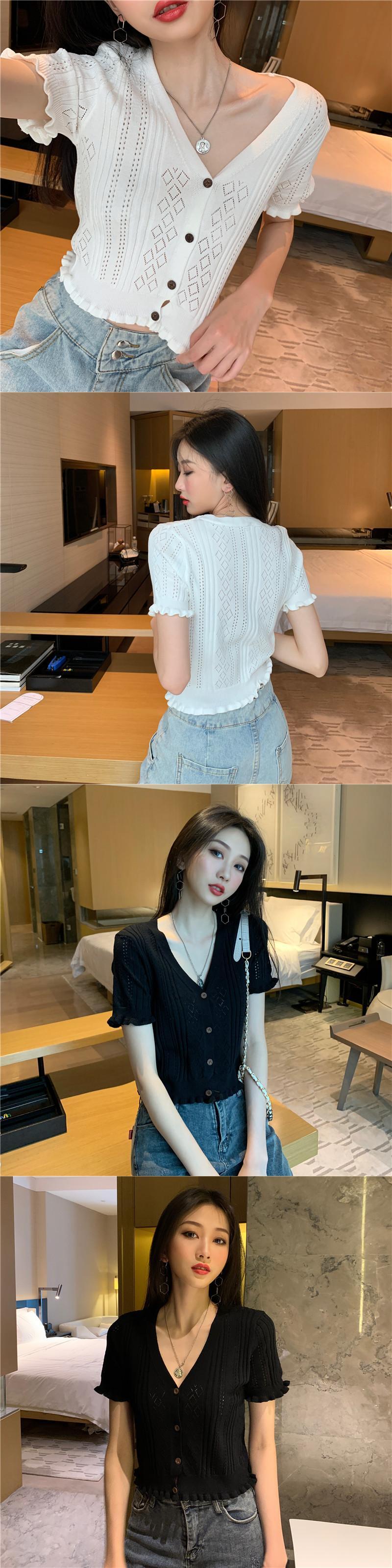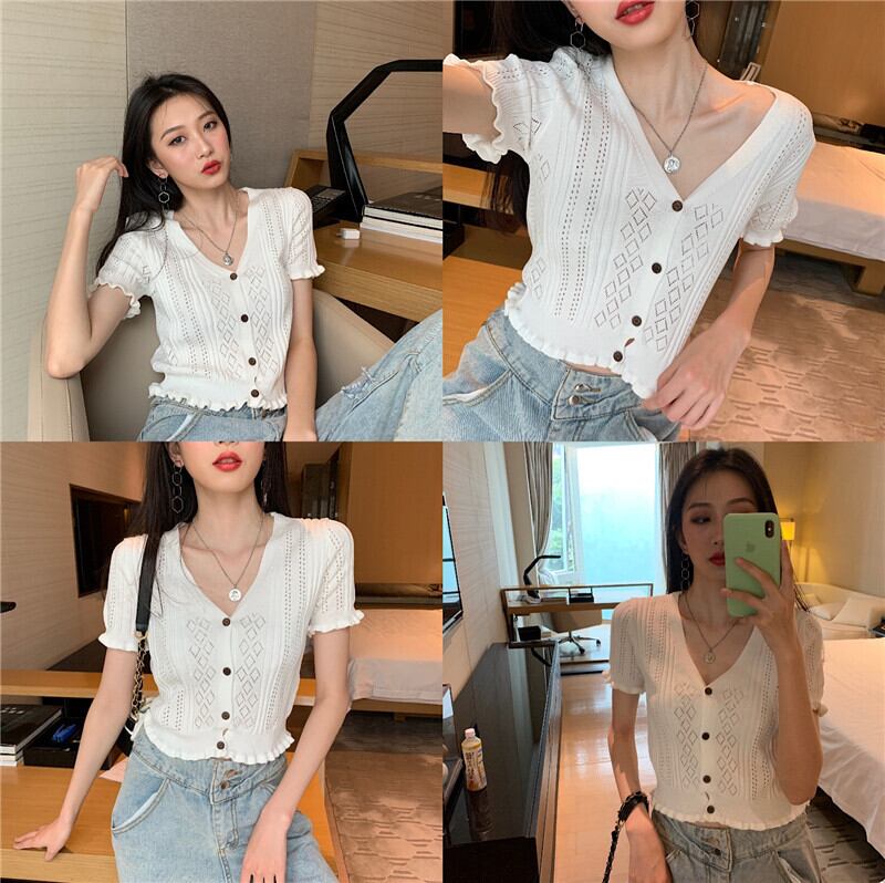 春と夏の新しいシックなレトロなVネックワイルドショートへそトップ、中空の薄いニットTシャツの潮 YY-ファッション97396917310