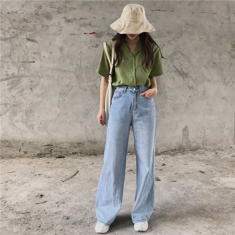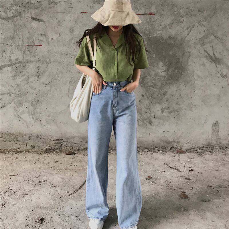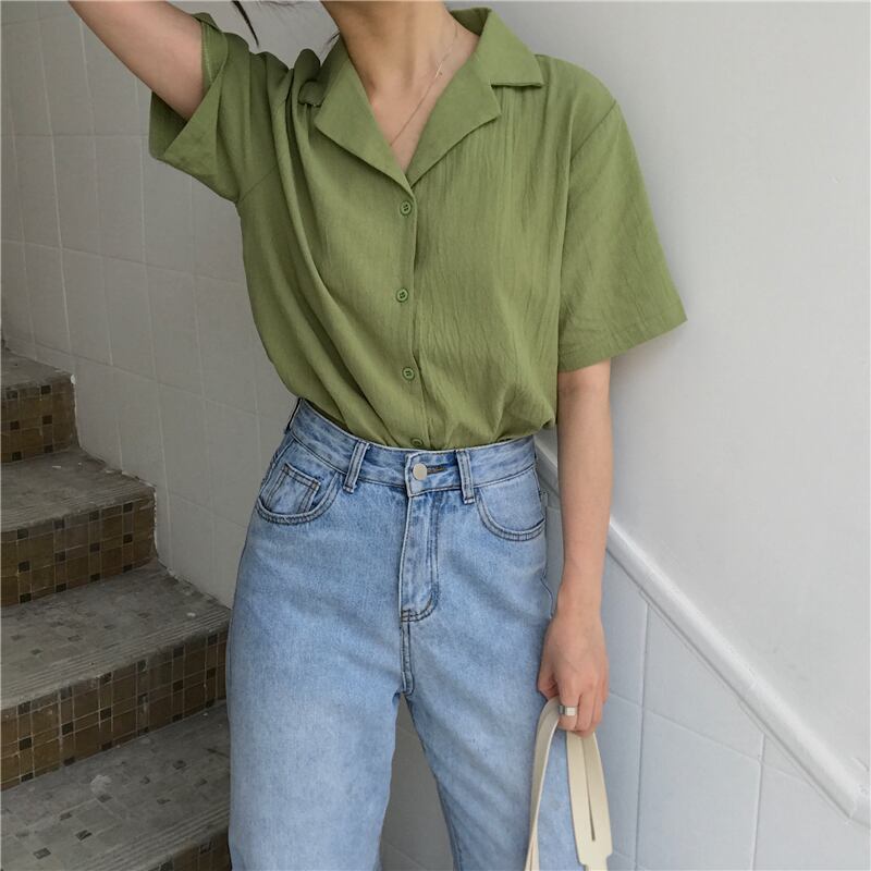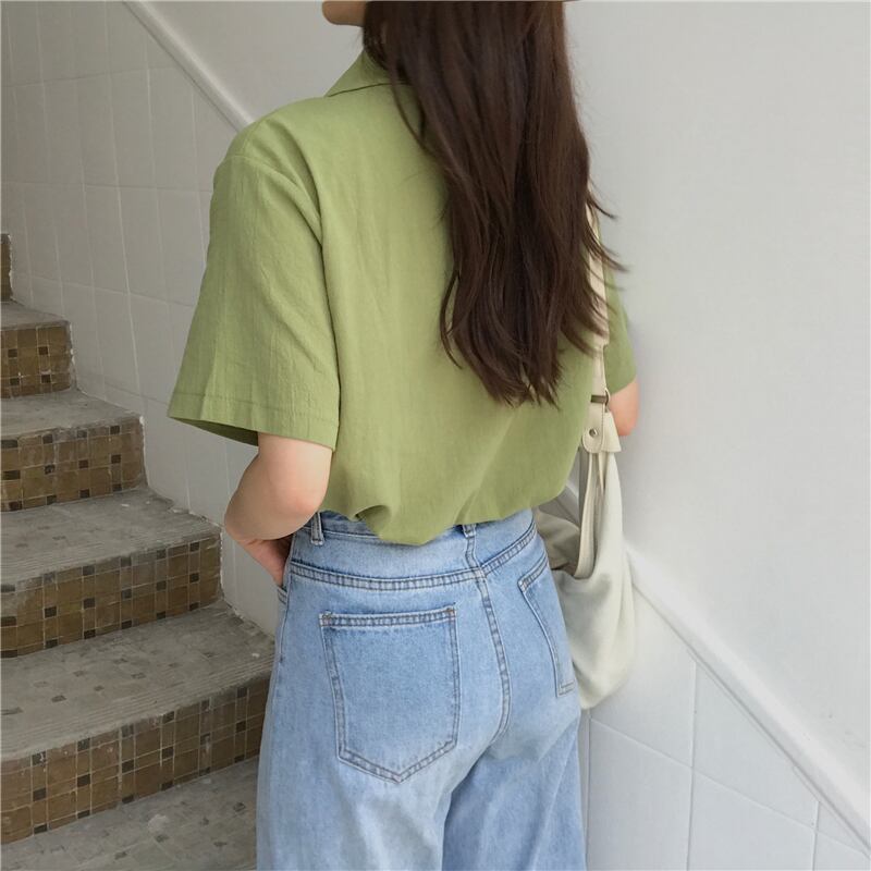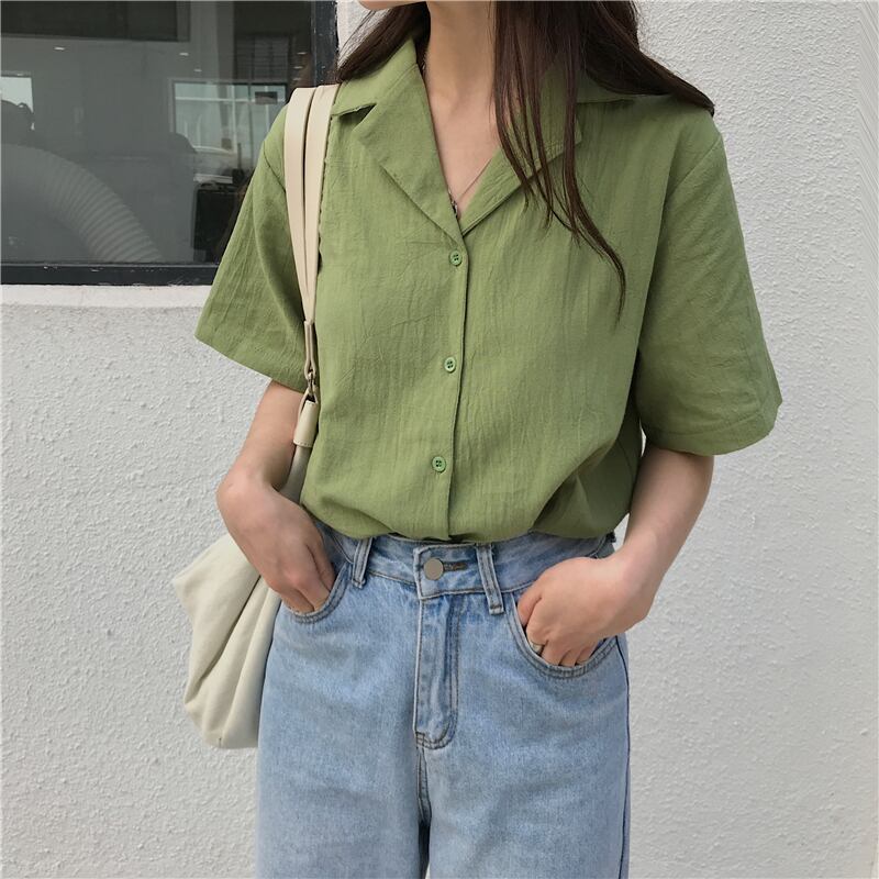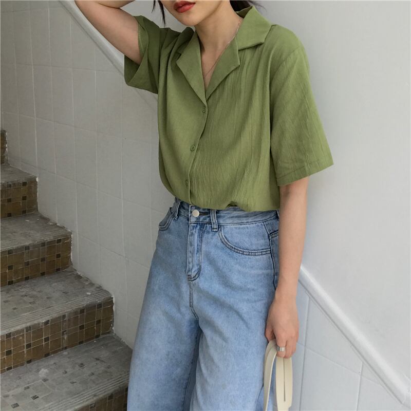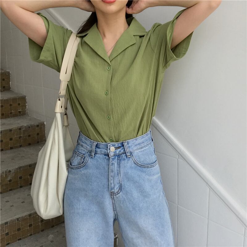 2020年初春バージョンのシックなファッションレトロフルーツグリーンホワイトルーズで薄いオールマッチの無地半袖シャツトップ YY-ファッション401492245