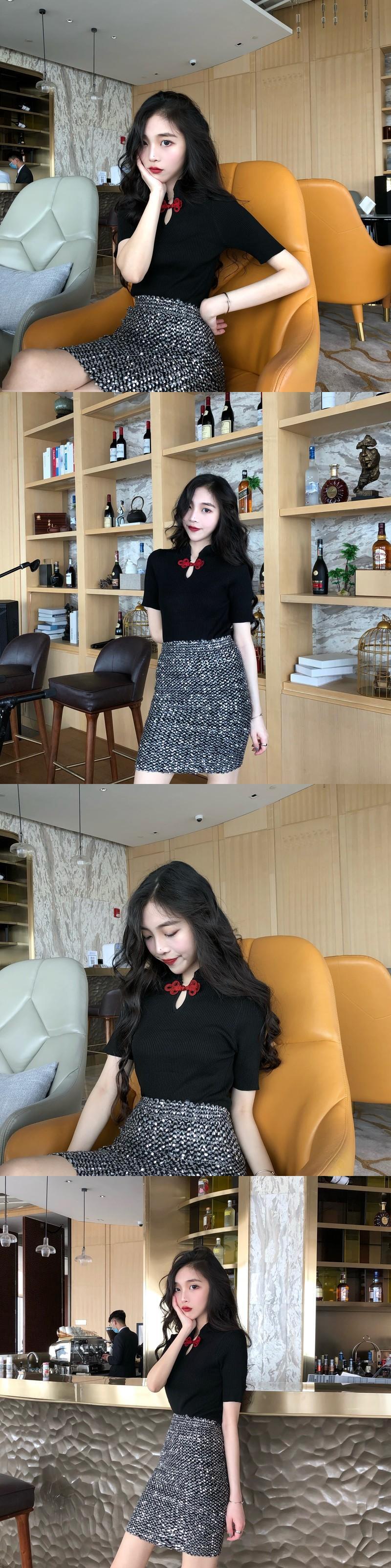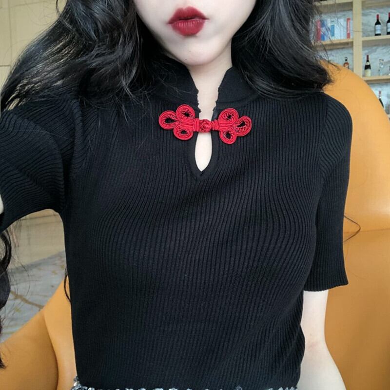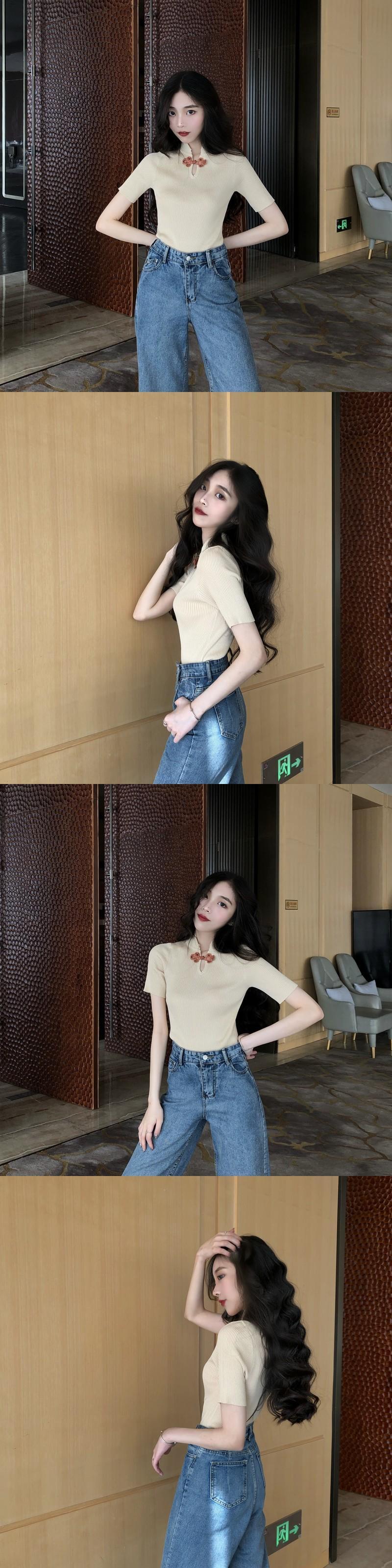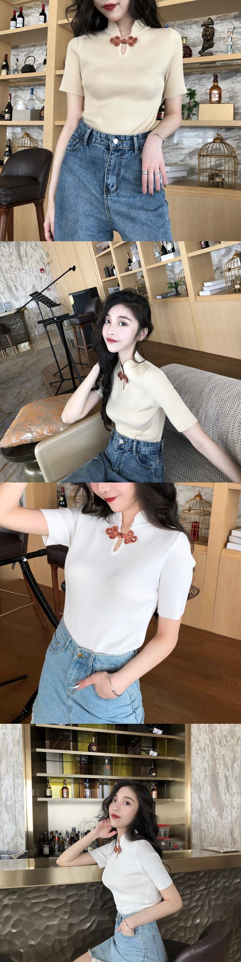 2020年春夏新作レディースレトロスリムオールマッチチャイナカラーニットインナーバックルボトミングシャツ半袖セーター YY-ファッション64800388957
