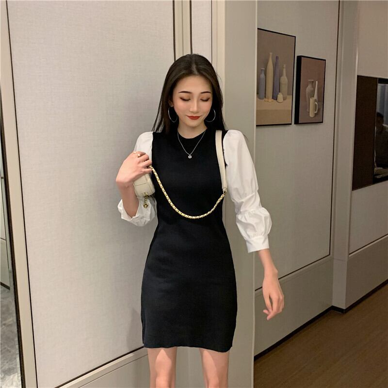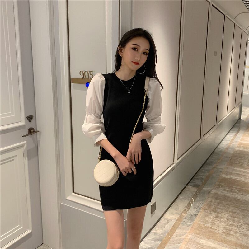 ネットレッドレトロパフスリーブステッチ長袖ドレス女性2020新しいウエストニットバッグヒップショートスカートリトルブラックドレス YY-ファッション22122137503