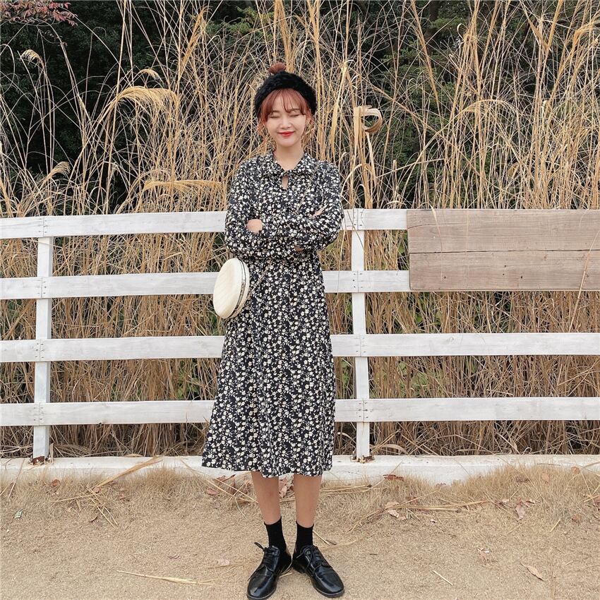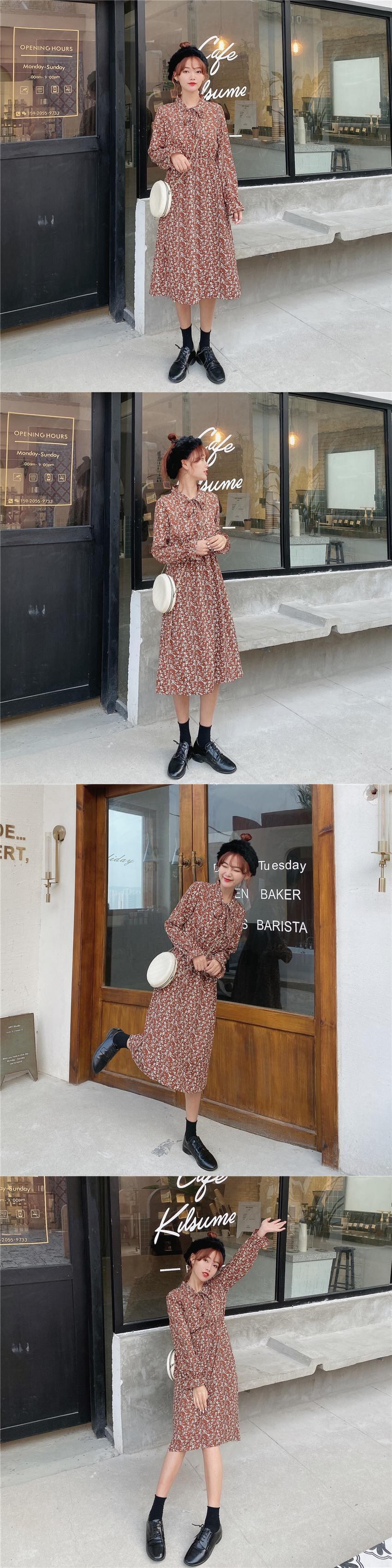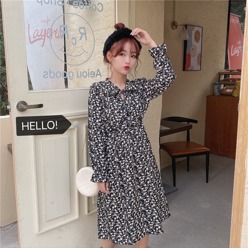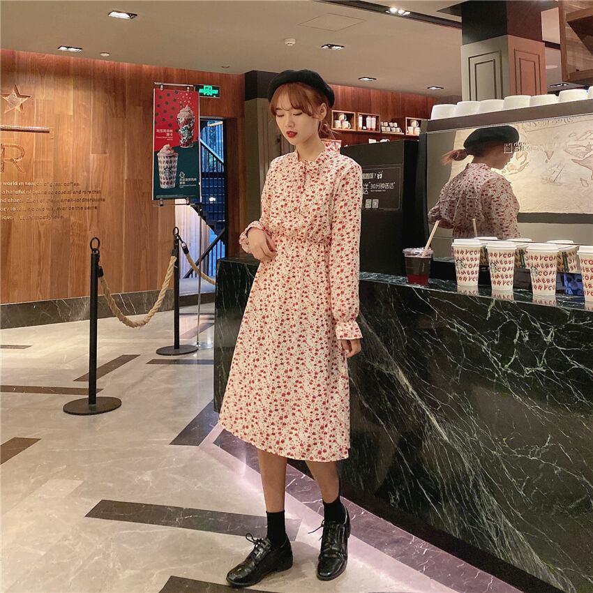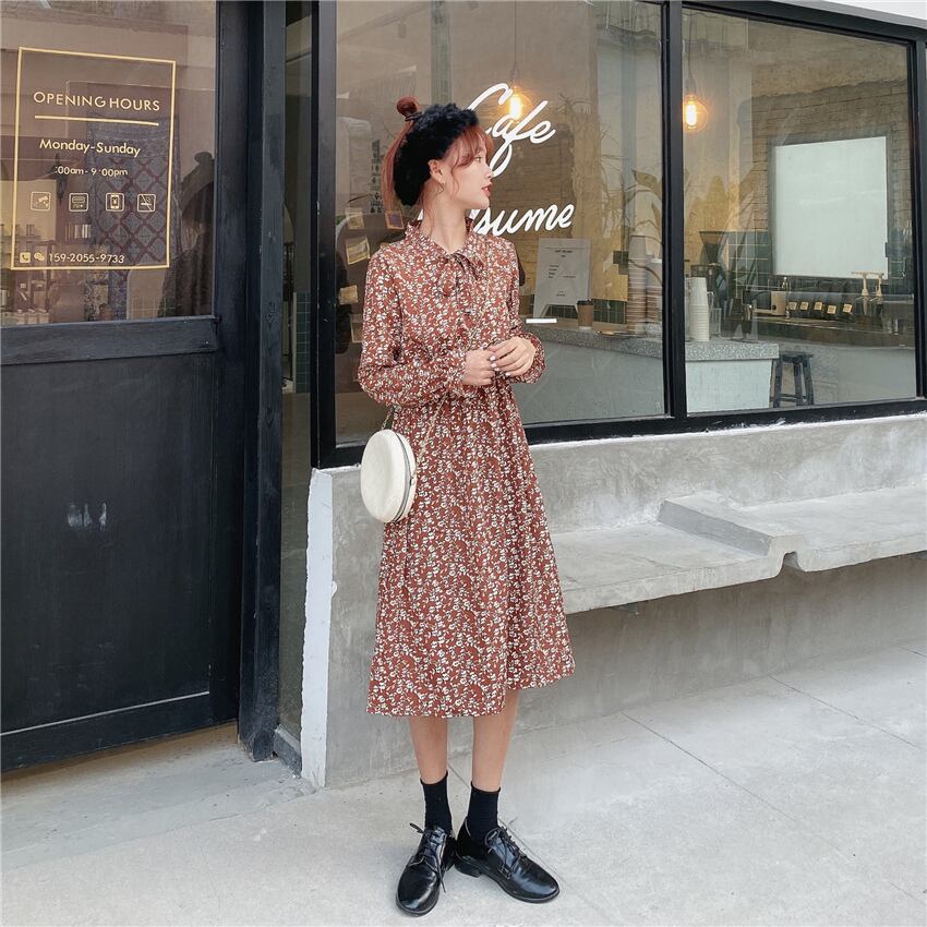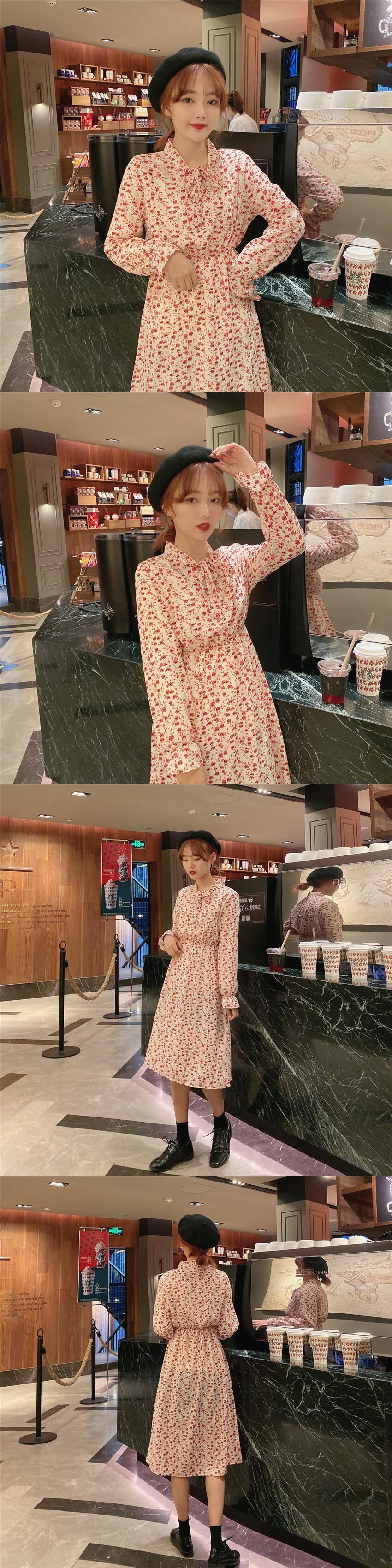 シックな新しいファッションレトロな小さな花柄のスカートの女性の気質のウエスト-膝のドレスの2020年春バージョン YY-ファッション52374423683