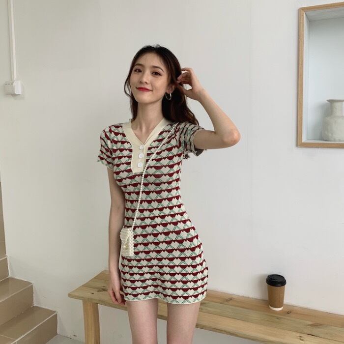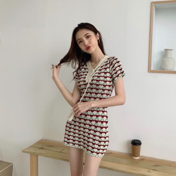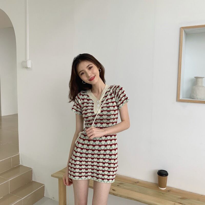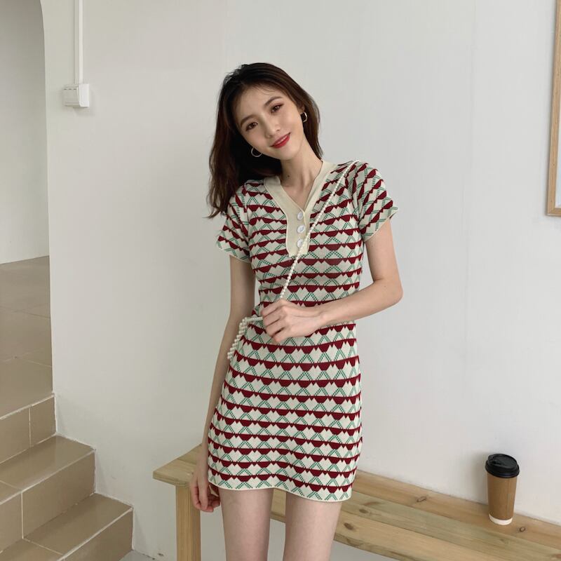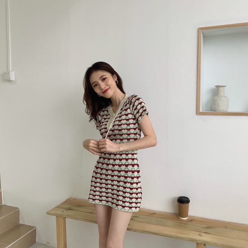 2020年夏新作スタイル薄気質ショートスカートジャカード半袖薄ニットワンピース女性Vネックスリム YY-ファッション55565208477