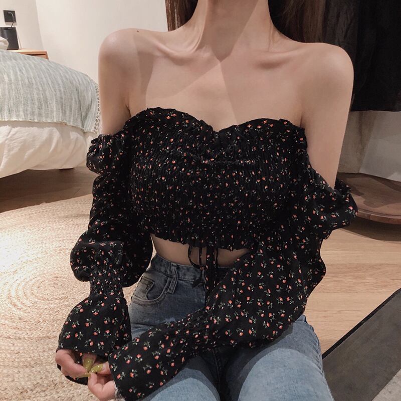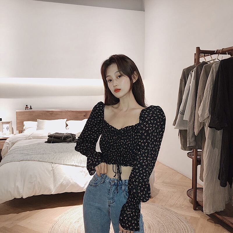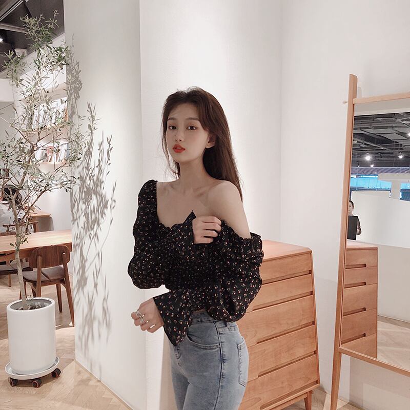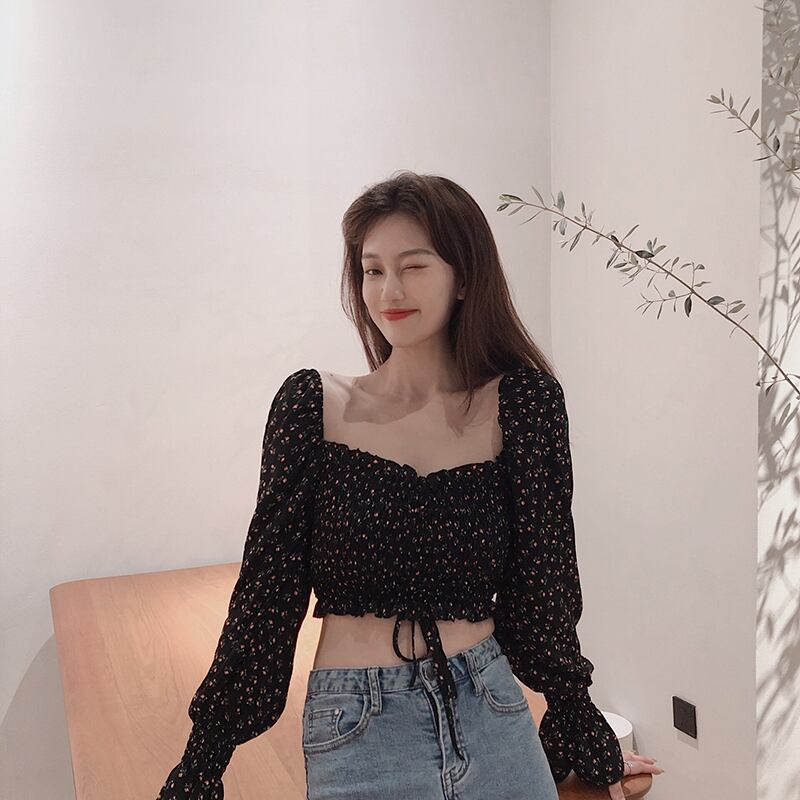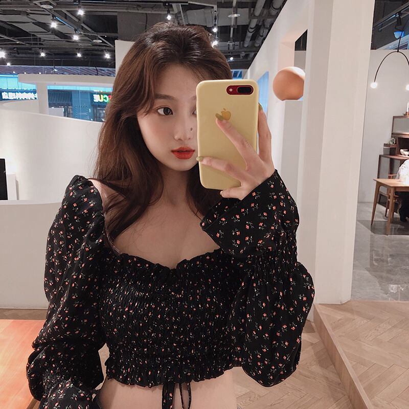 シックなファッションの2020年初春バージョンブラックフローラル菌パフスリーブ長袖ネクタイシャツシフォントップ女性 YY-ファッション33414030471