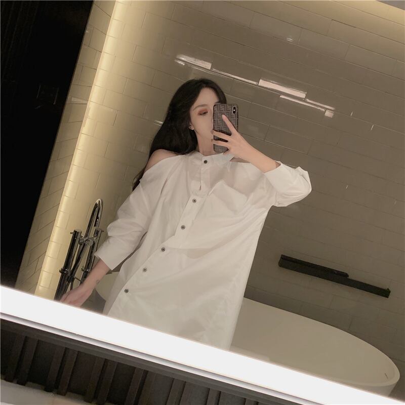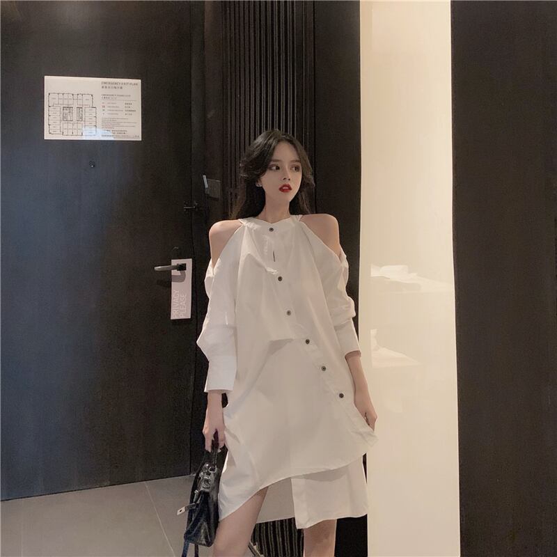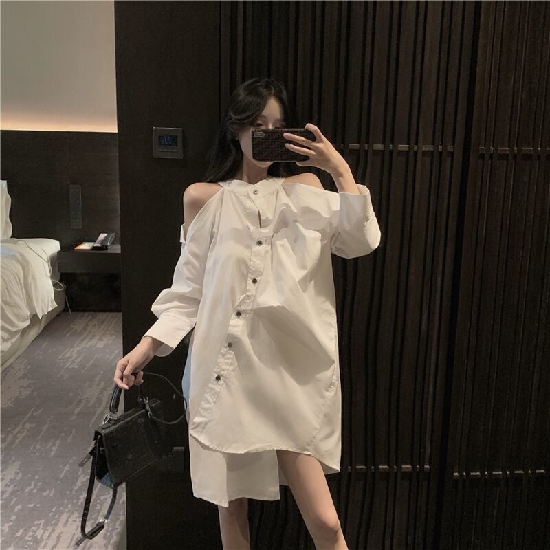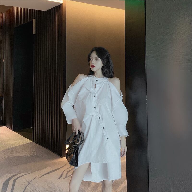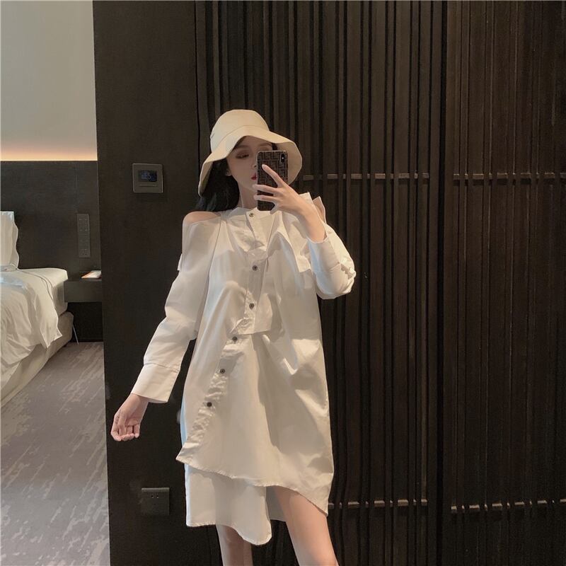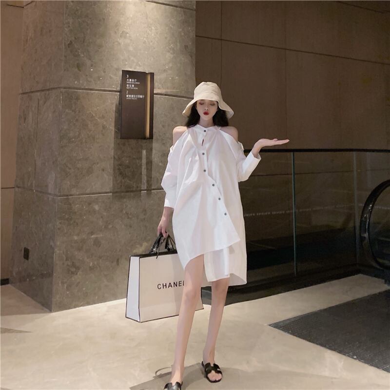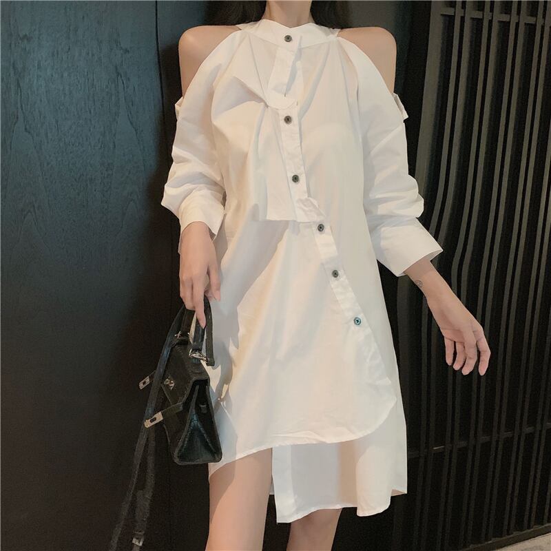 オフショルダーイレギュラーシャツレディース2020夏新作ファッション丁寧マシンピュアカラーシングルブレストミドル丈ワンピース YY-ファッション87503965682