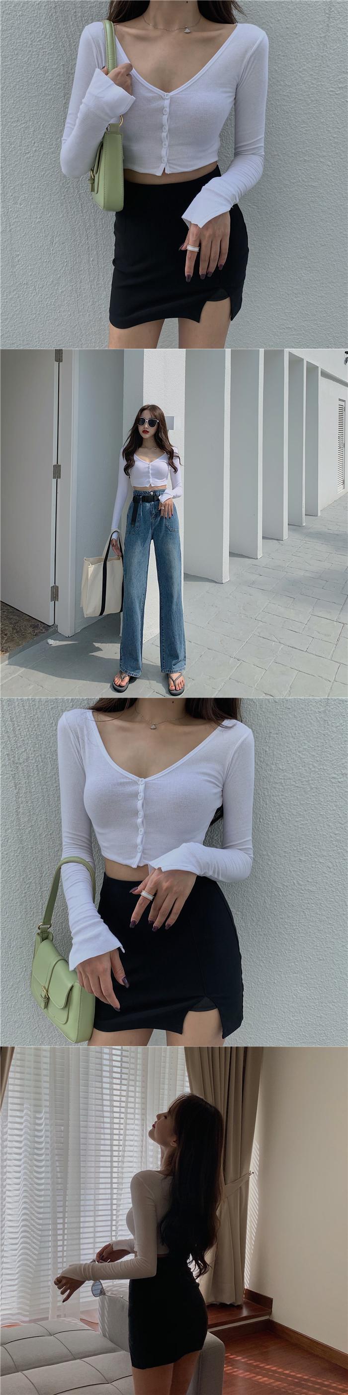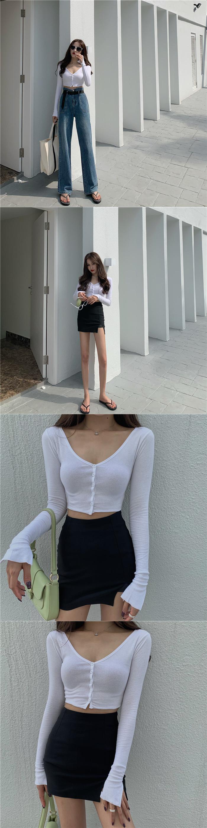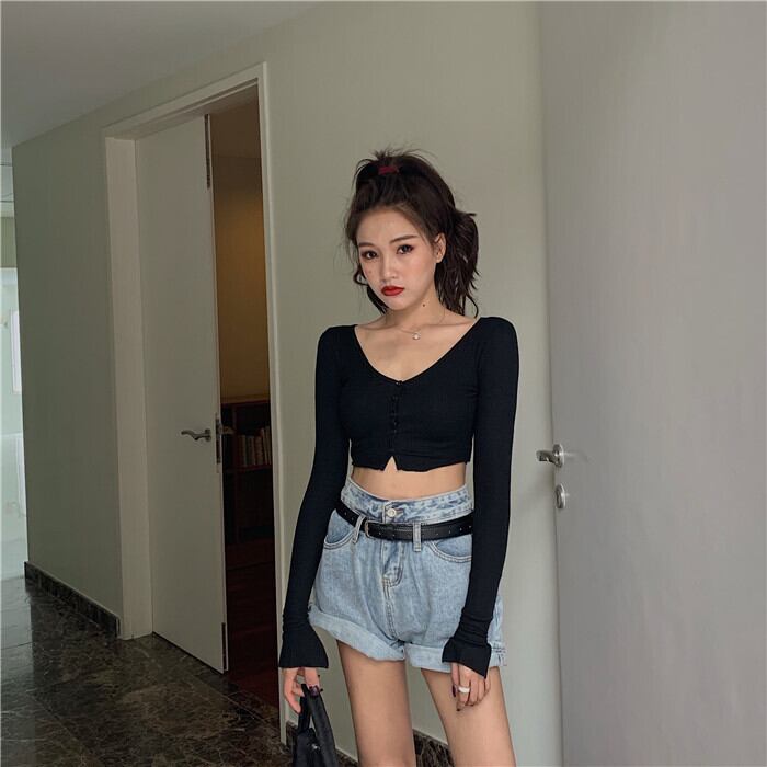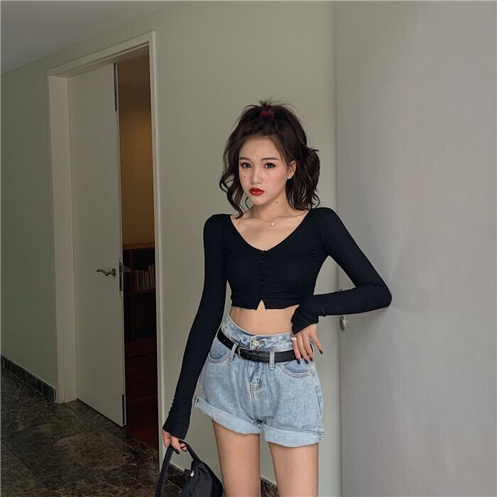 ショートタイトフィット長袖VネックホワイトTシャツレディース2020年秋冬新作スリムフレンチインナートップボトミングシャツトレンド YY-ファッション1188239513