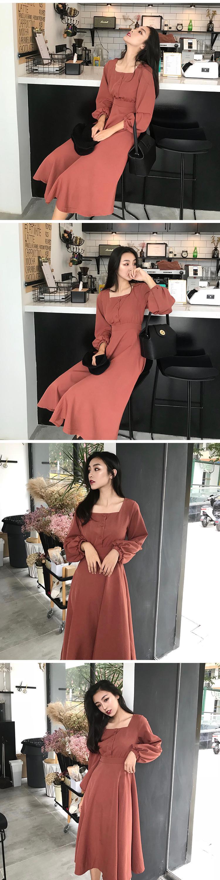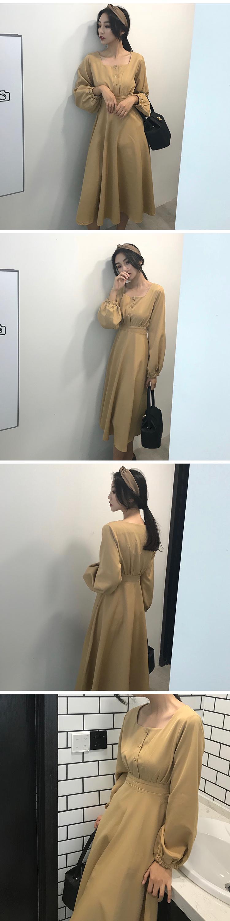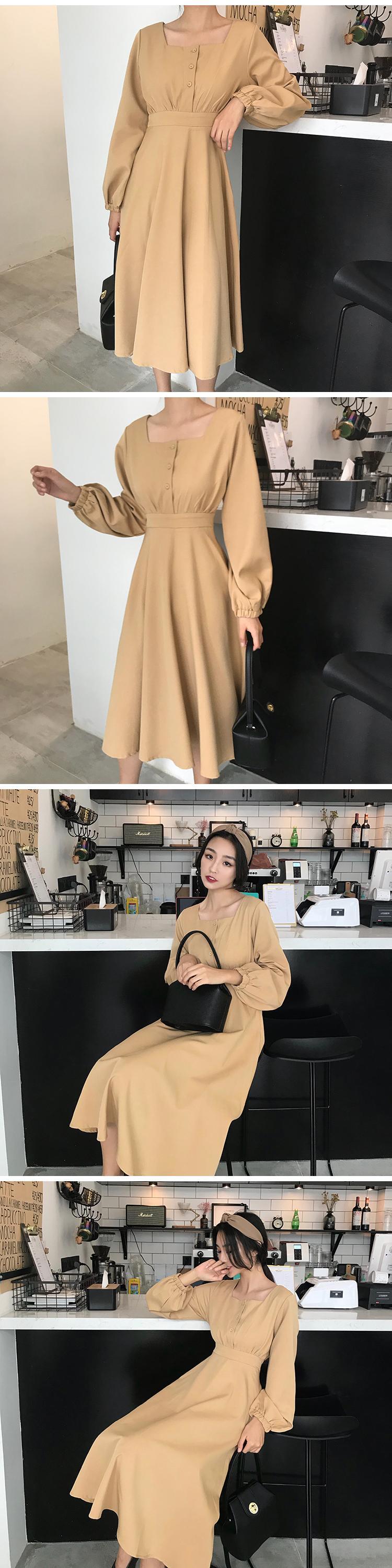 3つのボタンと大きなスイングスカート、ワイルドウエスト、ランタンスリーブ、無地、香港の味、シックな気質、スクエアカラーの女性を備えたミドル丈のドレス YY-ファッション69972428863