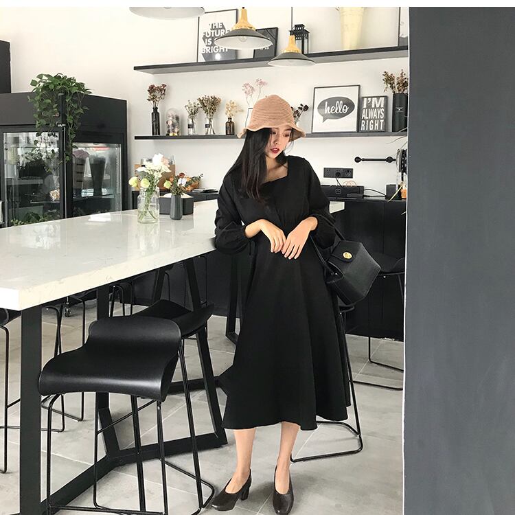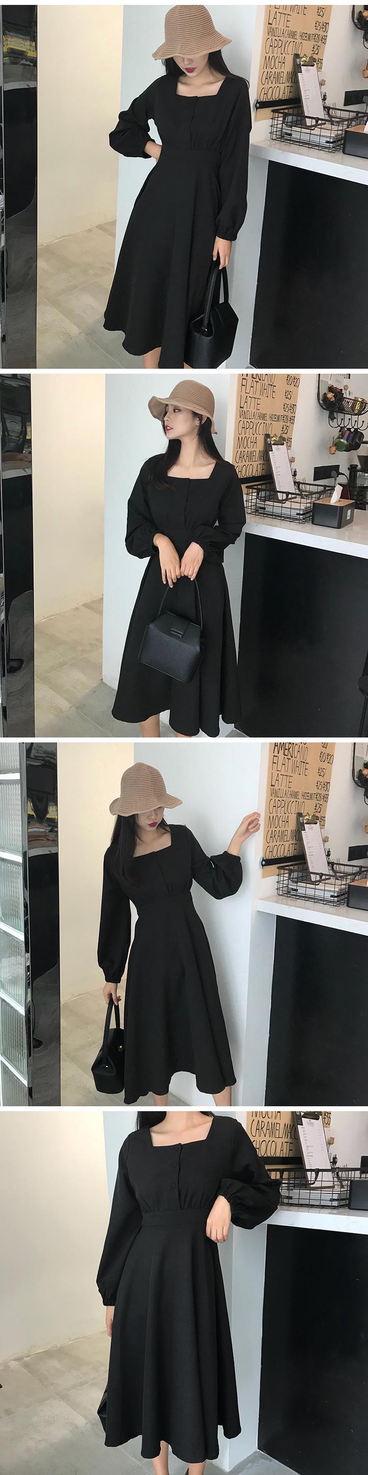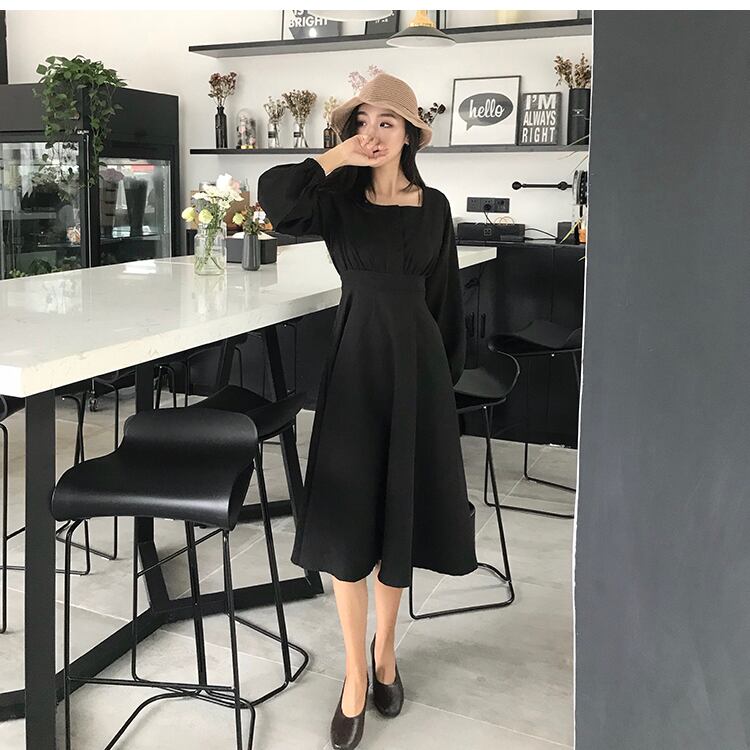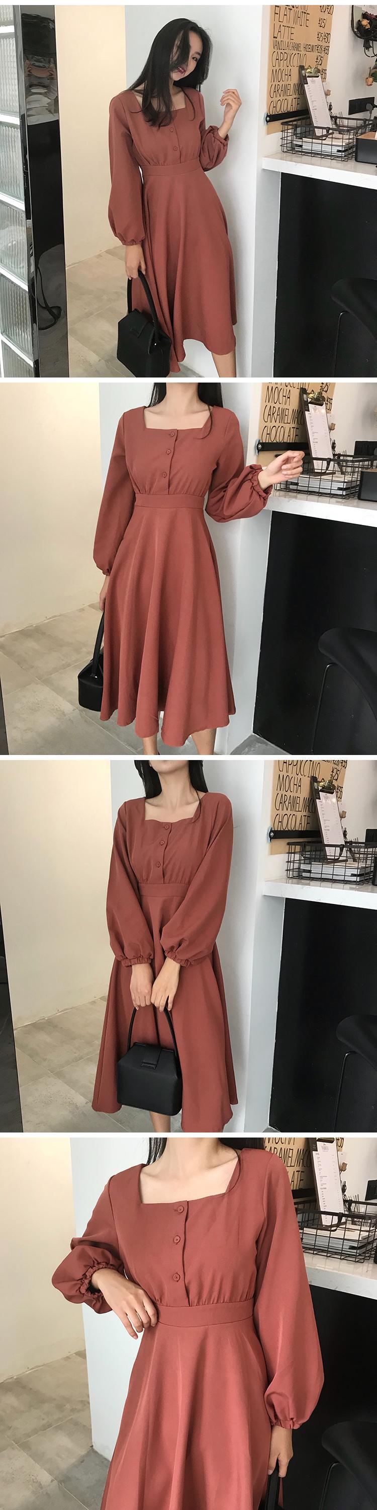 3つのボタンと大きなスイングスカート、ワイルドウエスト、ランタンスリーブ、無地、香港の味、シックな気質、スクエアカラーの女性を備えたミドル丈のドレス YY-ファッション69972428863