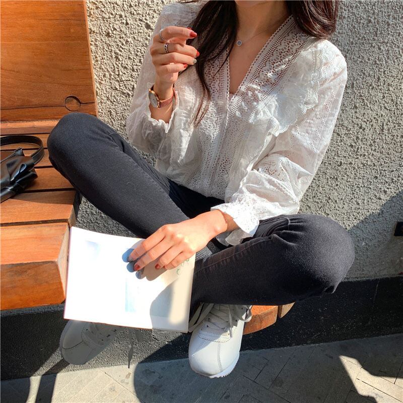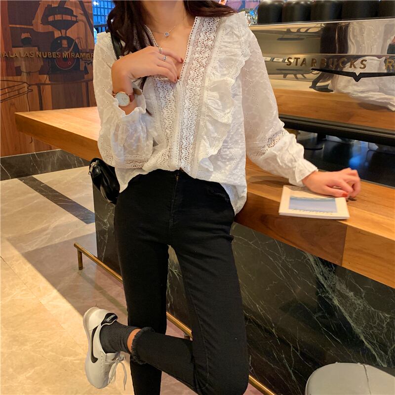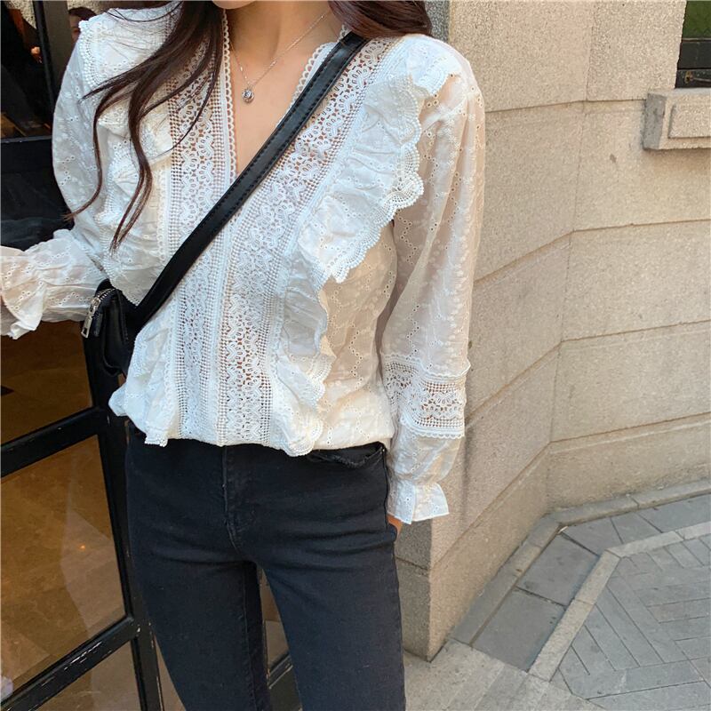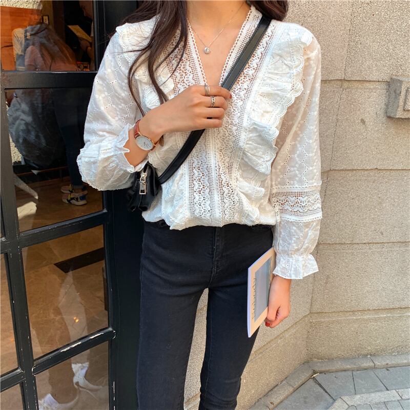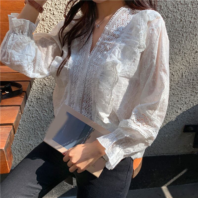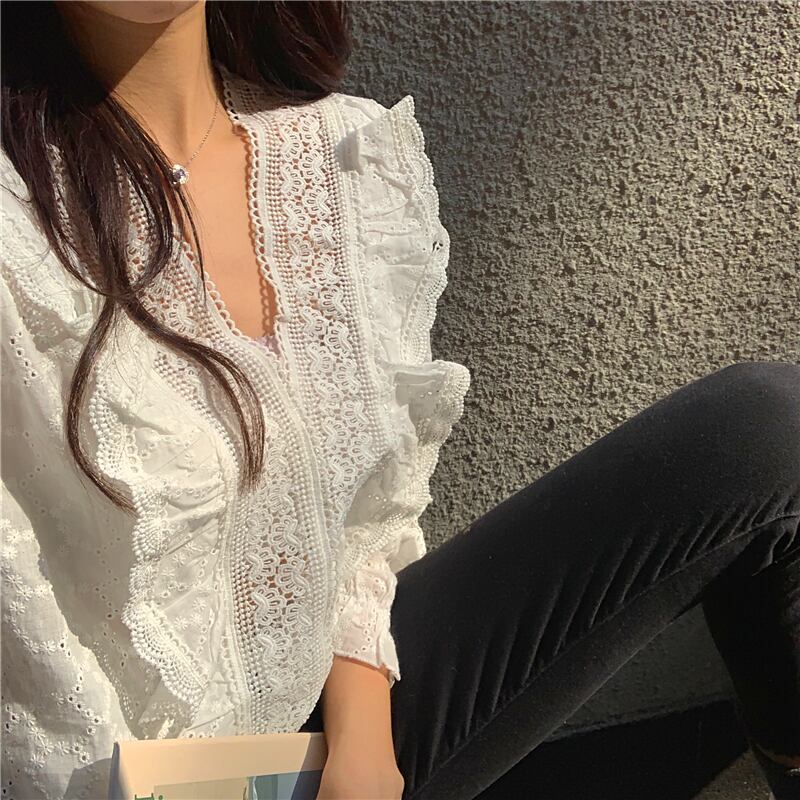 シックな新しい薄いレトロなワイルドVネック中空かぎ針編みレースシャツシャツの2020年夏バージョン YY-ファッション49573765260