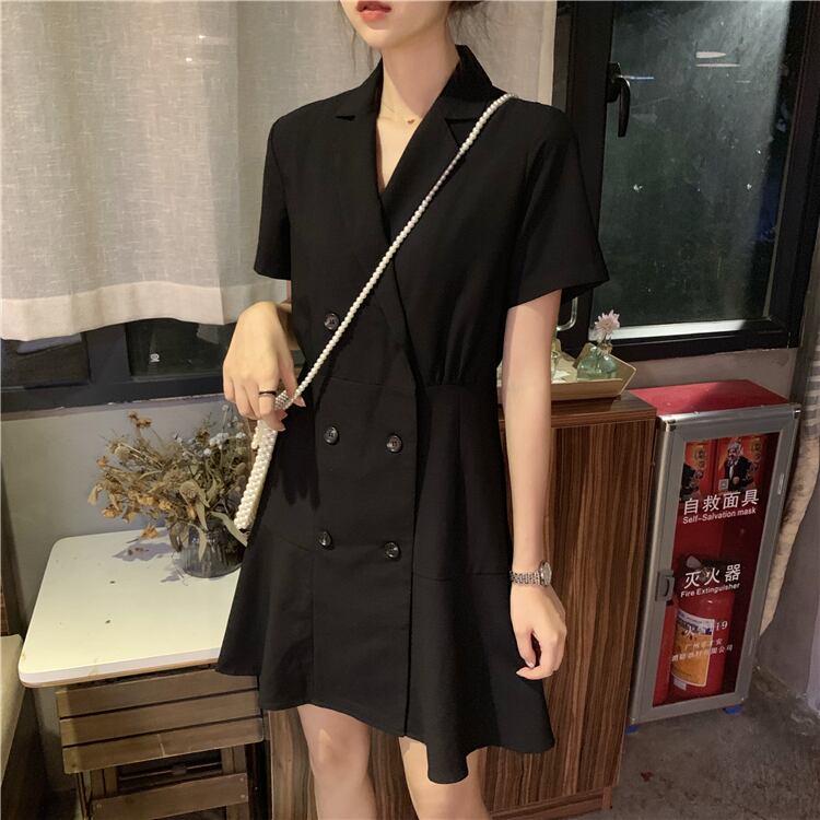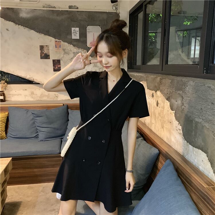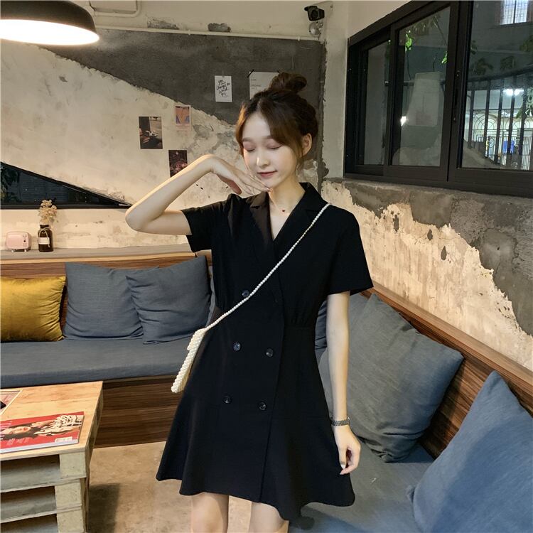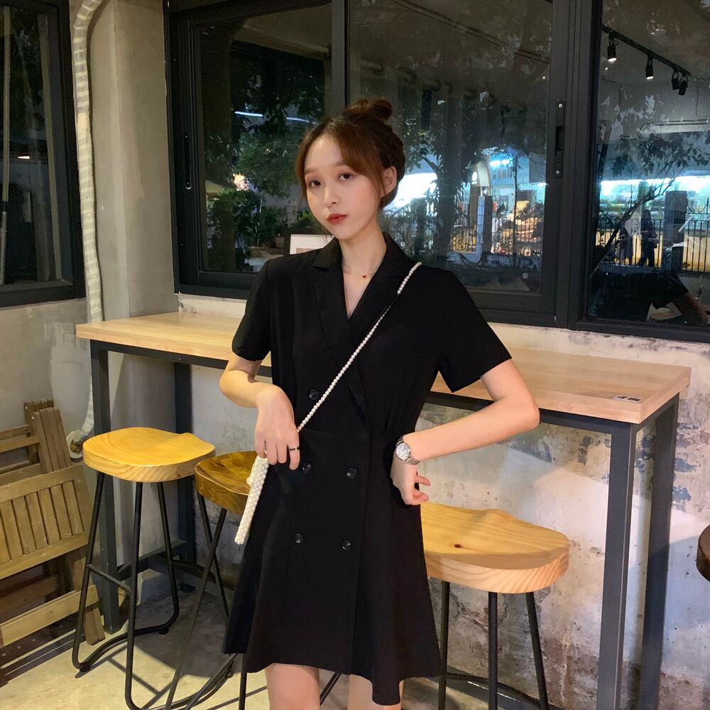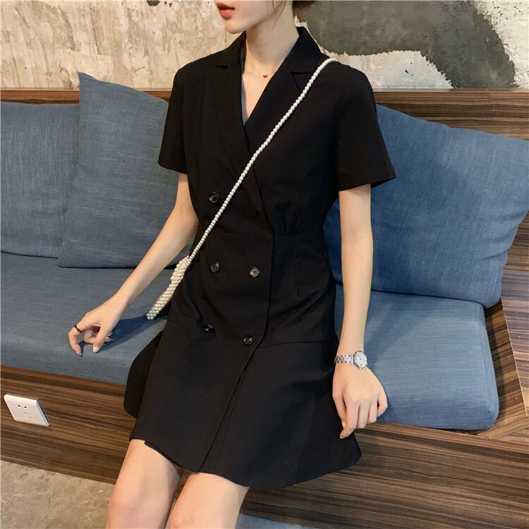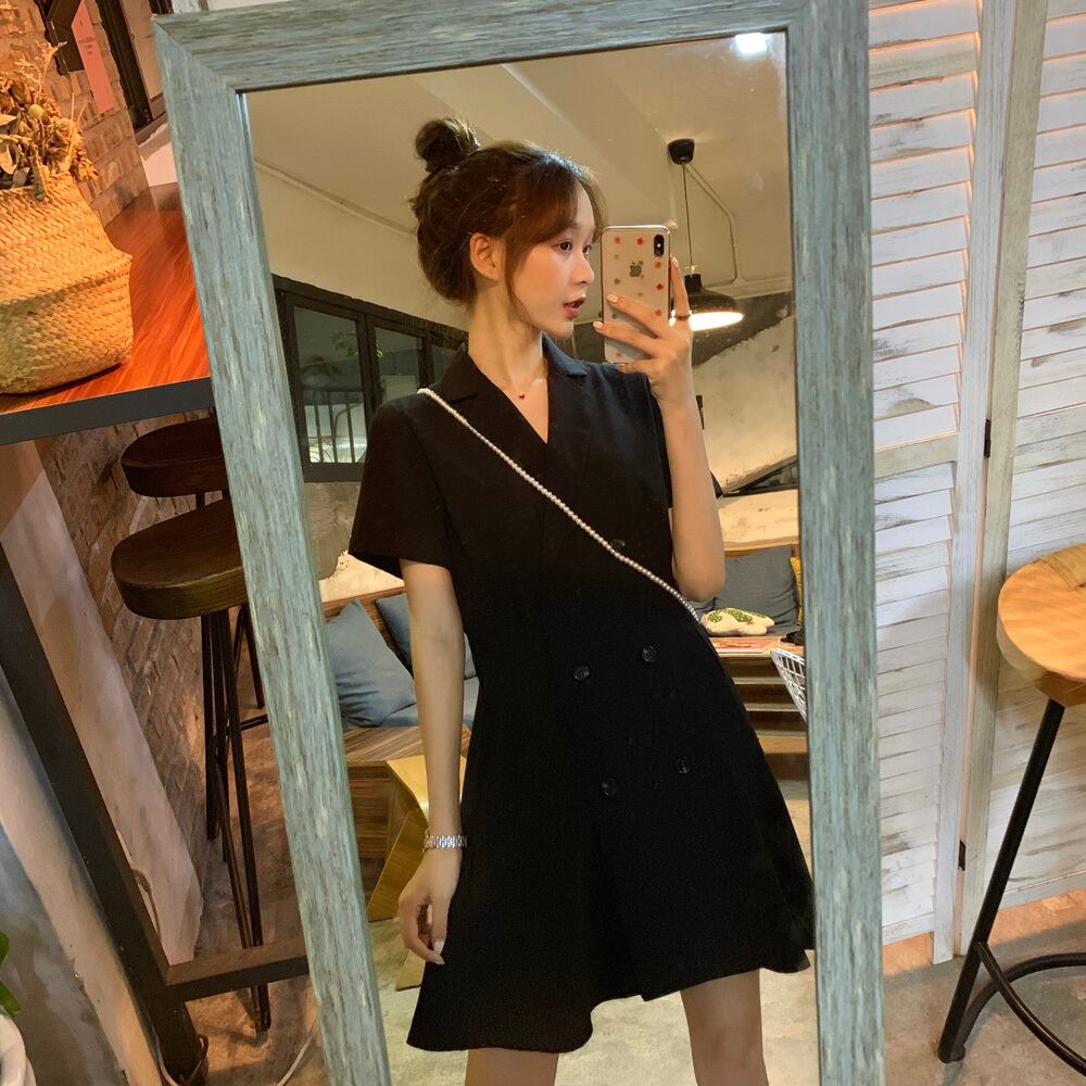 小さな黒いスーツの短いスカートのウエストの夏の新しいバージョンは、薄いVネックの気質の半袖ドレスの女性の潮でした YY-ファッション72465345650
