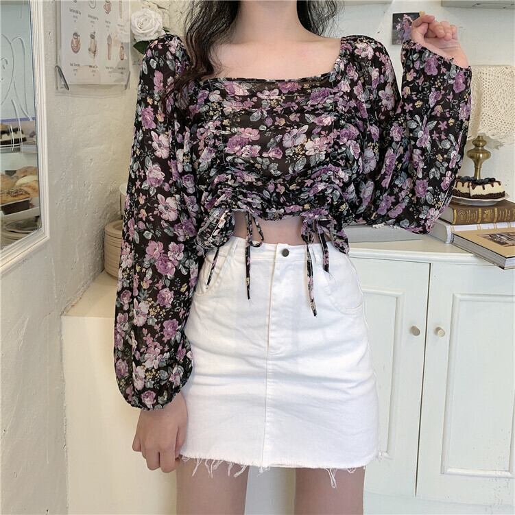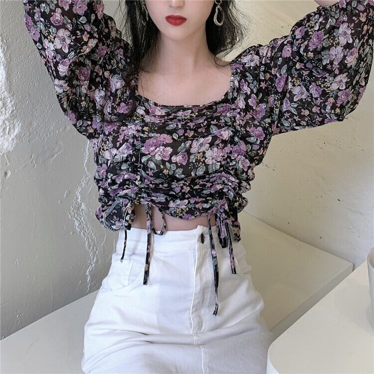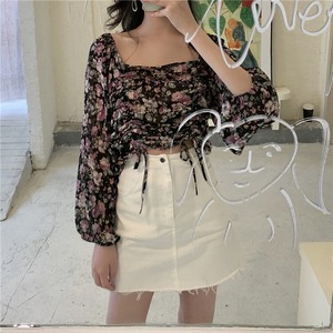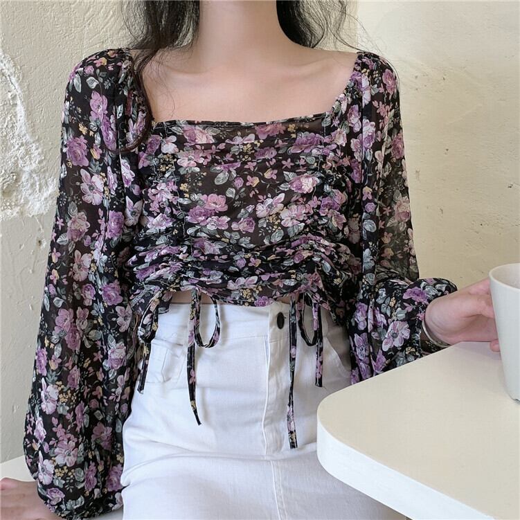 2020年冬の新しいレトロなスクエアネックフローラルシフォンシャツ女子学生のeignスタイル巾着スウィートショートトップ YY-ファッション29694744887