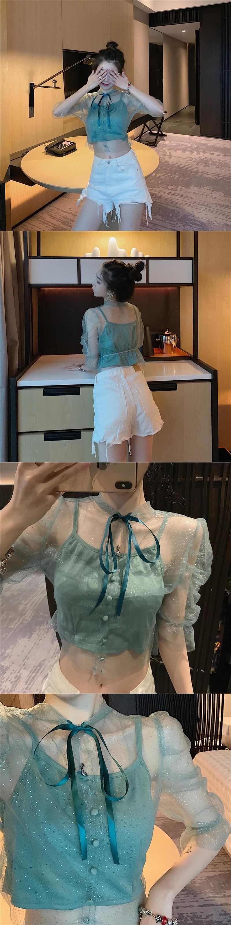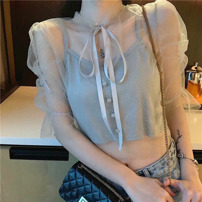 非常に妖精のフレンチニッチレース蝶結び気質メッシュトップ+伸縮性キャミソールファッションスーツトレンド YY-ファッション60785490390