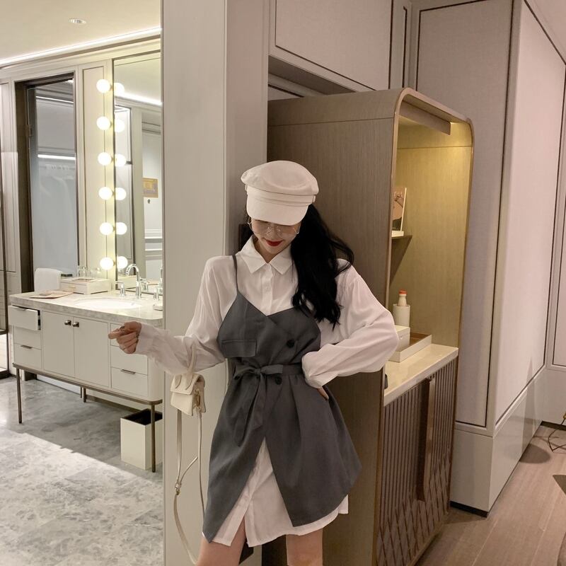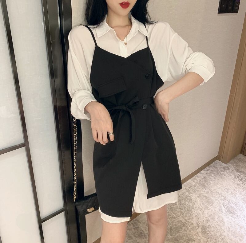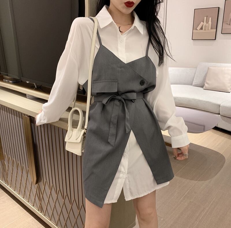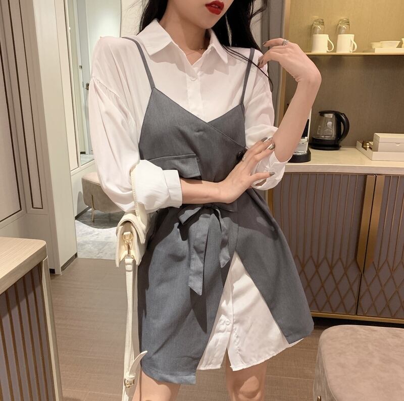 スタイルシンプルで用途の広いミドル丈シャツ+不規則なレースのVネックサスペンダースカートツーピースファッションスーツ女性 YY-ファッション34666250125
