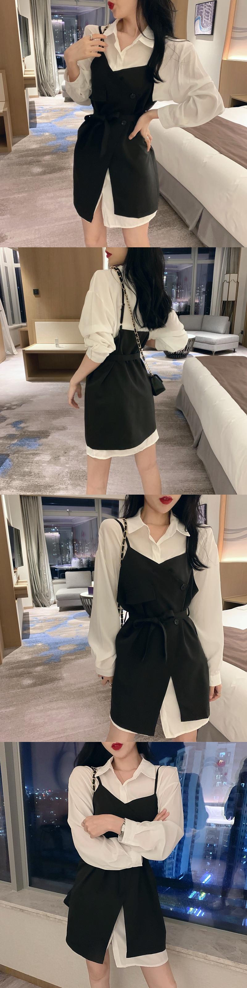 色:白のシャツ,ブラックサスペンダースカート,グレーのドレス