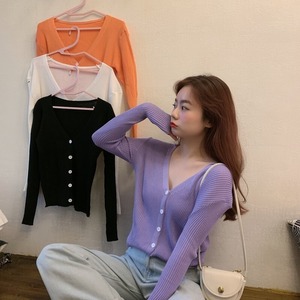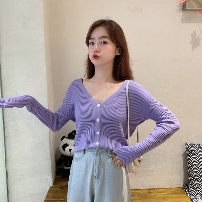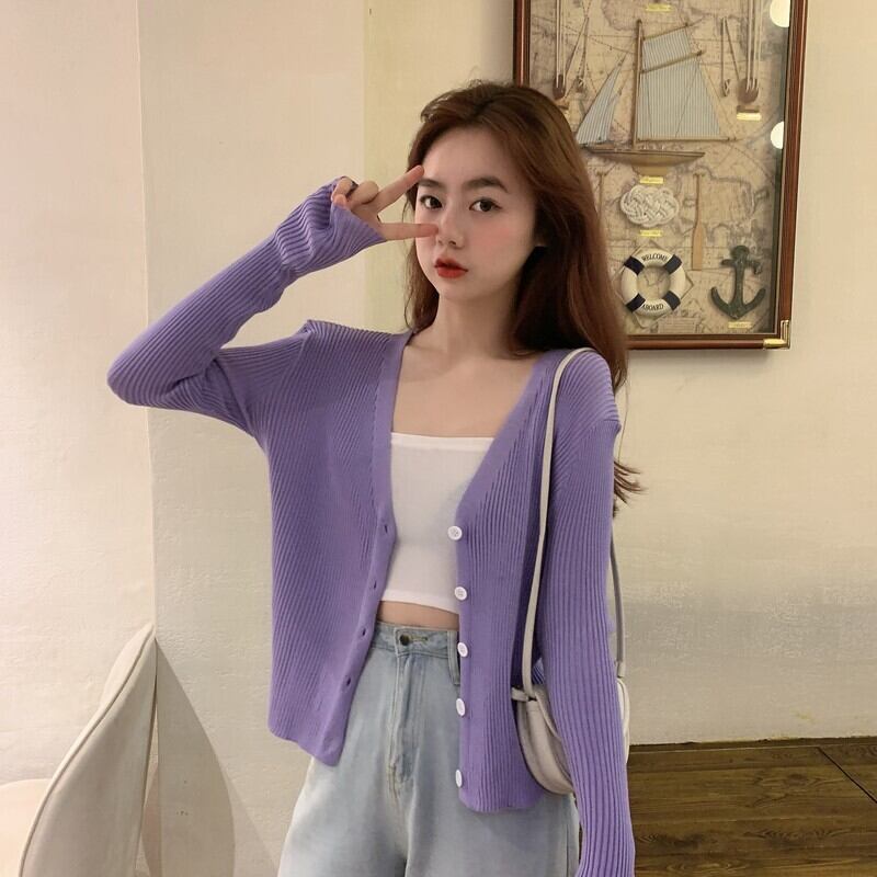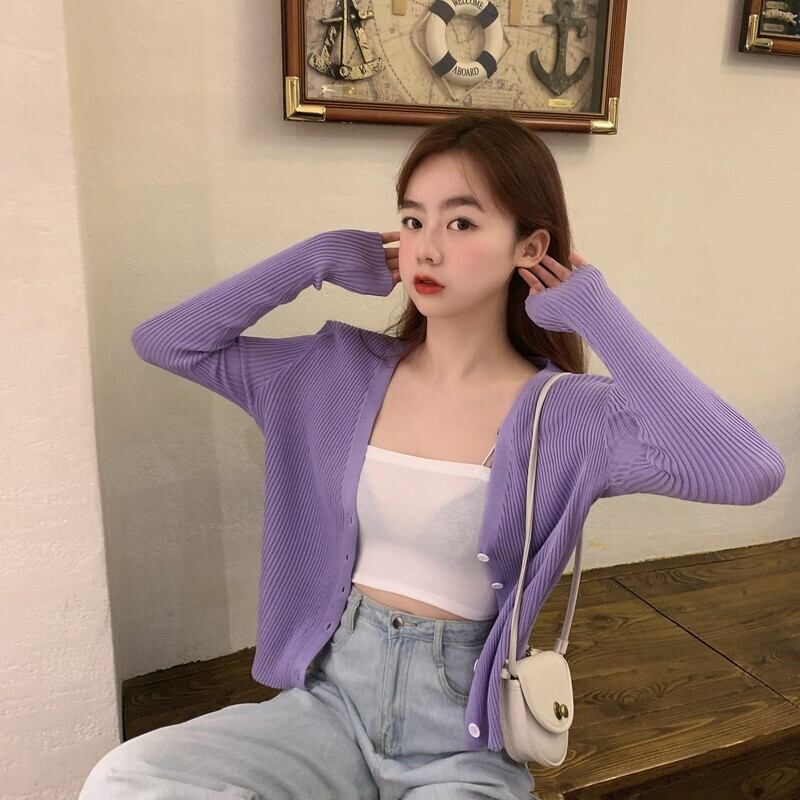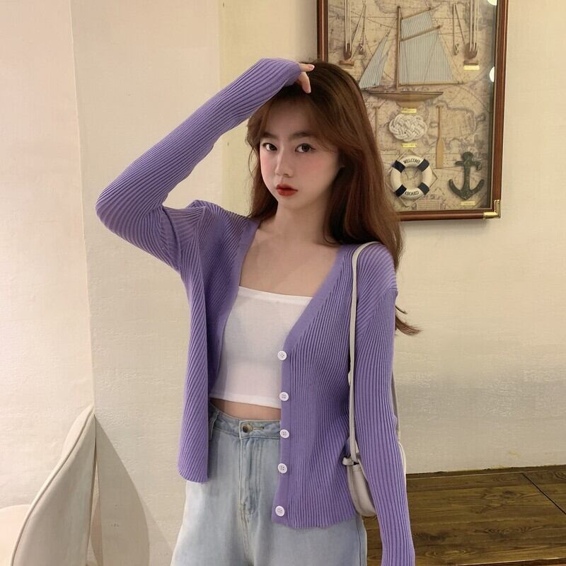 紫の薄いVネックカーディガンセーターコート女性の2020年春の新しいルーズ長袖トップボトミングシャツ YY-ファッション96816393496