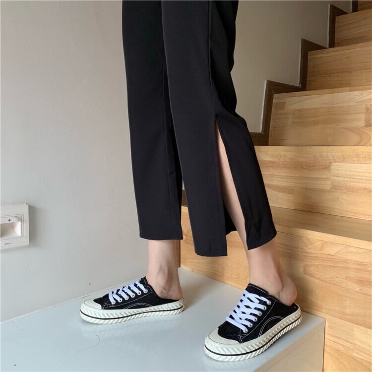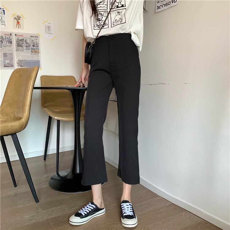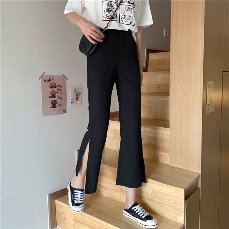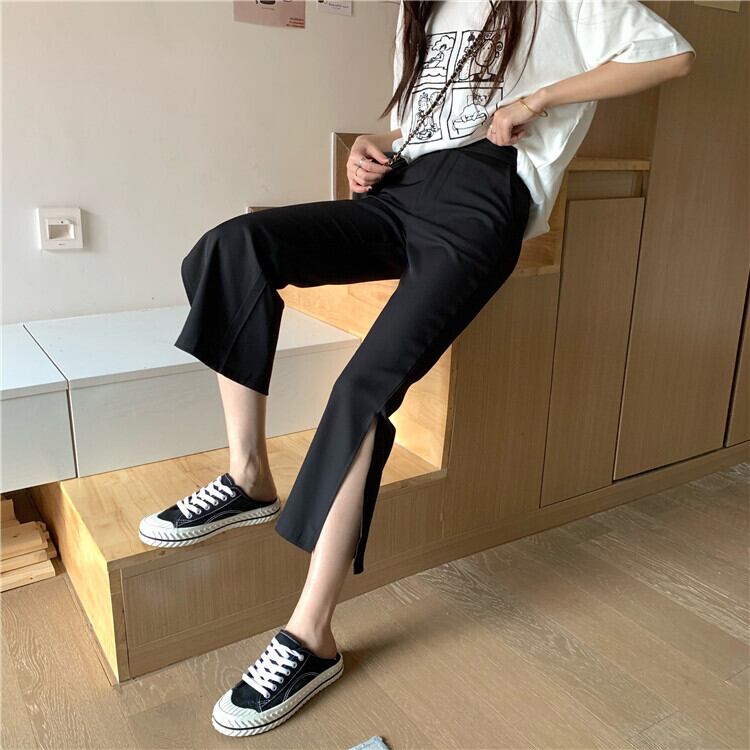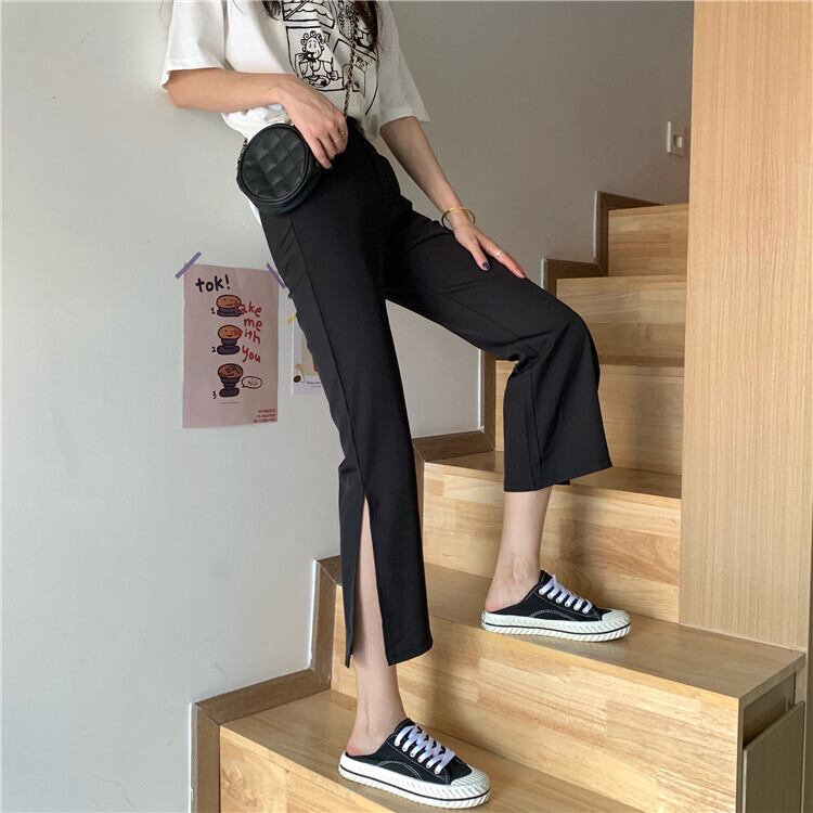 2020年秋冬新バージョンのブラックスリットハイウエストカジュアルパンツレディースシンオールマッチストレートレッグパンツ9点ベルボトムパンツ YY-ファッション95247754635