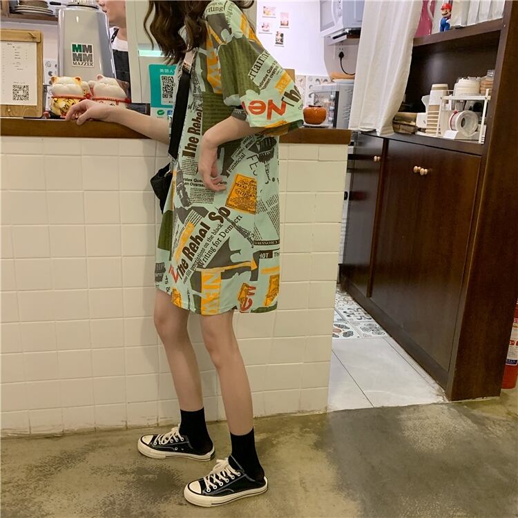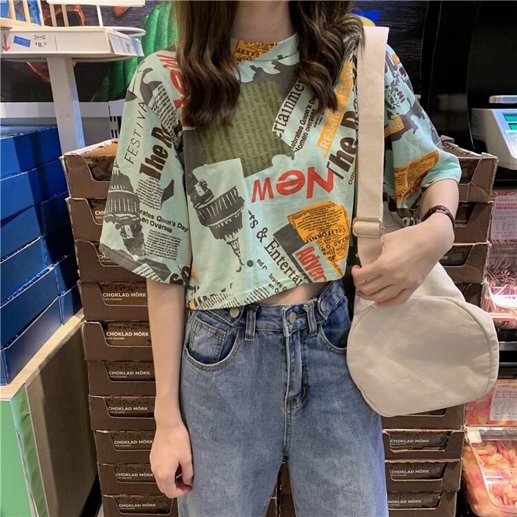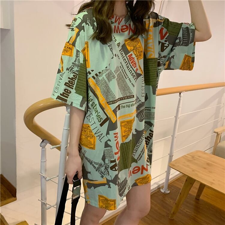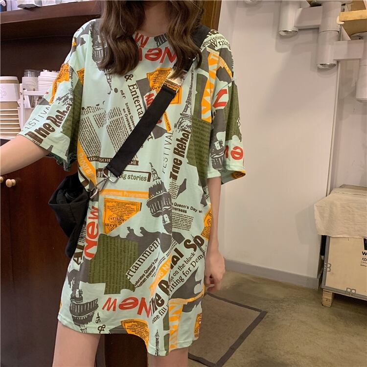 2020年秋冬の新しい女性香港フレーバールーズパーソナリティ新聞印刷ショートスタイル+ロングスタイルカジュアルスリムTシャツ女性トレンド YY-ファッション13318743450